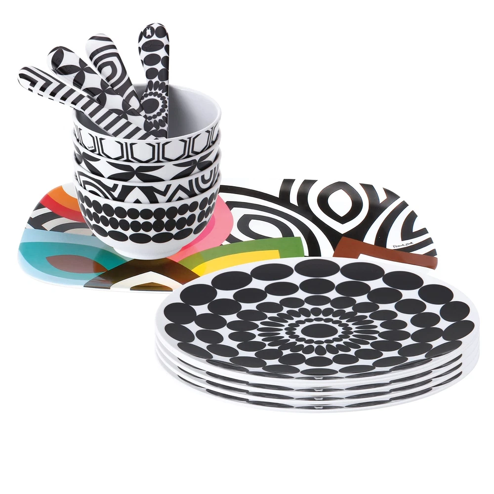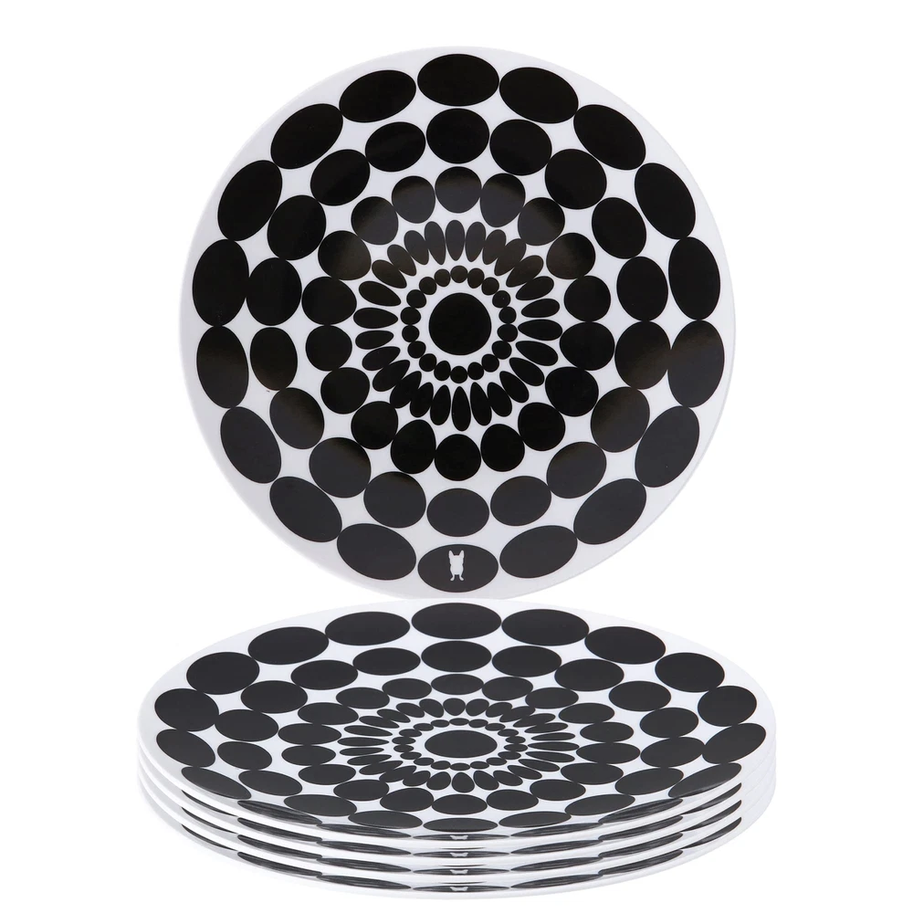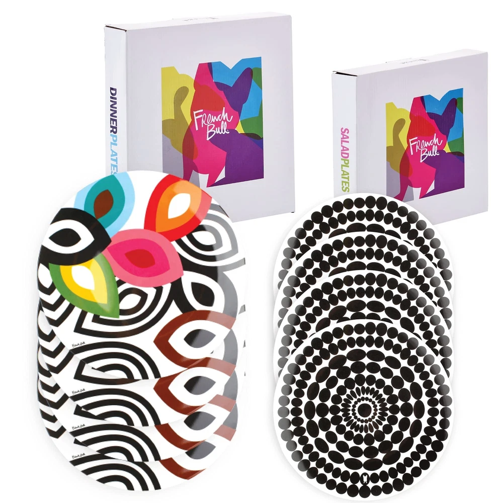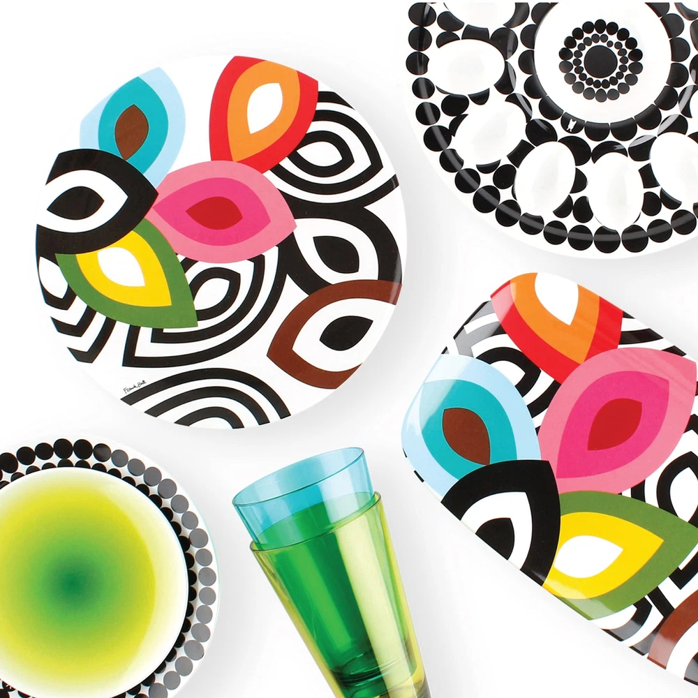 's modern melamine plates make a splash in any setting. 's high-glazed 9 inch colorful salad plates set is great for the home or as a gift. The scratch and shatter resistant dishes are easy to clean since they're dishwasher safe, and to 356-degree F, 180-degree C. The durability and functionality of the material is perfect for indoor or outdoor entertaining. - reinterpreting everyday staples with a fresh, modern spin. Our high quality heavy weight 9 inch melamine salad plates are perfect for everyday dining and for entertaining. Perfect for indoor and outdoor use melamine is great for BBQs summer fun entertaining fiesta and parties of all kinds very kid friendly will not chip or crack easily. Our 9 inch plates are perfectly sized for salad, sides, lunch, and snacks. Dishwasher safe glazed melamine BPA-free scratch and shatter resistant and kid-friendly. designs are created by Jackie Shapiro - iconoclast designer based in New York City. Explore mixing and matching other patterns to create your personal collection.