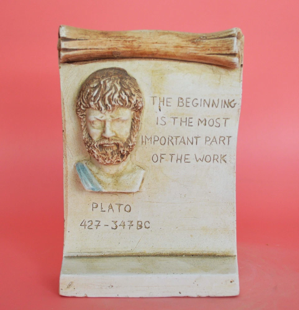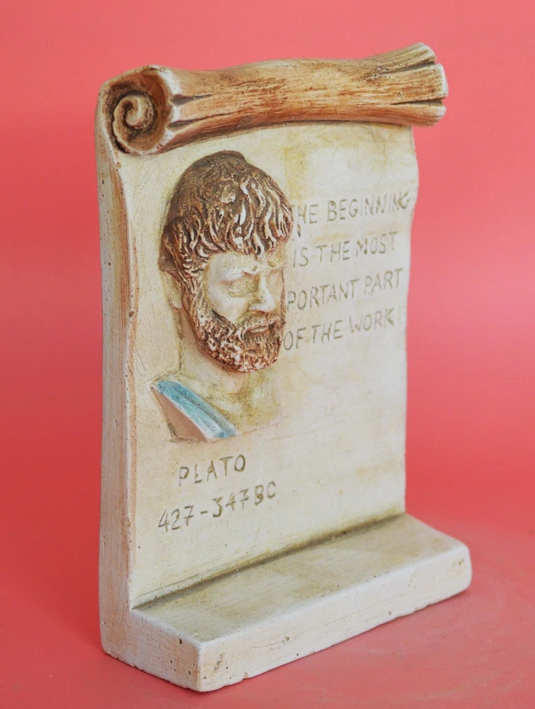 PLATO RELIEF WITH QUOTE Plato was a philosopher in Classical Greece. He was also a mathematician, student of Socrates, writer of philosophical dialogues, and founder of the Academy in Athens, the first institution of higher learning in the Western world. Along with his mentor, Socrates, and his student, Aristotle, Plato helped to lay the foundations of Western philosophy and science. Plato's sophistication as a writer is evident in his Socratic dialogues, thirty-six dialogues and thirteen letters have been ascribed to him. Plato's writings have been published in several fashions, this has led to several conventions regarding the naming and referencing of Plato's texts. Plato's dialogues have been used to teach a range of subjects, including philosophy, logic, ethics, rhetoric, and mathematics. Plato is one of the most important founding figures in Western philosophy. Please be aware that, due to the fact that our products are either individually cast, carved, hand painted and hand finished, there will inevitably be minor variations in size, colour and texture.(B81) Details: Condition: New, Handmade in Greece Material: Casting stone Height: 13 cm(5.1 inches) Width : 9 cm(3.5 inches) Weight : 260 g