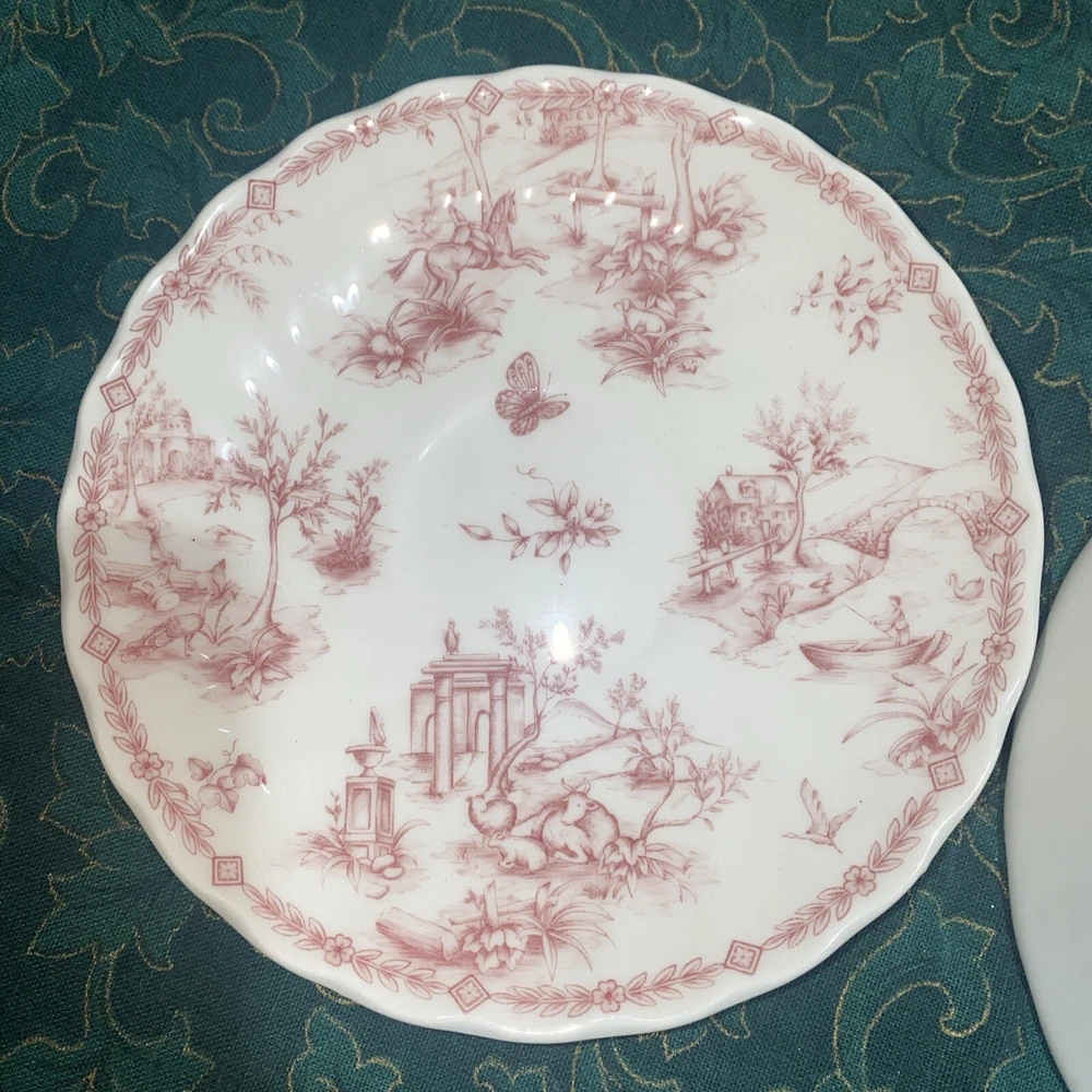 Elevate your dinner setting with this beautiful 5 piece Queens Chelsea Toile Pink White Dinner Plate set. The classic swirl pattern and elegant pink and white color combination make it suitable for all occasions. Made of high-quality ceramic, this plate set includes a dinner plate, soup bowl, sauce plate, bread plate, and cereal bowl. The Queens Chelsea Toile Pink White Dinner Plate set is part of the Queens product line and is a vintage collection that was produced in Colombia in the 1990s. These plates were studio crafted with an earthenware production style and feature a classic theme. Whether you're hosting a dinner party or looking to add some charm to your table setting, this set is a must-have.