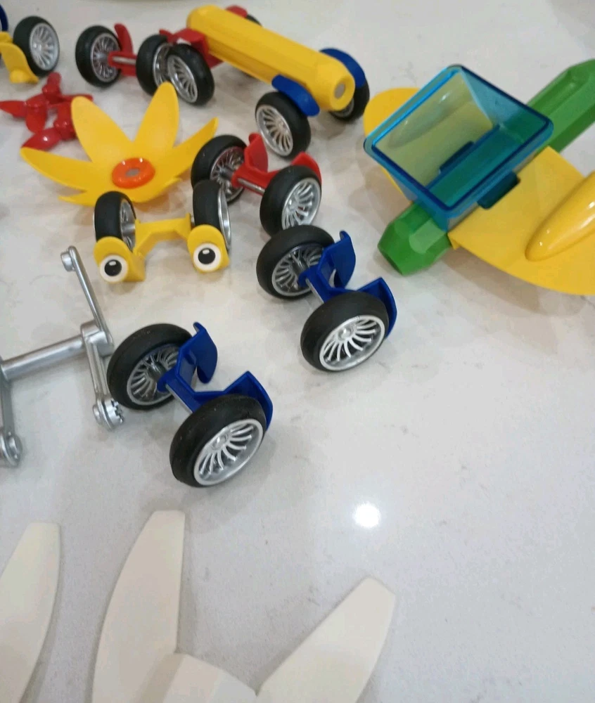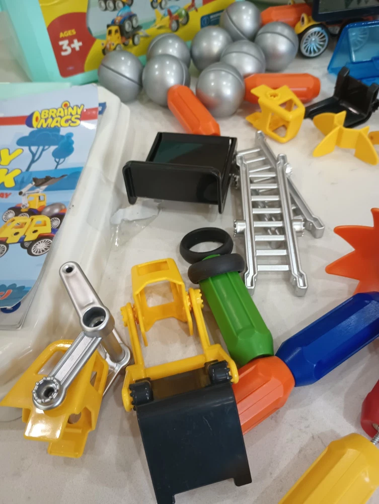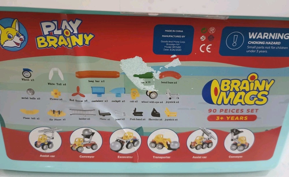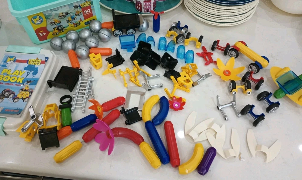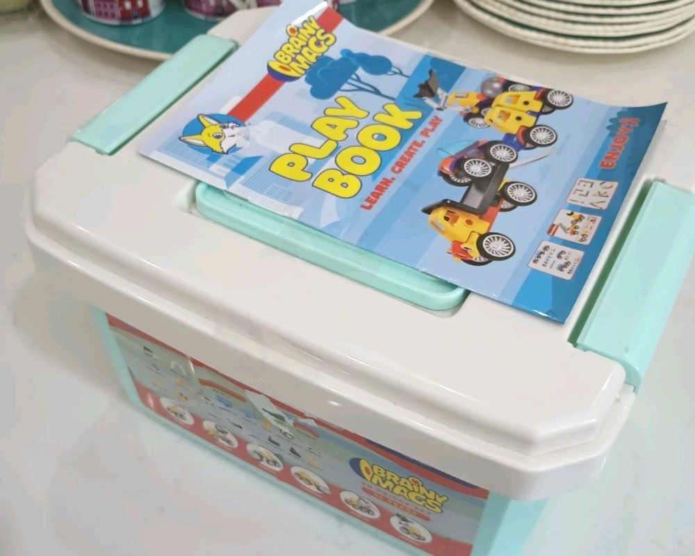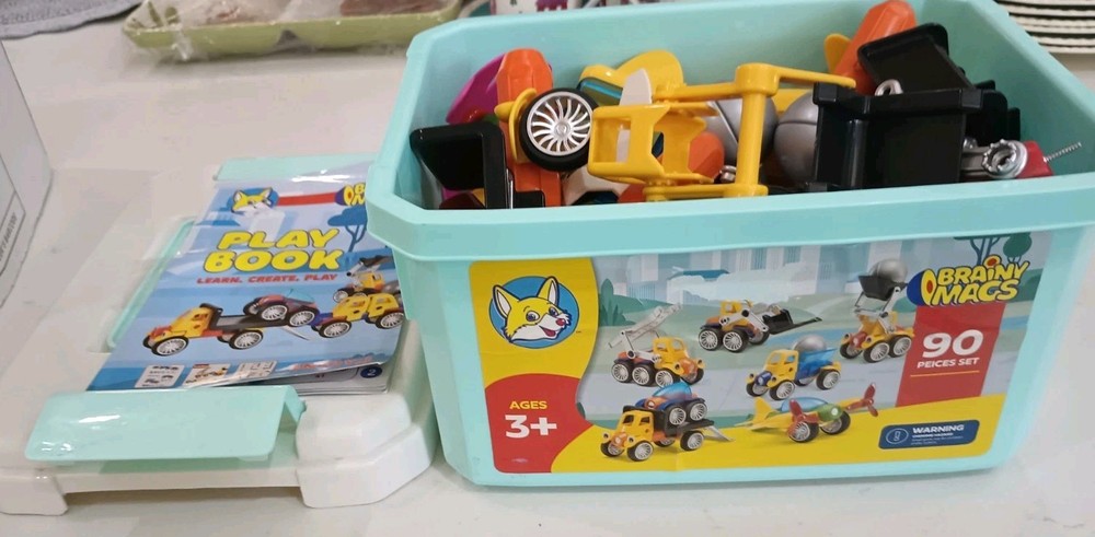 BIG 90 pieces BRAINY MAGS by Play Brainy is loaded with plastic/magnetic pieces that can be made into as many things as a brain can conceive! Used, in excellent condition, with the Play Book that shows pictures of possible things to create, this comes in a plastic locking tub with a carry handle. Wonderful bucket of creative play for all ages, recommended for 3 and up to prevent choking. This can make a great gift, a bucket of fun for your own home, to pack up for travel, and special time for all little people and all ages! Shipping is INCLUDED in the price. Discounted to find the right person or people who appreciate a big 90 pieces of brainy mags! I have 100% excellent feedback, ship daily, and will be happy to get these out to you immediately. AL20
