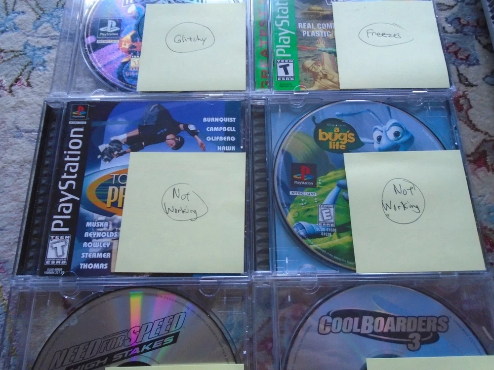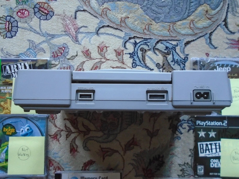 Video game accessories bundle includes: Lot of PS1 console, memory card, and several game discs. The items are NOT WORKING PROPERLY, FOR PARTS OR REPAIR - read below for details Functionality and Cosmetic Condition: The PS1 console turns on, and it will read discs, BUT the spindle is loose and keeps coming out when you remove discs (see photos). The memory card does not work. The games were tested on another PS1 console. Road Rash works, but it glitchy. Army Men 3D freezes. The rest of the games do not work. There are lots of scratches on the discs. Everything is for parts, repair, or repurpose. The photos are of the actual items being sold. We only accept returns if the items were not described correctly. Thank you for viewing our auction and good luck bidding!