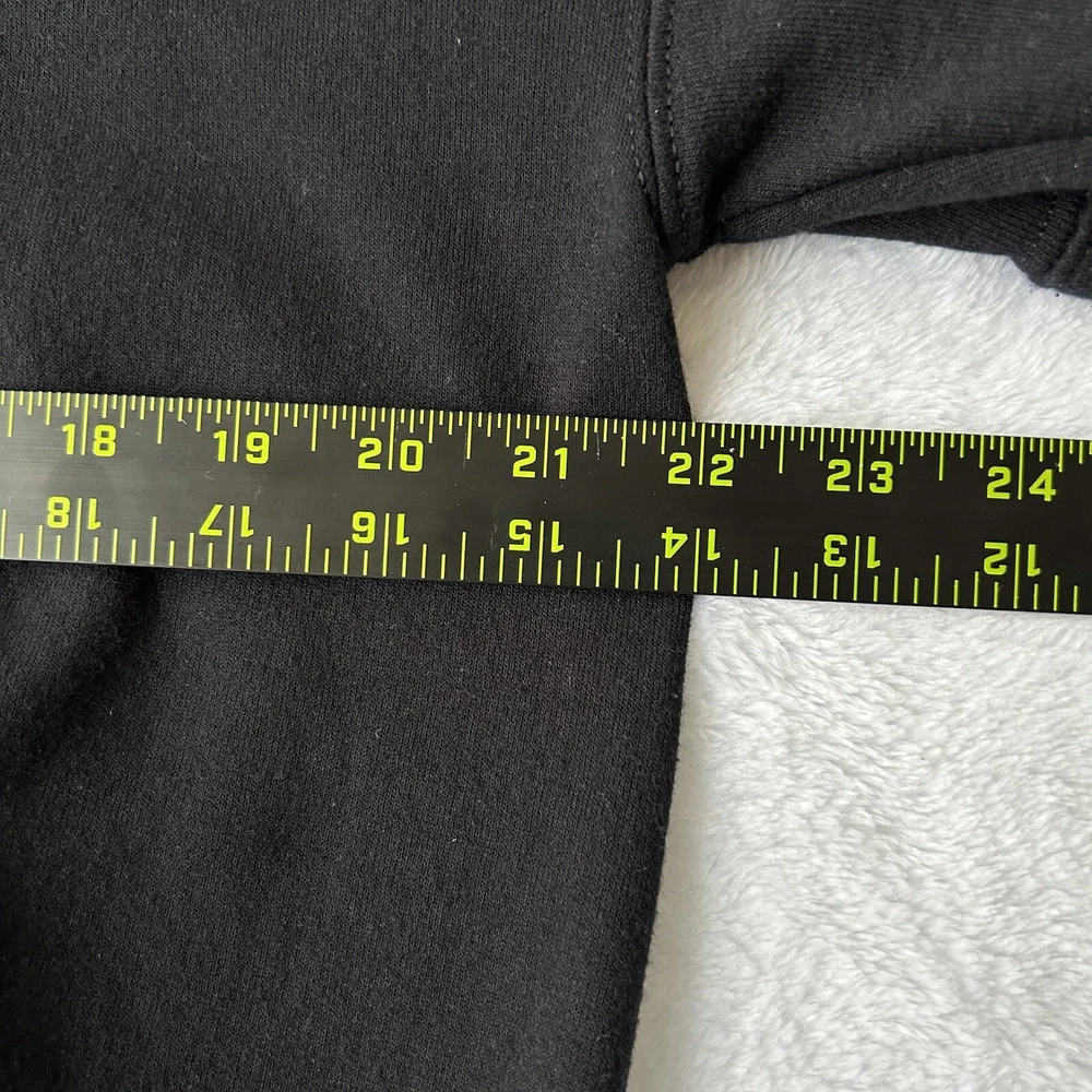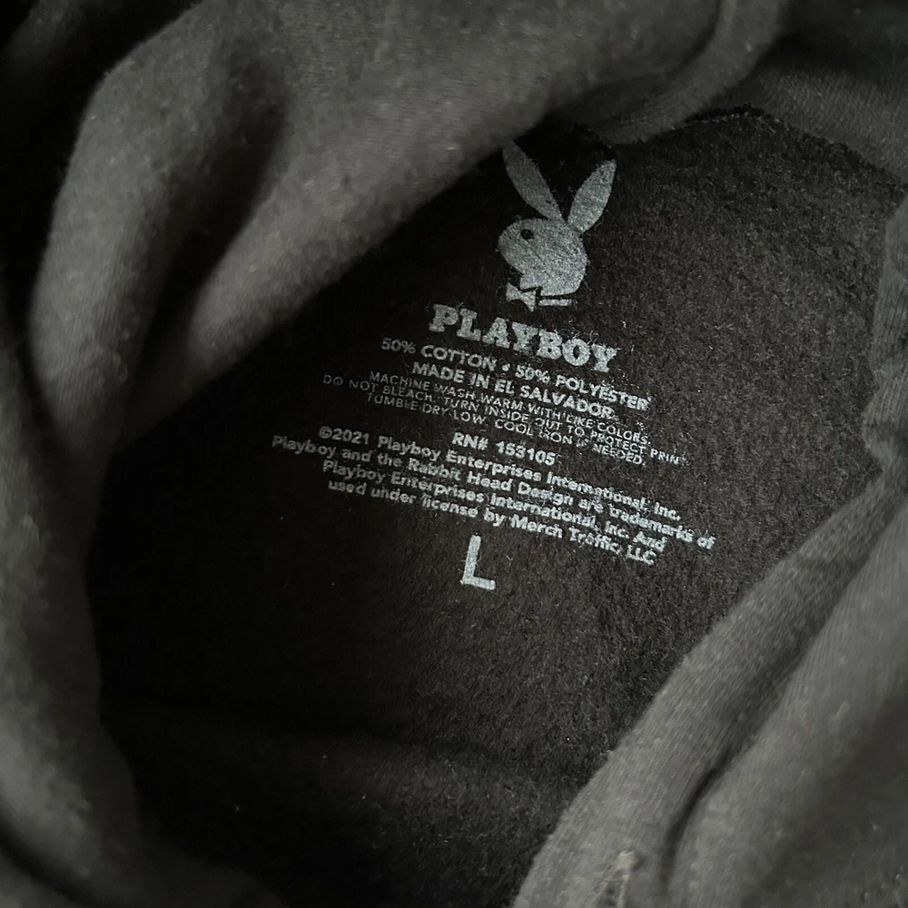 This is a stylish and comfortable Playboy hoodie in black, perfect for activewear or casual wear. It features a drawstring front for an adjustable fit and convenient pockets for storage. The long sleeves are great for cooler weather, and the solid pattern and large Playboy logo add a touch of flair. Made from high-quality cotton and with no signs of wear and tear, this hoodie is perfect for anyone who values both style and comfort. The size L hoodie is designed for women and is a regular fit. The brand is well-known and trusted, ensuring a quality product.