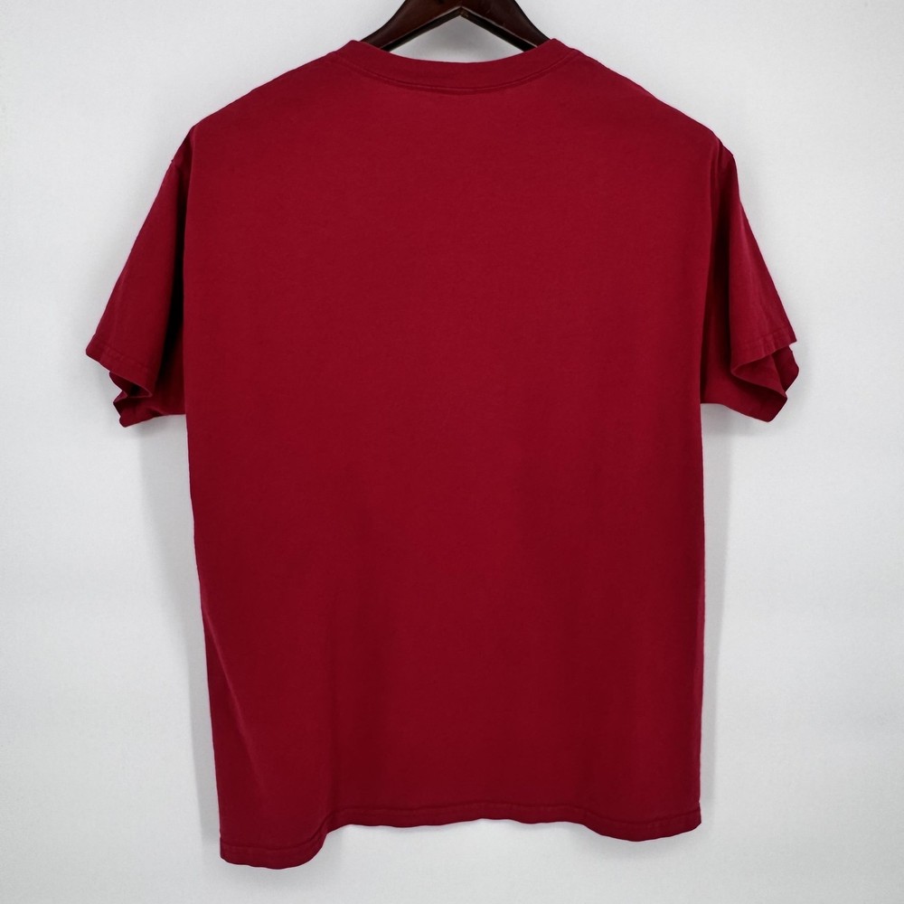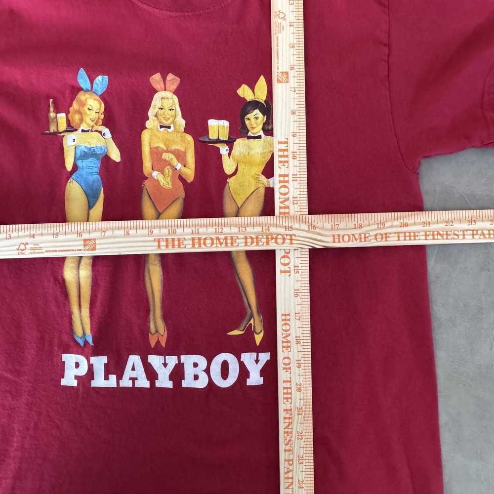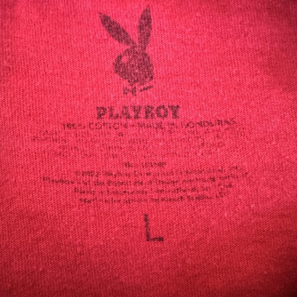 Brand: Playboy Style: Mens short sleeve graphic shirt featuring three classic Playboy bunny servers on the front above a bold PLAYBOY wordmark. Color: Deep red body with multicolor bunny illustration and white logo print. Size on tag: Mens Large; regular fit. Material: 100% cotton knit fabric for soft, breathable all-season wear. Features: Crew neck, short sleeves, straight hem, large front Playboy bunnies bar-service graphic, tagless printed neck label with Playboy bunny logo. Country of origin: Made in Honduras.