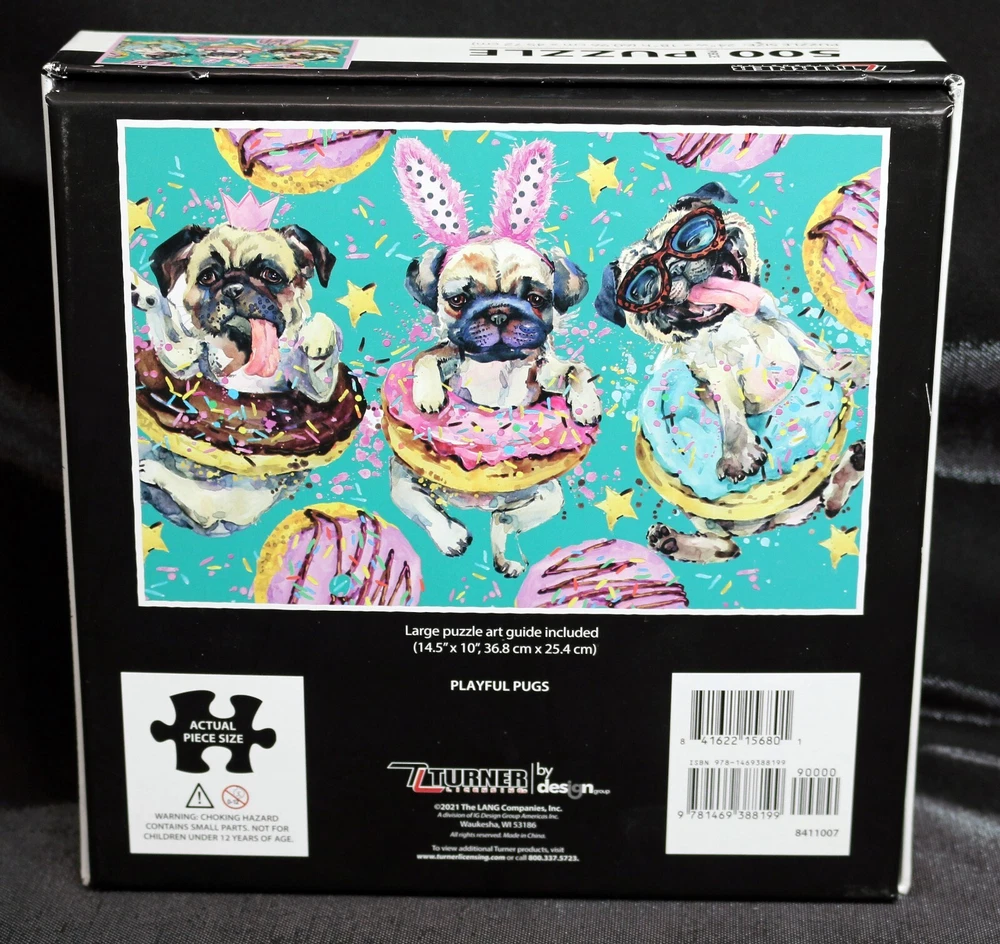 Challenge your mind with this Playful Pugs 500 piece jigsaw puzzle, featuring adorable and colorful pug dogs. This puzzle is perfect for puzzle enthusiasts of all ages, with interlocking pieces that are bagged and a reference poster included. The puzzle measures 24" x 18" once completed, and is made from durable cardboard material. The puzzle is manufactured in China by Turner Licensing, and is recommended for ages 10+. It is a great addition to any collection, and is perfect for family fun or solo relaxation. Get ready to put your puzzle-solving skills to the test with this fun and challenging puzzle. Doing puzzles has some hidden benefits Excellent qualities: Cultivate concentration, patience, and temper your will Movement development: Train hand-eye coordination and precise small movements Spatial intelligence: Improve visual discrimination of colors and shapes Critical thinking ability: Understand the relationship between parts and the whole, and draw inferences from one example to explore the future Relaxes your mind: Relieve work pressure and release yourself Brain development: Enhance memory and may help prevent or slow brain degeneration Anticipated Benefits of Puzzles for Children Overcoming attention deficit Strengthening visual memory Improving problem-solving skills Strengthening hand-eye coordination Improve fine motor skills Improve gross motor skills Shape recognition ability Gain the ability to set goals Learning patience Puzzle pieces are all bagged. Each item we ship is carefully packaged to prevent any damage and is shipped immediately with tracking.