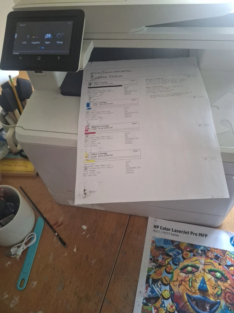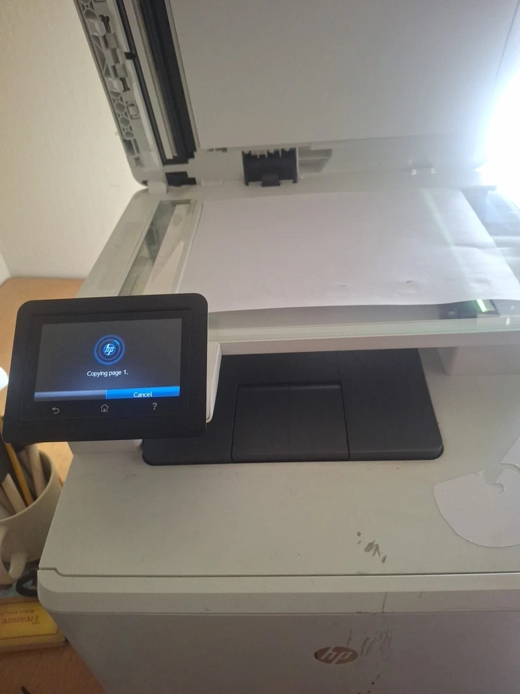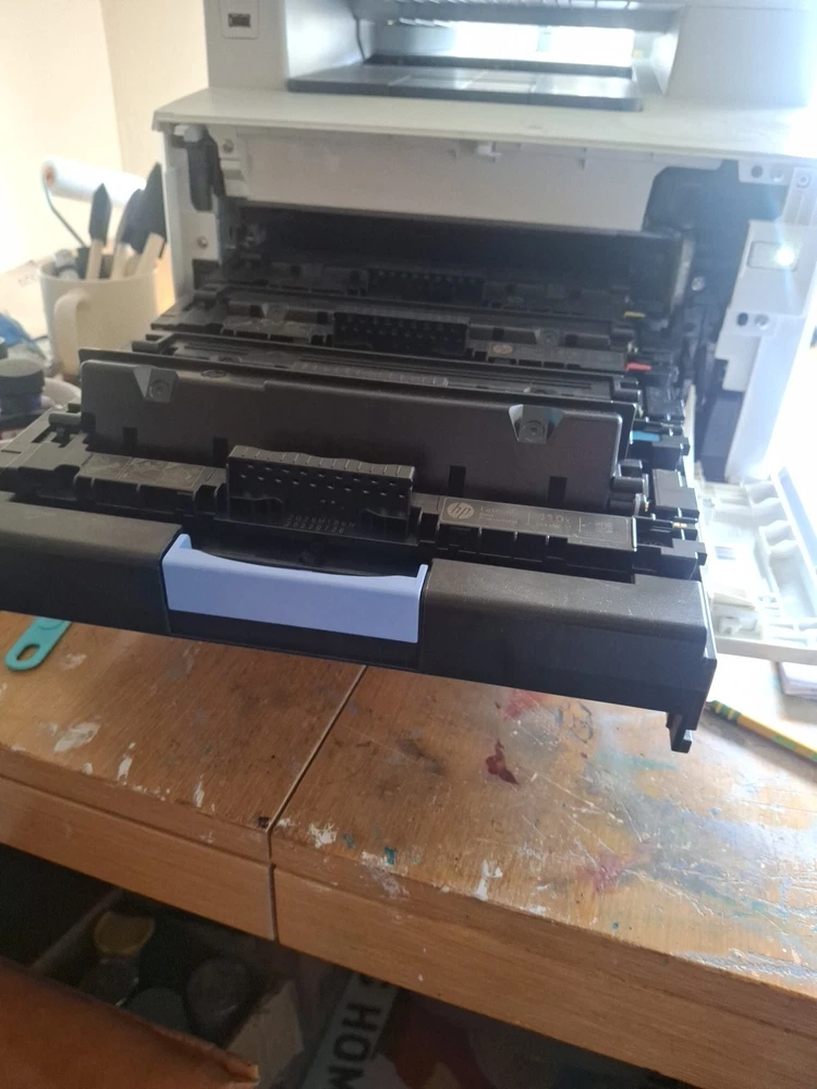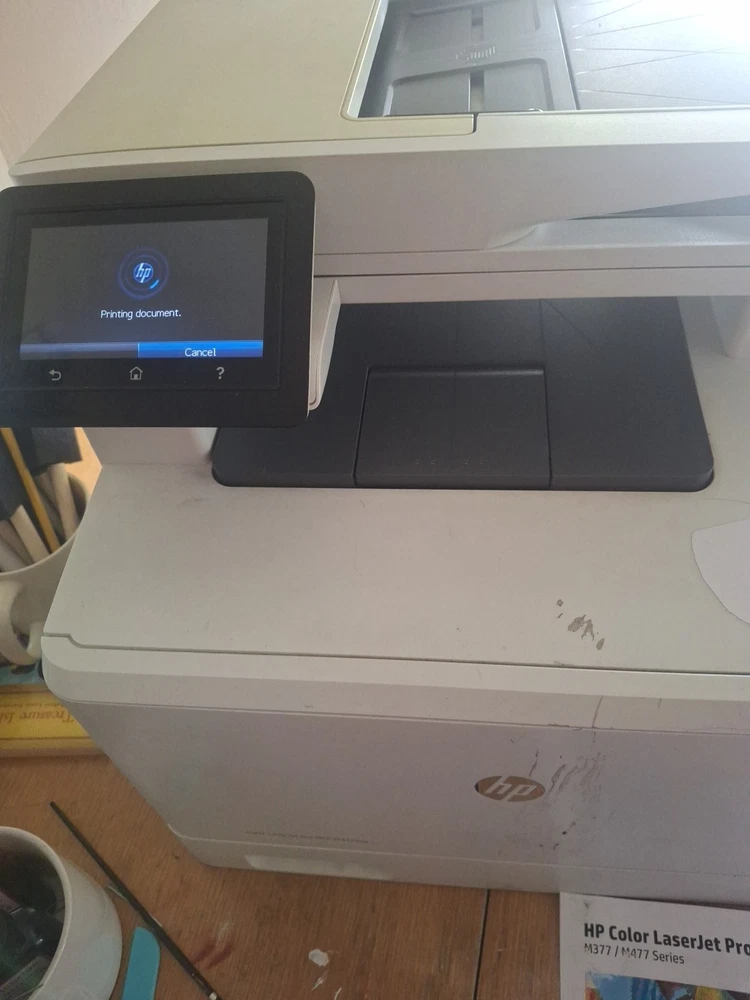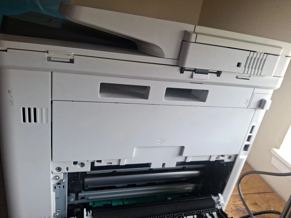 I am offering below margin price, this printer powers on, connects to wifi, reads usb/sd, prints, copies I have not triedfaxing, but pretty much all systems are go. The only issue is when it prints there's a need for print head cleaning or replacement parts, Google image says it's most likely a fuser. The printer will print the image, but along the edges or bottom there are smudge marks or other obvious marks indicating maintenance. HP LaserJet Pro M477FNW All-In-One Laser Printer is a high-resolution color printer that offers fast printing speeds of up to 28 ppm in black. With a maximum resolution of 1200 x 1200 DPI, this printer ensures professional-quality documents and images. It features wireless connectivity options and a built-in scanner, copier, and fax, making it a versatile all-in-one solution for home or office use. The printer also has a 512 MB memory and supports various paper sizes including A4 and A5. Additionally, it comes networkable for convenient sharing on a network.