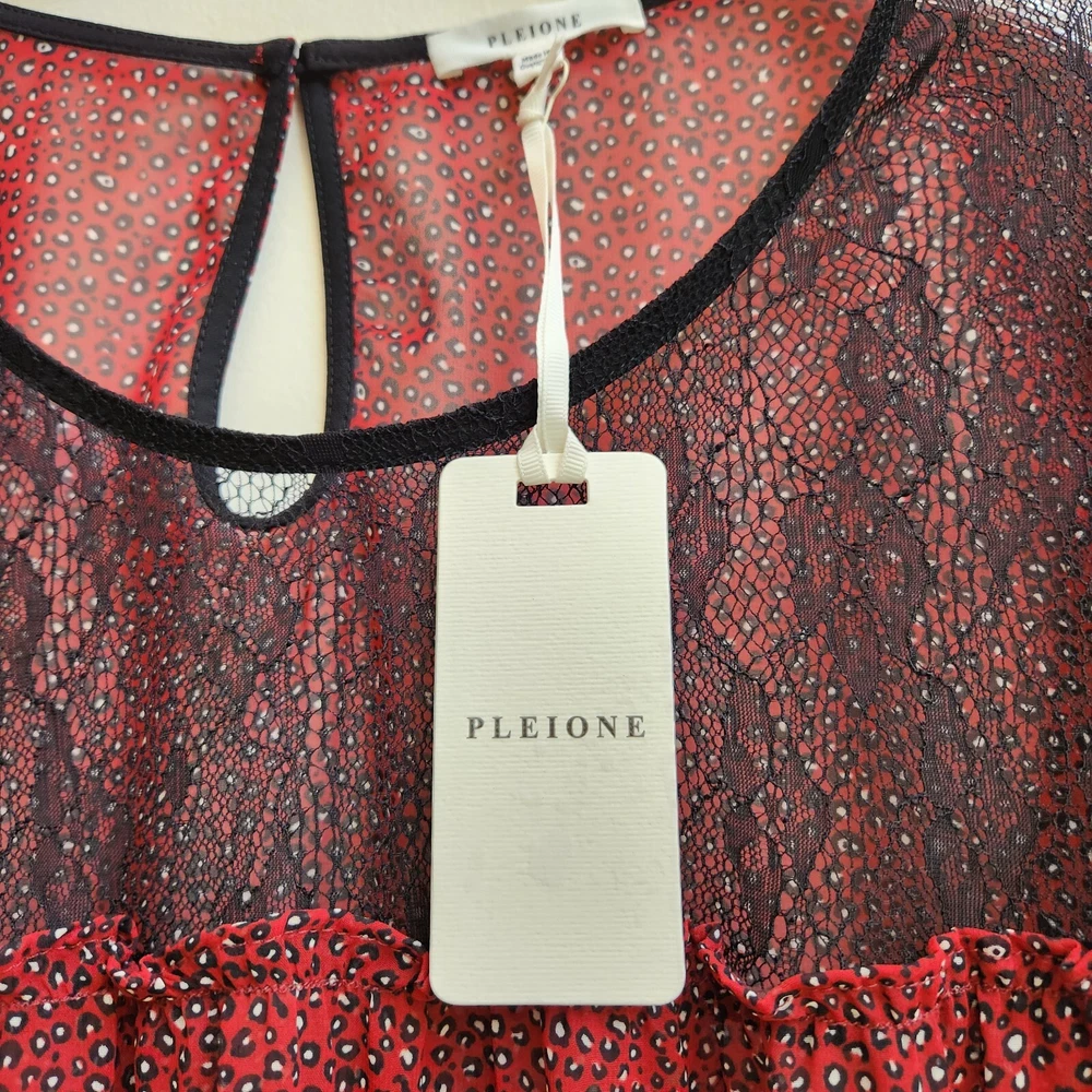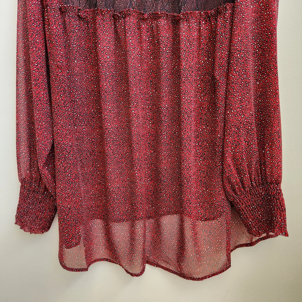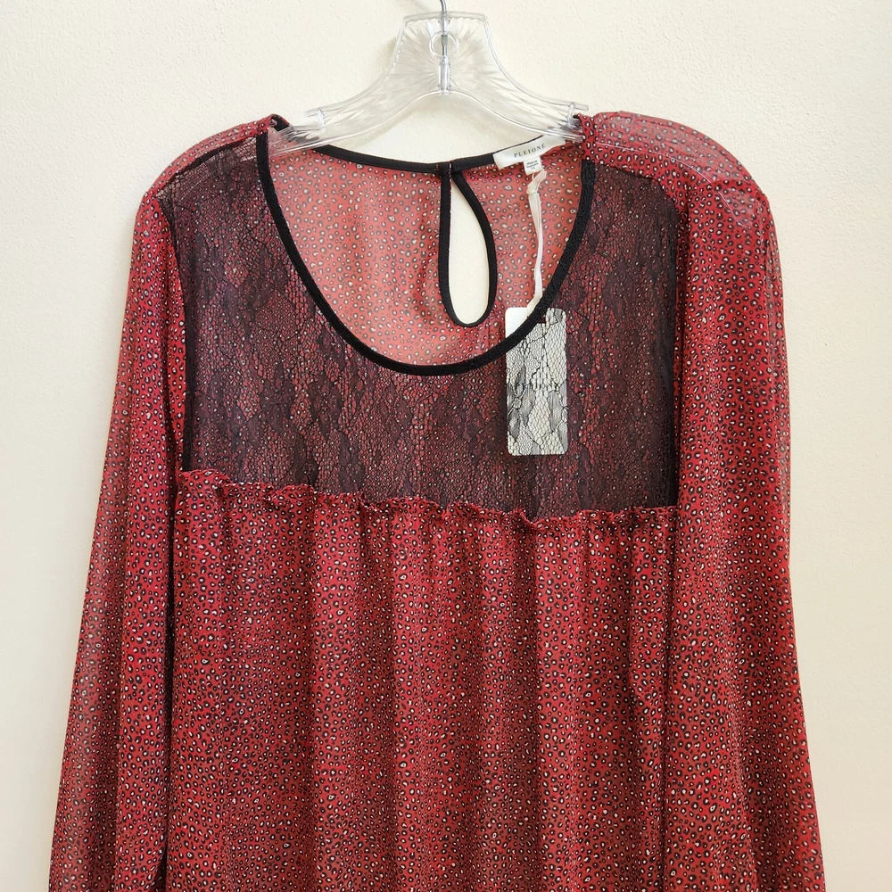 Pleione Top Womens 1X Red Black Lace Sheer Long Sleeve Blouse Boho Paw Print - NEW with Tags - Measurements in Photos - Returns acceptable within 30 days of purchase unworn, with tags attached, in original condition - Check out my E-bay Store. Lots of Choices Available. Reduced shipping for 2 or more items. Let me know before you pay so I can send you an invoice to discount the shipping