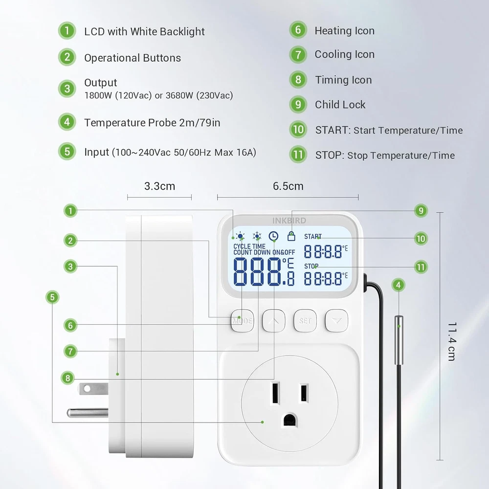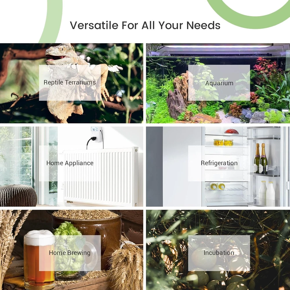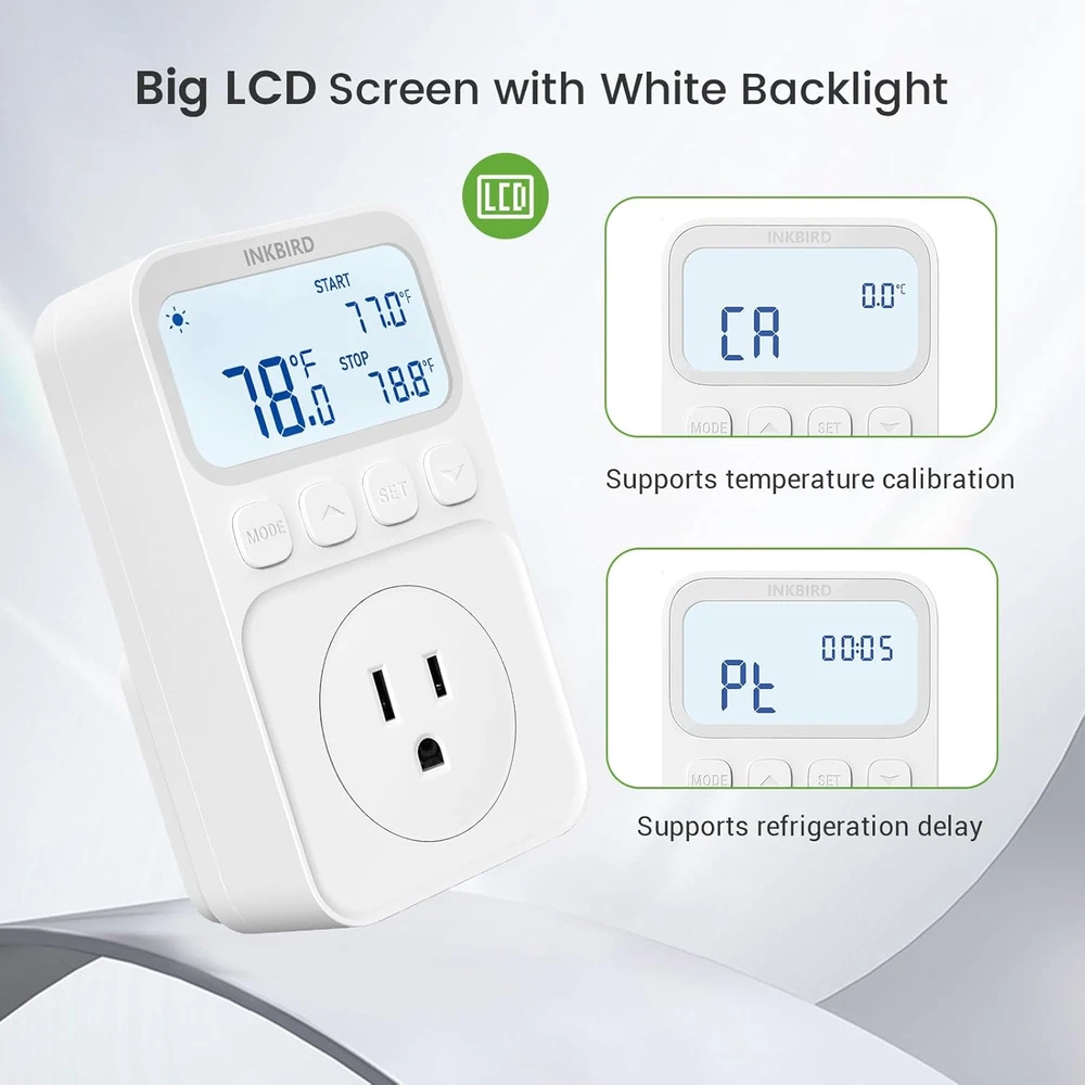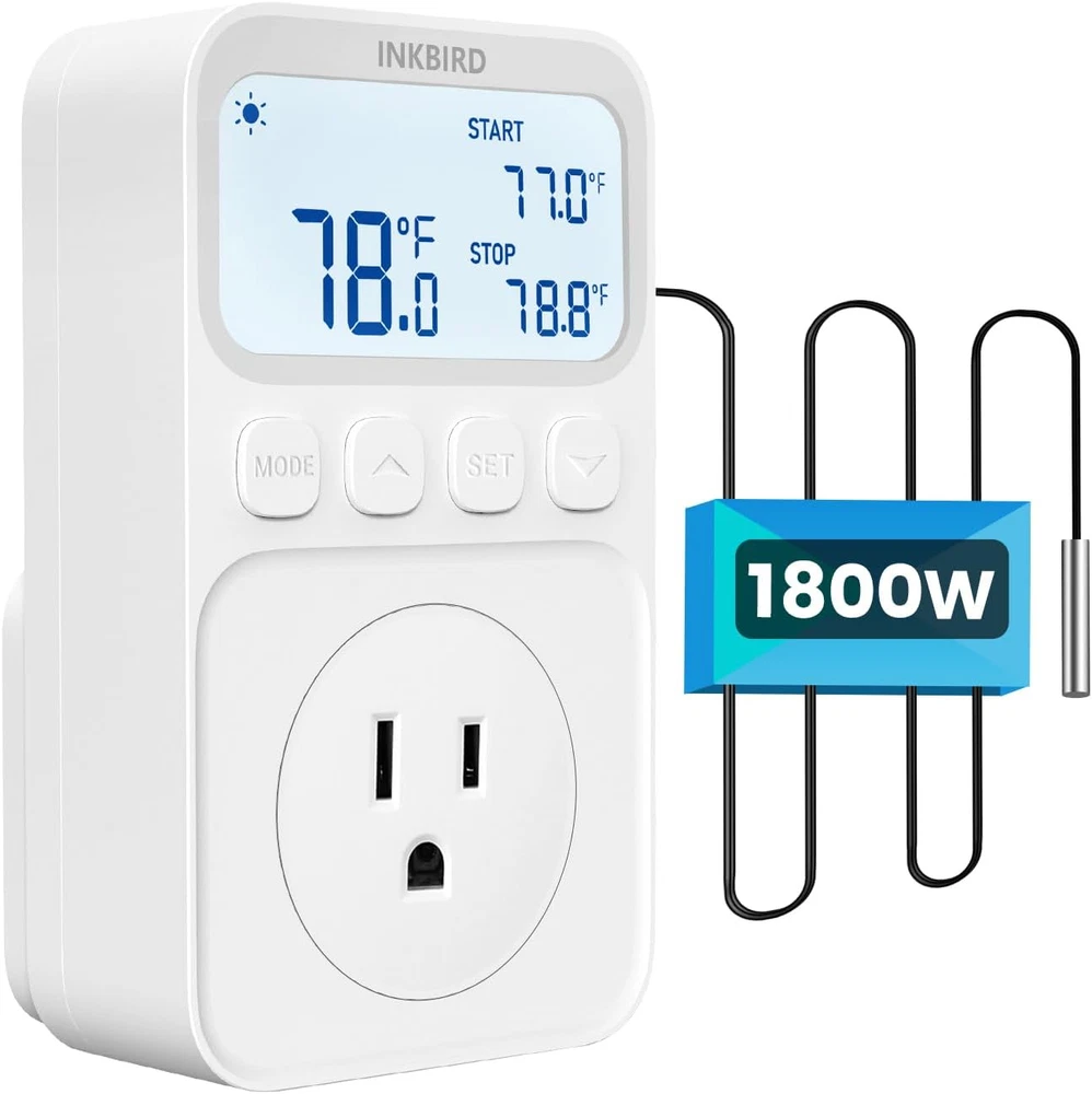Store New Arrivals Add to Favorite View Feedback Contact Plug in Thermostat 15A 1800W, Programmable Heating Cooling Digital Temperature Controller Timer for Window A/C Fan Heater Greenhouse Homebrewing Reptile Description Item model number C226T15A-US Control Type Button Control Display Type LCD Controller Type Hand Control Color White Included Components 1x C226T, 1x User Manual Wattage 1.8E+3 Control Method Remote Style Custom Package Dimensions 5.39 x 3.58 x 3.5 inches Item Weight 8.1 ounces Shape Rectangular Temperature Control Type programmable Voltage 240 Volts Model Name C226T15A Specific Uses For Product Electric Baseboard Heater Special Feature Programmable Backlight Yes Size 1800W 15A Plug & Play: Easy to program and safe in use, Supports temperature mode, cycle time mode, and countdown mode, 3 control modes, Temperature control range: -40 ℉~212 ℉, Power: 1800 W (120 Vac), 15A Safer In Use: It supports high and low temperature alarms with custom alarm values for use scenarios requiring more strict temperature control, and the buzzer can be muted Temperature Mode: Just set START and STOP temperatures and it will automatically run in heating or cooling mode based on the set points. When Start Temper>Stop Temper, it enters cooling mode; when Start Temper<Stop Temper, it enters heating mode Timing Function: It features cycle time and countdown function and total of 4 modes can be selected — P01 Cycle Time Mode, P02 Countdown ON Mode, P03 Countdown OFF Mode, and P04 Countdown ON&OFF Mode. Timing range: 0 ~ 99 hours and 59 minutes More Functions: The IP67 waterproof temperature probe can be inserted into the soil or submerged in water, and the backlit LCD screen makes it easy to see the current temperature and set temperatures in the dark Wide Application: This temperature control socket is widely applicable to reptiles, incubators, terrariums, refrigerators, heaters, home brewing, fermentation, and other temperature control systems, and it can be a timer with cycle timing and countdown It also supports temperature calibration, factory reset, child lock, and a memory function that can save all set parameters after a power failure. Please note that the temperature mode and timing function cannot be used at the same time Product Description The video showcases the product in use. The video guides you through product setup. The video compares multiple products. The video shows the product being unpacked. Work intermittently Set START=12:00, STOP=12:00. It will work for 12h, then stop for 12h, then cycle again. Work at a specified time Set START=00:30. the countdown for 30 min, the system will automatically start and keep working. Stop at specified time Set STOP=00:40, the system will automatically start working for 40 min and stop. ON&OFF at specified time Set START=00:30 & STOP=00:40. It will countdown for 30min, and start working for 40 min, and stop. Set START & STOP Temperature Heating : START < STOP (eg. 70°F - 80°F) Cooling : START > STOP (eg. 60°F - 50°F) 1 P01 Cycle Time 2 P02 Count Down ON 3 P03 Count Down OFF 4 P04 Count Down ON&OFF 5 Heating/Cooling 1 High Accurate 2 Temperature Alarm 3 IP67 Waterproof 4 Child Lock ABOUT US We offer the best prices around on high quality products. Our E-store includes media such as books, movies, music and games while offering electronics, toys, sporting apparel, clothing, tools, general home, garden items and more. SHIPPING We are always working hard to ensure your package arrives as soon as possible. Please understand that some factors like weather, high postal traffic, and the performance of shipping companies are outside of our control. We offer free shipping to the lower 48 states and ship within 2 business days of payment, usually sooner. We do not accept P.O. Boxes. Please provide a physical address. For shipping outside of the continental USA, we only use eBay's Global Shipping Program.The item is shipped to KY and then sent to the rest of the world. International customers are responsible for all duties and taxes. Continue to check out in order to calculate costs for shipping the item to your country. Messages regarding eBay's Global Shipping Program MUST be directed at eBay EXCLUSIVELY. RETURNS We offer a 30-Day Return Policy on items which you are not completely satisfied with. You have the option for a full-refund or an exchange of the item. No returns are available on items shipped outside of the USA. PAYMENT We accept PayPal. CONTACT US This page content is yet to come Please ad us to your favorite seller and visit again later Thank You CUSTOMER SATISFACTION We try our very best to make sure every customer is completely satisfied. If there's a problem, message us! We're happy to help. WE ACCEPT Copyright © 2021 AutoDS. | All Rights Reserved