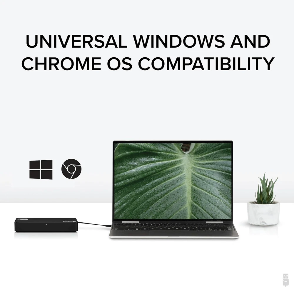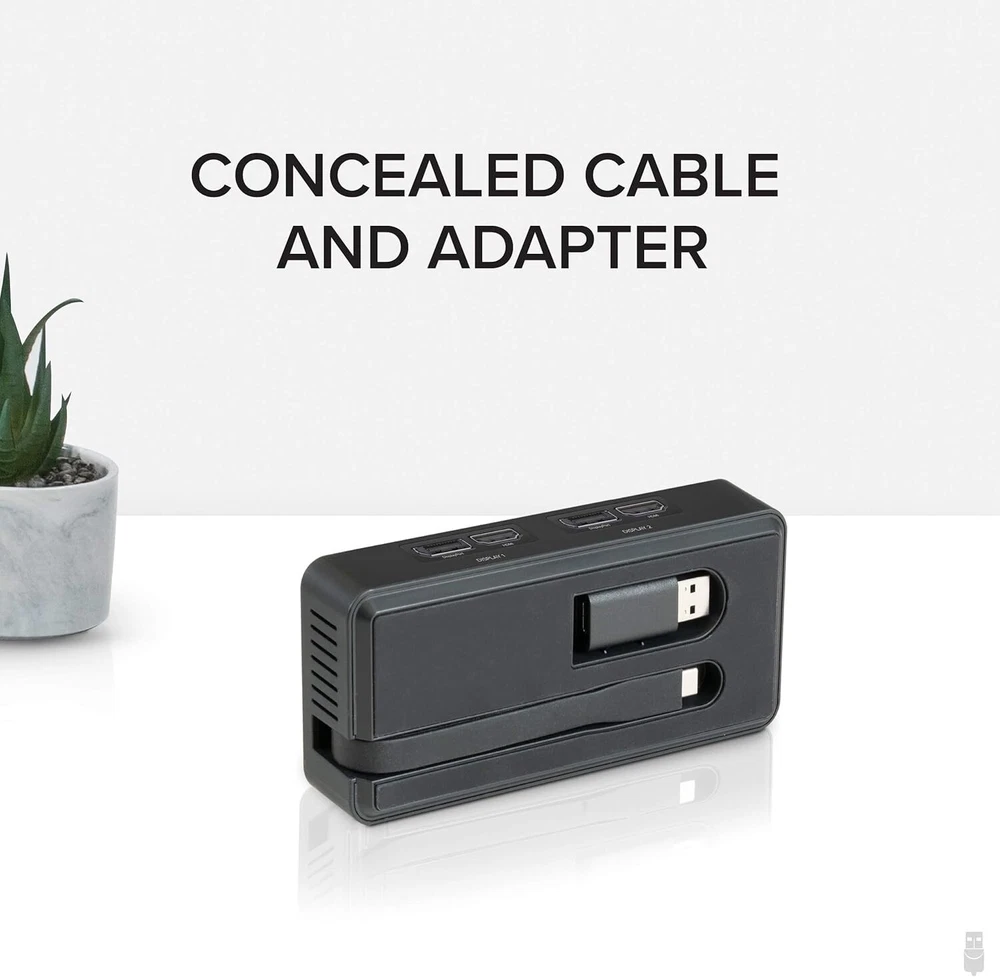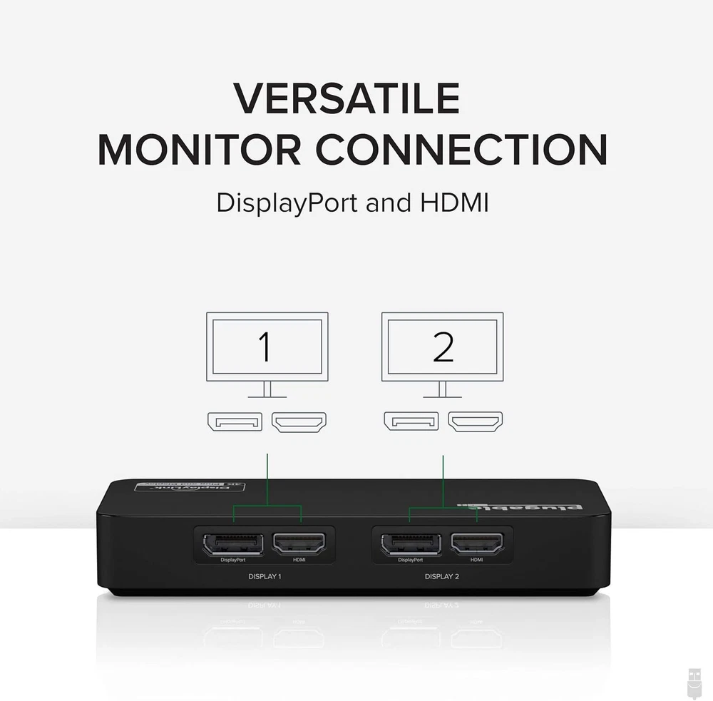 Plugable 4K DisplayPort and HDMI Dual Monitor Adapter with Ethernet for Black Product Details Brand: Plugable Color: Black Hardware Interface: USB, USB Type C, DisplayPort, Ethernet, HDMI, Thunderbolt Special Feature: Portable Compatible Devices: Windows 10 and 11 and ChromeOS 100.x or later systems Dual 4k Monitors: USB video adapter with dual monitor DisplayPort and HDMI ports for dual 4k 60Hz monitors and Gigabit Ethernet network connectivity; ideal for USB 3.0 to HDMI or USB to DisplayPort needs Flexible Connection: Displaylink dual HDMI adapter supports Displayport for a versatile 1 in 2 out solution; also functions as a USB Ethernet adapter for reliable network connection Compatibility: DisplayLink adapter compatible with Windows 10 and 11, ChromeOS 100.x or later; plug and play driver installation via Windows Update; Linux not supported; dock does not charge host PC Recommended Use: Ideal for web and productivity software at home or the office; not suitable for gaming; does not support HDCP, will not playback encrypted or copy-protected content Enhance Your Productivity: Transform your workspace with dual 4k monitors and reliable network connectivity for efficient work at home or in the office
