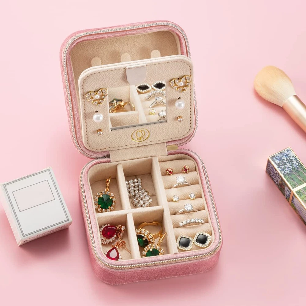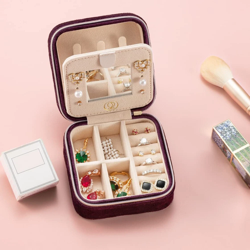 TRAVEL JEWELRY CASE with MIRROR - Travel jewelry box only the size of a palm of your hand, Size 3.9*3.9*2inch/10*10*5cm, Light Weight and Durable, easy to carry in a Handbag, Suitcase, Purse and Gym Bag, it is a travel essentials and travel accessories, hold your jewelry while Traveling, Flights, Go Abroad, Vacation, Party, Cruise, etc. as a gift you can give to our friends around you who love to travel. SMALL JEWELRY ORGANIZER - Multi-functional travel storage case, ideal for storing or carrying rings, earrings, necklaces, bracelets, necklaces and other jewelrys; you can also remove the internal dividers to store large earrings, lipsticks, watches, etc.; placed in an orderly manner without getting tangled together. HIGH QUALITY - The exterior is made of high quality Plush Velvet, The interior is made of high quality soft facecloth, which can well prevent your jewelry from scratching, the mini jewelry box serves you for a long time. SIMPLE and FASHION - Simple Design but Well made, Compact, Closed Zipper design is easy to use and more sturdy, Safe Storage; Small and Generous, Cute and Elegant, Fashion and Beautiful, Suitable for Children, Teenagers, Adults, Boys and Girls. PERFECT GIFT - This mini jewelry organizer as a Valentine's Day Gift, Birthday Gift, Mother's day Gift, Christmas Gift, Thanksgiving Day Gift and Wedding Gift for your daughter, granddaughter, girlfriend, sister, friends, mother, wife and etc. Will bring them a lot of surprises and make them happy.