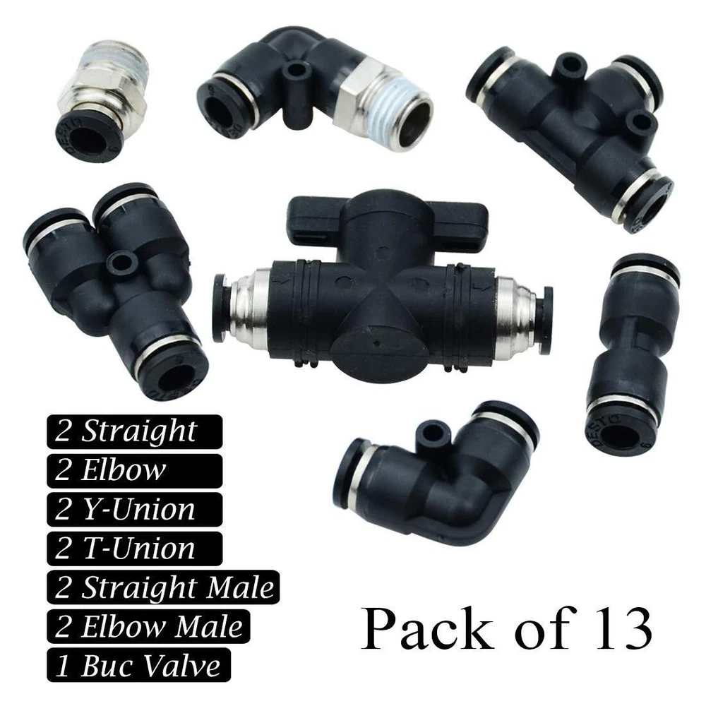Feature: Easy to install, no need for other tools, just insert the tube inside. All models of push lock fittings are designed to suit your pneumatic piping needs perfectly. Long service life. You can easily change the tubing connector direction. Narrow space is also suitable with the push. Specification: Working Pressure:0-1.0MPa | 0-150psi Applicable Tube: PU / PA / PE / PVC Proof Pressure:3.0Mpa | 435psi.Seal Working Temperature:0-60℃ | 32-140℉; Negative Pressure:-100Kpa | -29.5 In Hg Fluid Type: air, vacuum; Operating Pressure: 0- 150 Psi; Working Temperature: 32~140°F | 0-60°C; Negative Pressure: -100Kpa| -29.5 In H These fittings are selected high quality and the best part is they just need a simple push, provide secure connection. No extra sealing needed. Safe and reliable material. Energy-saving, low-cost, high pressure resistant and non tripping, all taper pipe threads are paint teflon leakage-proof rubber, offering good seal property. Easy to install, available in various styles and models . Each model to serve its purpose. All models of push lock fittings are designed to suit your pneumatic piping needs perfectly Tube Fitting Sizes: 6mm Tube OD straight ( 2pcs ); 6mm Tube OD elbow ( 2pcs ); 6mm Tube OD tee ( 2pcs ); 6mm Tube OD Y spliter ( 2pcs ); 6mm Tube OD x 1/4” NPT - male straight ( 2pcs ); 6mm Tube OD x 1/4” NPT - male elbow ( 2pcs ); 6mm Tube OD - BUC union ball valve ( 1pcs )