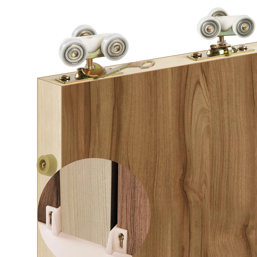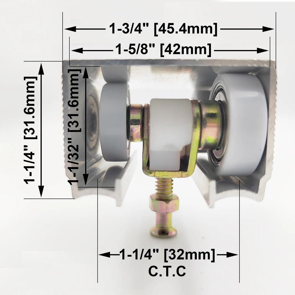 1 In. Flat Tri-Wheel Hanger: Each single hanger is equiped with three 1-inch O.D. nylon encapsulated ball bearing wheels. Not fit standard track, please check before purchase. Fits Part #1125 Hanger: Time to get rid of #1120 standard wheel door hangers and upgrade them with our durable ball bearing door hangers. Replaces #1500 Replacement Kit: Includes 2 top hangers, 2 door guides, 1 door stop, 1 wrench and 1 screw pack. Perfect replacement part set for 1500/100PD series pocket door frames. Commercial Grade Hardware Kit: Commercial grade (1-inch roller) with max. 200lbs weight capacity, not universal for most residential use (3/4-inch roller). Compatible With: 100, 134F, 138F, 2610F Series Track. These adjustable roller assemblies mount on the tops of pocket doors and has a 1-1/4-inch center to center.