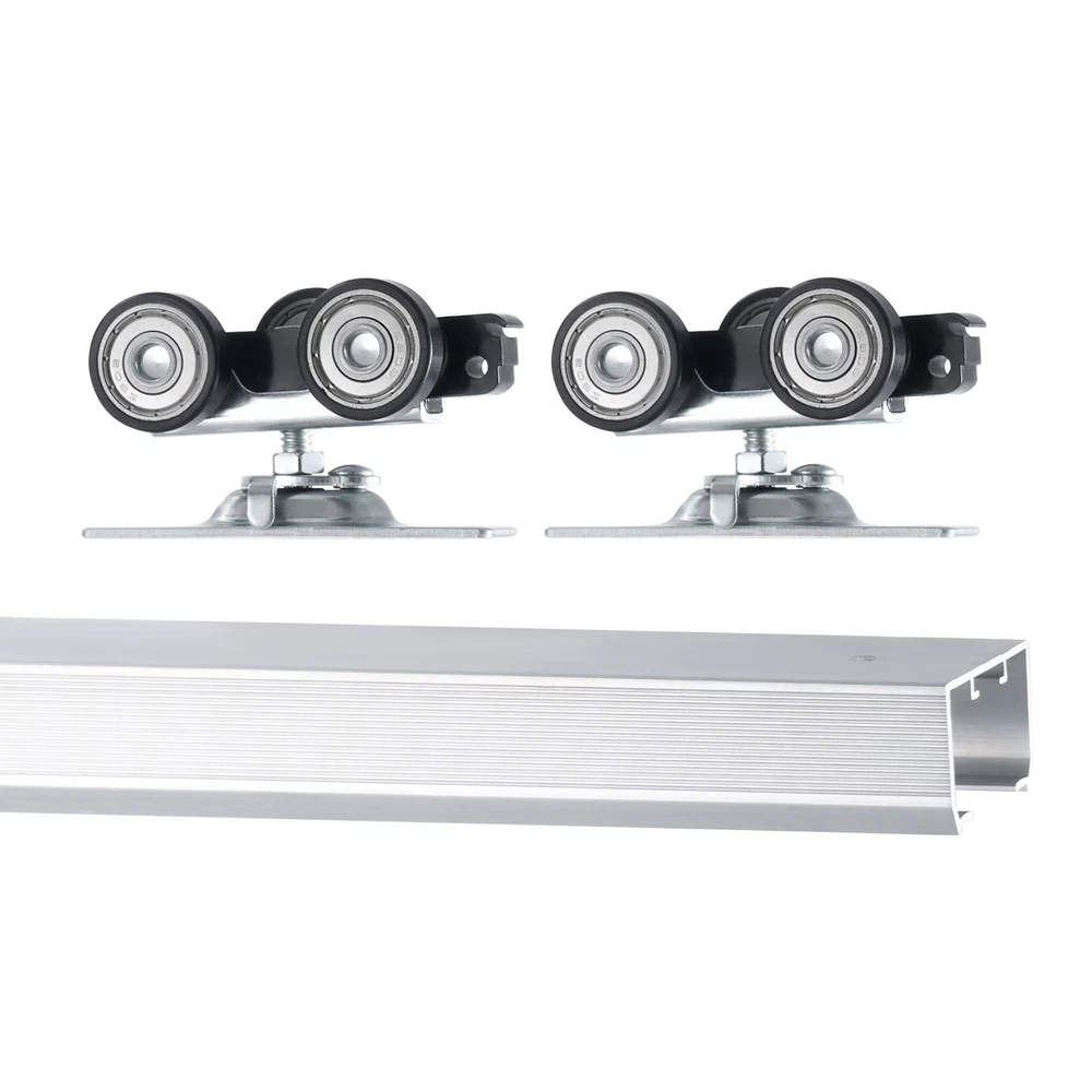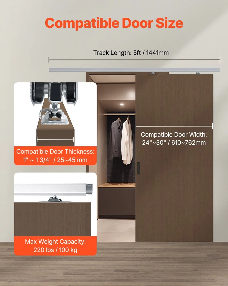 Pocket Door Track Kit 5 ft Heavy Duty Pocket Door Hardware Track Set 3 Wheels 5ft Sliding Door Hardware and Track Kit Applicable Door Durable and Sturdy Stable and Smooth Easy to Install Effortless and Reliable Track Material: Aluminum Alloy,Max Weight Capacity: 220 lbs / 100 kg,Product Dimensions (L x W x Thickness): 56.73 x 1.77 x 1.22 in / 1441 x 44.9 x 31 mm,Item Model Number: YMXT-XC39-5,Track Size: 5 ft / 1441 mm,Product Weight: 2.25 lbs / 1.02 kg,Compatible Door Thickness: 1-1 3/4 in / 25-45 mm,Compatible Door Width: 24-30 in / 610-762 mm