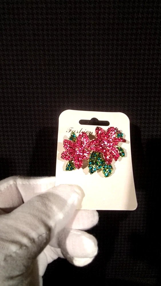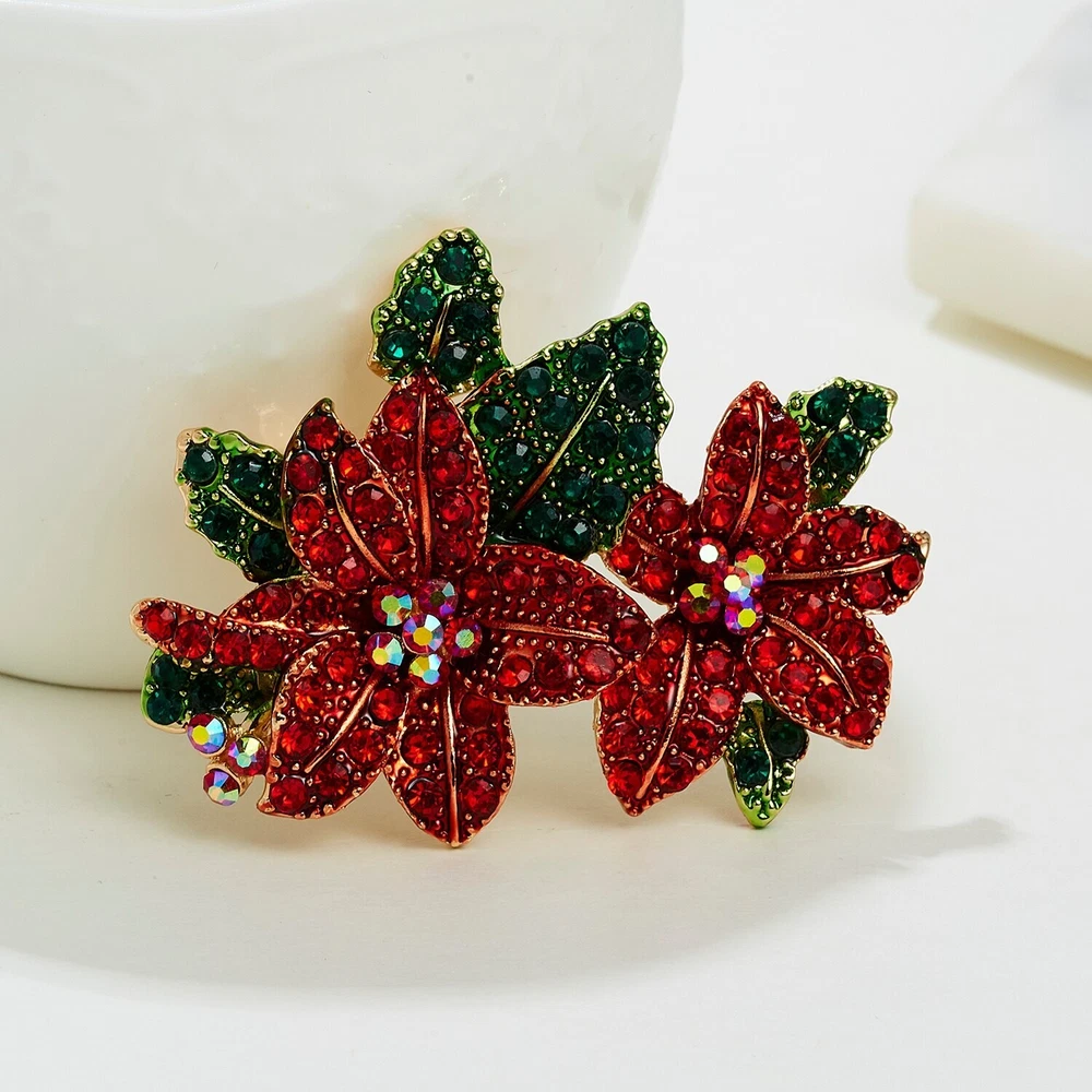 Poinsettias Christmas Crystal Rhinestone Brooch Pin / Pendant Gold Bag- VIDEO ( This brooch can be used as a pin, or a Pendant with the extra loop on the reverse side ) Brooch is 2 1/2" x 1 1/2 " (USA MADE, USA SOLD. WATCH OUT FOR CHINA FAKES) Free Gold Foil and Cloth Bag Come see all of our other Brooches, Bracelets, Earrings, Necklaces, Pendants, , Rings, and Glow in the Dark jewelry today.