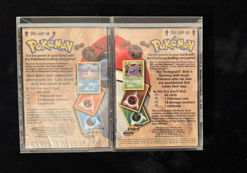 The Pokémon Fossil BodyGuard & LockDown Theme Decks are sealed sets of collectible cards manufactured by Wizards of the Coast in 1999. Each deck contains 60 standard-sized cards featuring characters like Muk and Lapras, perfect for Pokémon TCG enthusiasts aged 6 and up. With a vintage feel and advanced level features, these decks are sure to appeal to collectors and players alike, offering a nostalgic and exciting addition to any collection.
