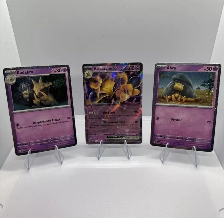 This Pokémon card is part of the Scarlet & Violet - 151 set and features the Psychic-type evolution line of Abra, Kadabra, and Alakazam. It is an EX Black Star Promo card with a holographic finish, making it a special and collectible addition to any Pokémon TCG collection. Manufactured by Nintendo in 2023, this standard-sized card is in English and includes the characters Kadabra, Abra, and Alakazam with card number 050. It is a promotional card that comes as a box topper, suitable for players aged 4 and up.