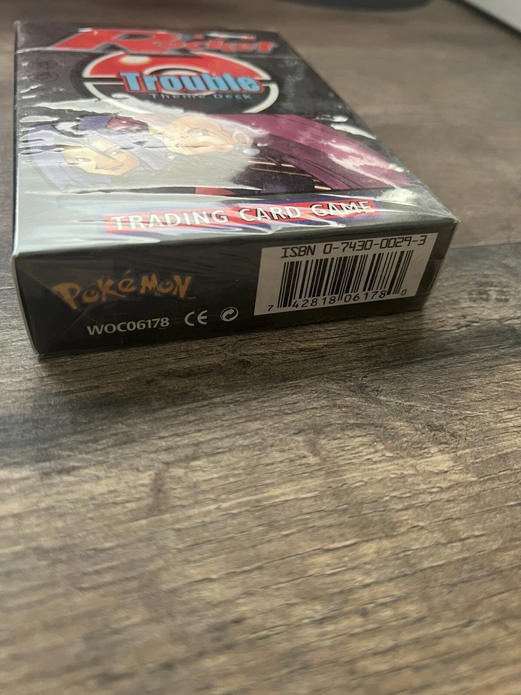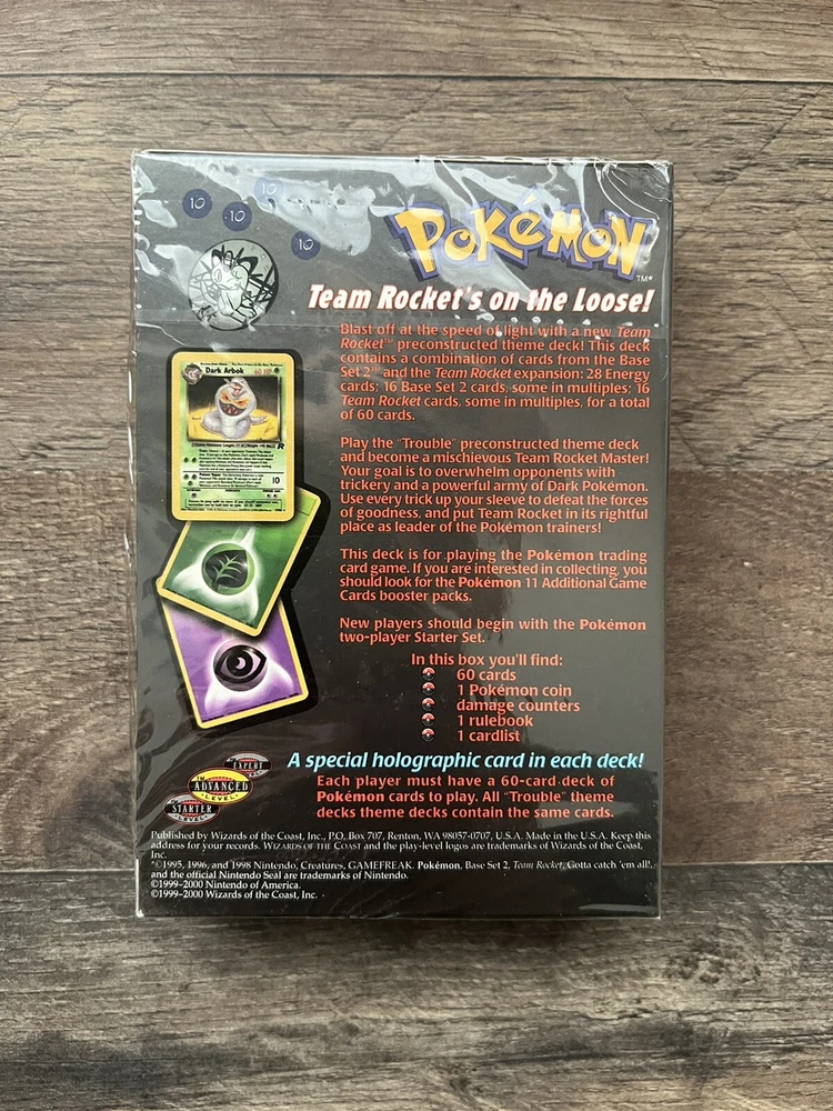 Brand New Factory Sealed This Pokemon Team Rocket TROUBLE Theme Deck is a factory-sealed starter deck with 60 cards. It features a preconstructed theme deck with cards from the Pokemon TCG game, including characters. The deck is made from card stock material and is a 1st edition, limited edition, or structure deck. The deck is perfect for collectors or players of the Pokemon TCG game. It is a vintage item from 1999 and is suitable for people aged 4+, 6+, 8+, 10+, 13+, and 16+. The deck comes with one pack and is in English language. The manufacturer of the deck is Wizards of the Coast and it is a great addition to any collection or as a gift for a Pokemon fan.