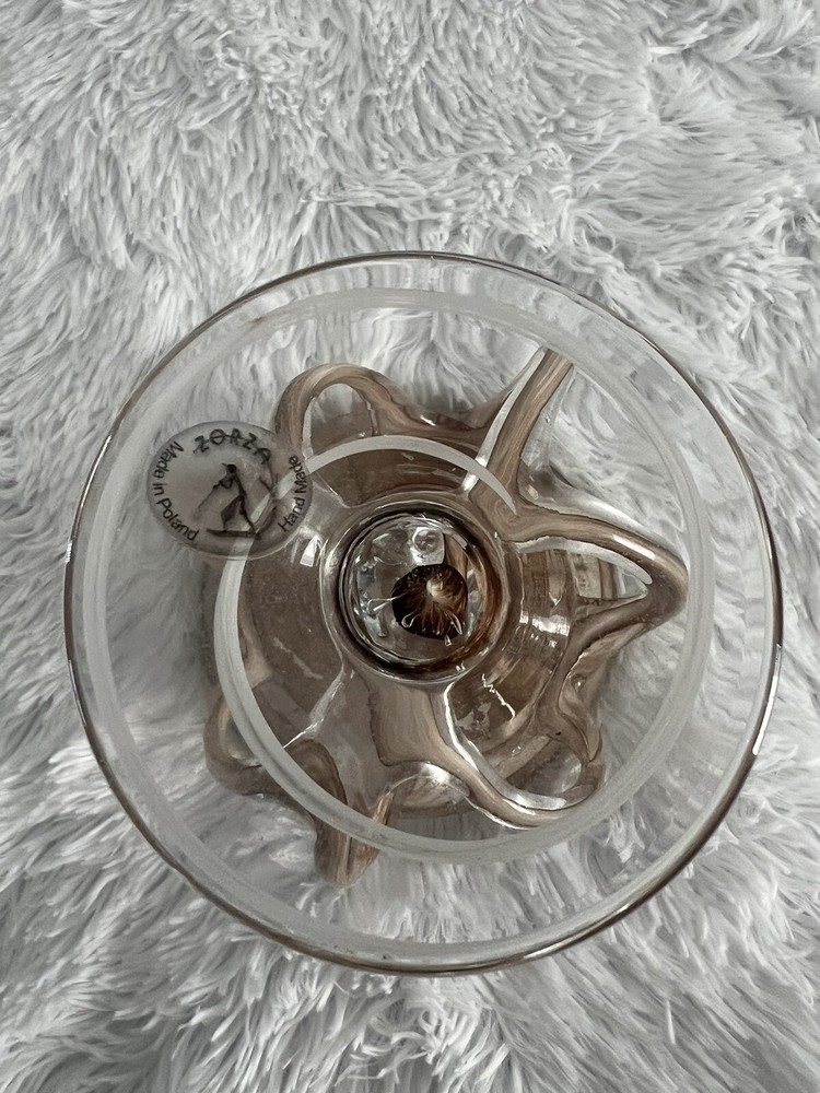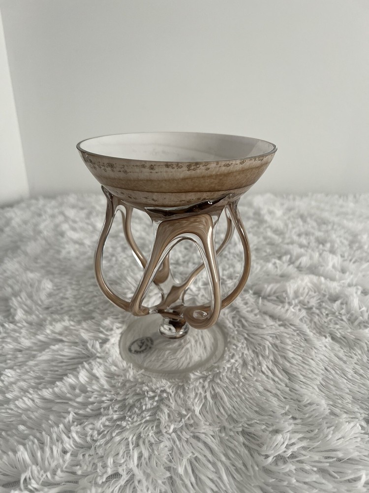 This ZORZA Art Glass Sculpture Jellyfish Footed Compote Pedestal Bowl from Poland is a stunning piece of decorative cookware that exemplifies artistry and craftsmanship. Made of glass and featuring a jellyfish theme, this handmade bowl is designed in a unique and eye-catching style. The beige color adds a touch of elegance to the piece, making it a beautiful addition to any home decor. Perfect for serving or displaying, this compote bowl is a true work of art. 7 inch Tall 5.5 inch wide 4 inch Base See Pictures... There are 3 very small chips on the top of the "bowl", very hard to see even up close, but you can feel them. The price is reflected because of them. Still a very nice piece!!!!
