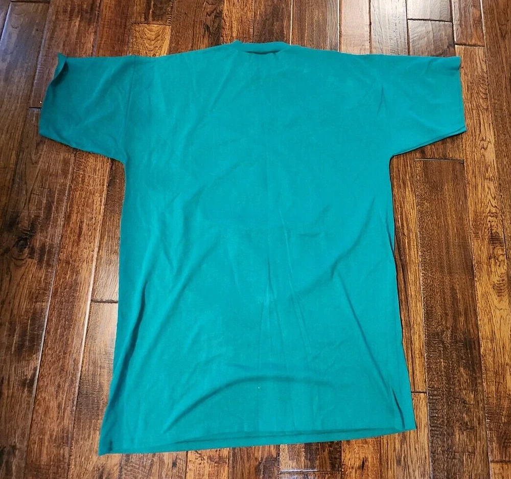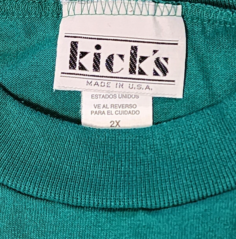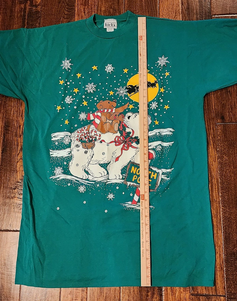 This is an oversized tee with a Christmas theme print on front. It's Christmas green, even tho photos appear blue. It's either a nightgown or tunic, definately longer than a usual t-shirt. The brand is kick's Made in USA, 50% cotton, polyester, made in USA, 2X. The front has a full moon with Santa and sleigh in the sky, a small brown bear riding on a polar bear. The background is snowflakes with silver metallic accents. At the bottom - sign post North Pole. It's feels like its either not been worn/washed, or lightly worn. buyer to pay shipping of $10.00