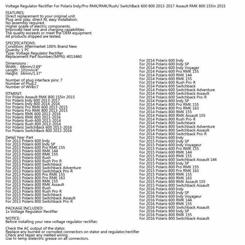 You may also like Voltage Rectifier Regulator For Polaris 900 Fusion RMK 2006 4010886 4012611 AV 50.85 USD Free shipping Magneto Stator Coil For Arctic Cat ATV 90 2X4 Dvx 2006-2008/2011-2017 3305-254. 57.85 USD Free shipping Rectifier Regulator Fit for Polaris 4060123 2203873 4060092 4060071 \4060122 AV 20.85 USD Free shipping STATOR + VOLTAGE REGULATOR + GASKET FOR YAMAHA FX NYTRO M-TX R-TX X-TX 2012~14 129.85 USD Free shipping Voltage Regulator for Ski-Doo 600 HO SDI Repl # 515176243 515175717 515176023 38.85 USD Free shipping Voltage Regulator Fit for ARCTIC CAT ZR 120 FIRECAT BEARCAT 700 900 2005-2019 AV 30.85 USD Free shipping Magneto Stator Coil For Arctic Cat EXT 580 / Pantera 580 EFI L/C 97~98 3005-053 77.85 USD Free shipping Voltage Regulator Fit for Arctic Cat Repl.# 0109-823,0232-020,0630-267,0630-001. 18.85 USD Free shipping Voltage Regulator Fit for Arctic Cat F8 F F/XF800 M XF ZR 8000 08-17 0630-322 US 57.85 USD Free shipping Voltage Regulator For Ski-Doo Grand Touring 700 800 98-01 515175461 515170600 VA 33.85 USD Free shipping Stator Generator Fit Yamaha SW10 Sidewinder 1000 L R B S M X TX EFI 8KJ-81410-00 121.85 USD Free shipping Voltage Regulator Rectifier For Arctic Cat 570 00 Snowmobile 0630-230 0630-321YU 64.85 USD Free shipping Voltage Regulator Rectifier For Polaris Indy/Pro RMK/RMK/Rush/ SwitchBack 600 800 2013-2017 Assault RMK 800 155in 2015 FEATURES: Direct replacement to your original unit. Plug-and-play, direct fit, easy installation. No assembly required. Higher grade of electric components. Improved heat sink and charging capabilities. The quality exceeds or meet the OEM equipment. All products shipped are tested. SPECIFICATIONS: Condition: Aftermarket 100% Brand New Quanity: 1 PC Type: Voltage Regulator Rectifier Replacement Part Number/(MPN): 4013460 Dimensions : Width : 68mm/2.69" Length : 101mm/4" Height: 34mm/1.37" Number of plug interface pins: 7 Number of Plug:2 Number of Wires:7 FITMENT: For Polaris Assault RMK 800 155in 2015 For Polaris Indy 600 2013-2017 For Polaris Indy 800 2014-2016 For Polaris Pro RMK 600 2013-2015 For Polaris Pro RMK 800 2013-2015 For Polaris RMK 600 2013-2016 For Polaris RMK 800 2013-2016 For Polaris Rush 600 2013-2014 For Polaris Rush 800 2013-2014 For Polaris SwitchBack 600 2013-2016 For Polaris SwitchBack 800 2013-2016 Detail Year-Part For 2013 Polaris 600 Indy For 2013 Polaris 600 Indy SP For 2013 Polaris 600 Pro RMK 155 For 2013 Polaris 600 RMK 144 For 2013 Polaris 600 RMK 155 For 2013 Polaris 600 Rush For 2013 Polaris 600 Rush Pro-R For 2013 Polaris 600 Switchback For 2013 Polaris 600 Switchback Adventure For 2013 Polaris 600 Switchback Pro-R For 2013 Polaris 800 Pro RMK 155 For 2013 Polaris 800 Pro RMK 163 For 2013 Polaris 800 RMK 155 For 2013 Polaris 800 RMK Assault For 2013 Polaris 800 Rush For 2013 Polaris 800 Rush Pro-R For 2013 Polaris 800 Switchback For 2013 Polaris 800 Switchback Assault For 2013 Polaris 800 Switchback Pro-R For 2014 Polaris 600 Indy For 2014 Polaris 600 Indy SP For 2014 Polaris 600 Indy Voyager For 2014 Polaris 600 Pro RMK 155 For 2014 Polaris 600 RMK 144 For 2014 Polaris 600 RMK 155 For 2014 Polaris 600 Rush Pro-R For 2014 Polaris 600 Switchback For 2014 Polaris 600 Switchback Adventure For 2014 Polaris 600 Switchback Assault For 2014 Polaris 600 Switchback Pro-R For 2014 Polaris 800 Indy SP For 2014 Polaris 800 Pro RMK 155 For 2014 Polaris 800 Pro RMK 163 For 2014 Polaris 800 RMK 155 For 2014 Polaris 800 RMK Assault 155 For 2014 Polaris 800 Rush Pro-R For 2014 Polaris 800 Switchback For 2014 Polaris 800 Switchback Adventure For 2014 Polaris 800 Switchback Assault For 2014 Polaris 800 Switchback Pro-R For 2015 Polaris 600 Indy For 2015 Polaris 600 Indy SP For 2015 Polaris 600 Indy Voyageur For 2015 Polaris 600 Pro RMK 155 For 2015 Polaris 600 RMK 144 For 2015 Polaris 600 RMK 155 For 2015 Polaris 600 Switchback Assault 144 For 2015 Polaris 800 Indy SP For 2015 Polaris 800 Pro RMK 155 For 2015 Polaris 800 Pro RMK 163 For 2015 Polaris 800 RMK 155 For 2015 Polaris 800 RMK 163 For 2015 Polaris 800 RMK Assault 155 For 2015 Polaris 800 Switchback Assault For 2016 Polaris 600 Indy For 2016 Polaris 600 Indy SP For 2016 Polaris 600 Indy Voyageur For 2016 Polaris 600 RMK 144 For 2016 Polaris 600 RMK 155 For 2016 Polaris 600 Switchback Assault For 2016 Polaris 800 Indy SP For 2016 Polaris 800 RMK 155 For 2016 Polaris 800 Switchback Assault PACKAGE INCLUDED: 1x Voltage Regulator Rectifier NOTICE: Before installing your new voltage regulator rectifier; Check the AC output of the stator. Replace any burned or corroded connectors on stator and regulator/rectifier Check and repair any melted wiring. Use hi-temp dielectric grease on all connectors. -About US Founded in 2012, VIPJQ have professional development and sales, and are involved in various products, providing customers with various high-quality products. Since its establishment, VIPJQ has always adhered to the service concept of "customer first" and the management concept of "pursuit of quality", and is committed to providing customers with high-quality original designs. We commit to provide you the best innovative, quality products & professional services with competitive prices. We value every customer, and we look forward to providing solutions for your business needs to help your business achieve its goals, please contact us immediately! We are all about you! We are a Japanese seller,but with large warehouse in USA. We are profesional on Auto Parts,Car Parts,Motorcycle Parts,3C,other hot sale items and so on. We aim to provide to customers high quality product and best service. -About Shipment&Returns The item usually will be dispatched within 3 days after you ordered.All are free shipping. And it usually takes 3-10 working days to delivery depends on buyers' address or other majeure on the way. If you are not satisfied with the items and want to return the item,we hope you could message us first,we will give you the return details, we think we coul