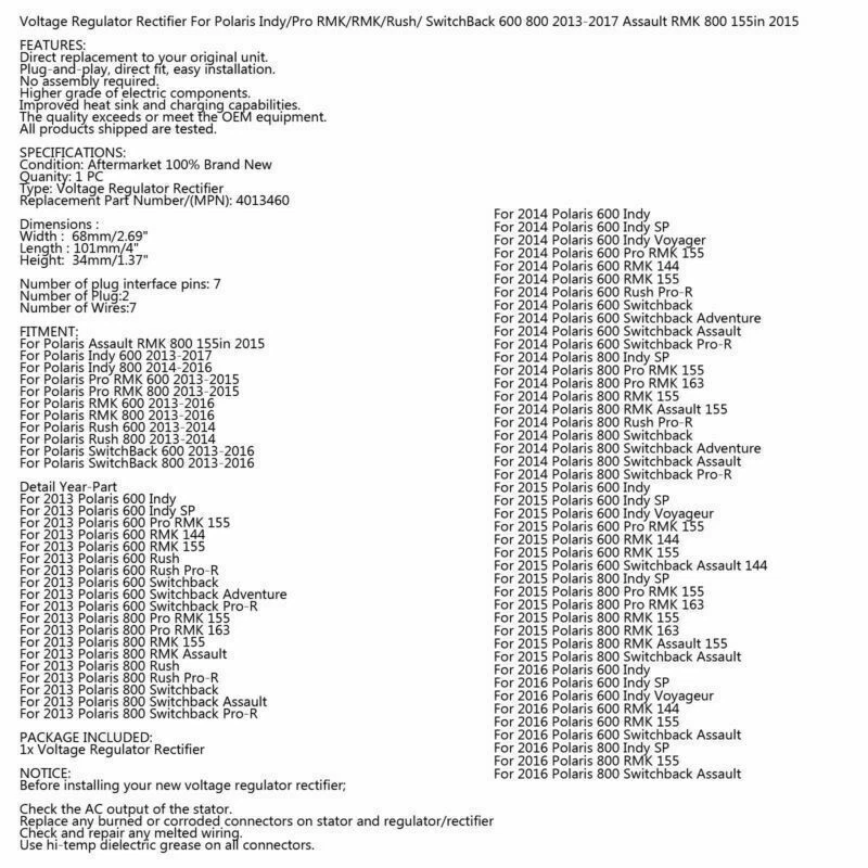 You may also like 3 Phase Regulator Fit Arctic Cat M XF F ZR 1100 9000 Turbo Sno Pro 0630-288 CA 40.85 USD Free shipping VOLTAGE REGULATOR RECTIFIER Fit for Arctic Cat ZRT 800 Thundercat 2000 3005-626- 24.85 USD Free shipping Voltage Rectifier Regulator For Polaris 700 900 Fusion RMK 2006 4010886 YU A 50.85 USD Free shipping Regulator Rectifier For Ski-Doo Snowmobile 380 500 583 # 515163800 410110600 A 23.85 USD Free shipping Voltage Regulator Fit for Arctic Cat Sno Pro 440 Snowmobile 2004-2006 0630-180 A 35.85 USD Free shipping Stator Generator for Ski-Doo 600 800 E-TEC Repl.# 420866060 420866065 YU A1 103.85 USD Free shipping Rectifier Regulator Fit for Arctic Cat 340 440 550 580 600 Snowmobile 1990-2007 18.85 USD Free shipping Voltage Rectifier Regulator Fits Arctic Cat Pantera 550 580 EFI L/C Wildcat 700" 26.85 USD Free shipping Voltage Regulator For 5-9A Charging System 691188 491546 793360 794360 Engine H0 17.85 USD Free shipping Stator Magneto For Ski-Doo Skandic Expedition Legend V800 420684853 420684852 H0 80.85 USD Free shipping Voltage Regulator Fit for Arctic Cat Sno Pro M800 XF800 LXR 0630-250 0630-323 T9 52.85 USD Free shipping Stator Generator fit SkiDoo 600 700 800 420889905 410922946 410922965 410922993 82.85 USD Free shipping Voltage Regulator Rectifier for Polari 600 700 800 IQ Snowmobile 07-12 4012476` 39.85 USD Free shipping Voltage Rectifier Regulator For Polaris 340 500 550 4010794 4010355 Snowmobile A 33.85 USD Free shipping Voltage Rectifier Regulator Fits Polaris Switchback 600 800 Snowmobiles 4013460 39.85 USD Free shipping STATOR + VOLTAGE REGULATOR + GASKET FOR YAMAHA VECTOR RS90 VENTURE RST90 05-09 112.85 USD Free shipping NEW-00004 Voltage Rectifier Regulator Fit Polaris SwiThback 600 800 Snowmobiles 4013460 T Voltage Regulator Rectifier For Polaris Indy/Pro RMK/RMK/Rush/ SwitchBack 600 800 2013-2017 Assault RMK 800 155in 2015 FEATURES: Direct replacement to your original unit. Plug-and-play, direct fit, easy installation. No assembly required. Higher grade of electric components. Improved heat sink and charging capabilities. The quality exceeds or meet the OEM equipment. All products shipped are tested. SPECIFICATIONS: Condition: Aftermarket 100% Brand New Quanity: 1 PC Type: Voltage Regulator Rectifier Replacement Part Number/(MPN): 4013460 Dimensions : Width : 68mm/2.69" Length : 101mm/4" Height: 34mm/1.37" Number of plug interface pins: 7 Number of Plug:2 Number of Wires:7 FITMENT: For Polaris Assault RMK 800 155in 2015 For Polaris Indy 600 2013-2017 For Polaris Indy 800 2014-2016 For Polaris Pro RMK 600 2013-2015 For Polaris Pro RMK 800 2013-2015 For Polaris RMK 600 2013-2016 For Polaris RMK 800 2013-2016 For Polaris Rush 600 2013-2014 For Polaris Rush 800 2013-2014 For Polaris SwitchBack 600 2013-2016 For Polaris SwitchBack 800 2013-2016 Detail Year-Part For 2013 Polaris 600 Indy For 2013 Polaris 600 Indy SP For 2013 Polaris 600 Pro RMK 155 For 2013 Polaris 600 RMK 144 For 2013 Polaris 600 RMK 155 For 2013 Polaris 600 Rush For 2013 Polaris 600 Rush Pro-R For 2013 Polaris 600 Switchback For 2013 Polaris 600 Switchback Adventure For 2013 Polaris 600 Switchback Pro-R For 2013 Polaris 800 Pro RMK 155 For 2013 Polaris 800 Pro RMK 163 For 2013 Polaris 800 RMK 155 For 2013 Polaris 800 RMK Assault For 2013 Polaris 800 Rush For 2013 Polaris 800 Rush Pro-R For 2013 Polaris 800 Switchback For 2013 Polaris 800 Switchback Assault For 2013 Polaris 800 Switchback Pro-R For 2014 Polaris 600 Indy For 2014 Polaris 600 Indy SP For 2014 Polaris 600 Indy Voyager For 2014 Polaris 600 Pro RMK 155 For 2014 Polaris 600 RMK 144 For 2014 Polaris 600 RMK 155 For 2014 Polaris 600 Rush Pro-R For 2014 Polaris 600 Switchback For 2014 Polaris 600 Switchback Adventure For 2014 Polaris 600 Switchback Assault For 2014 Polaris 600 Switchback Pro-R For 2014 Polaris 800 Indy SP For 2014 Polaris 800 Pro RMK 155 For 2014 Polaris 800 Pro RMK 163 For 2014 Polaris 800 RMK 155 For 2014 Polaris 800 RMK Assault 155 For 2014 Polaris 800 Rush Pro-R For 2014 Polaris 800 Switchback For 2014 Polaris 800 Switchback Adventure For 2014 Polaris 800 Switchback Assault For 2014 Polaris 800 Switchback Pro-R For 2015 Polaris 600 Indy For 2015 Polaris 600 Indy SP For 2015 Polaris 600 Indy Voyageur For 2015 Polaris 600 Pro RMK 155 For 2015 Polaris 600 RMK 144 For 2015 Polaris 600 RMK 155 For 2015 Polaris 600 Switchback Assault 144 For 2015 Polaris 800 Indy SP For 2015 Polaris 800 Pro RMK 155 For 2015 Polaris 800 Pro RMK 163 For 2015 Polaris 800 RMK 155 For 2015 Polaris 800 RMK 163 For 2015 Polaris 800 RMK Assault 155 For 2015 Polaris 800 Switchback Assault For 2016 Polaris 600 Indy For 2016 Polaris 600 Indy SP For 2016 Polaris 600 Indy Voyageur For 2016 Polaris 600 RMK 144 For 2016 Polaris 600 RMK 155 For 2016 Polaris 600 Switchback Assault For 2016 Polaris 800 Indy SP For 2016 Polaris 800 RMK 155 For 2016 Polaris 800 Switchback Assault PACKAGE INCLUDED: 1x Voltage Regulator Rectifier NOTICE: Before installing your new voltage regulator rectifier; Check the AC output of the stator. Replace any burned or corroded connectors on stator and regulator/rectifier Check and repair any melted wiring. Use hi-temp dielectric grease on all connectors. NOTE: To ensure you have 100% satisfied shopping experience, please check the Specification and Description and Pictures all carefully to make sure the product are the same with what you want before purchasing. Thanks for your cooperation! About Us Shipping Terms Of Sale Contact Us Areyourshop has committed to do our utmost to serve more vehicles models with the most competitive products both in price and service, including headlights, foglights, taillights,headlight assembly, etc., aiming at the largest group of customers. Paired with our fast shipping and satisfaction guarantee, we’re able to ensure that all the customers can get the product when they need it. Customer Satisfactory 1.We back our commitment with superb service, 100% full money back and a customer satisfacti