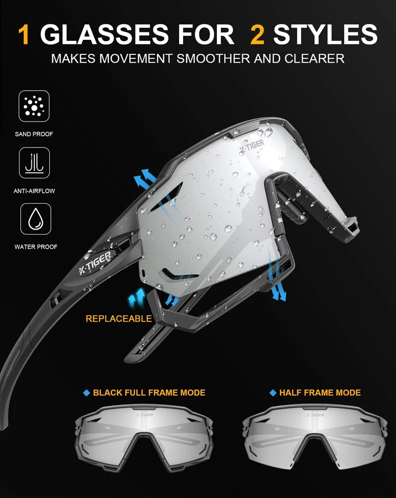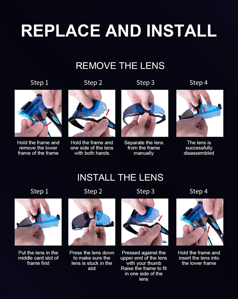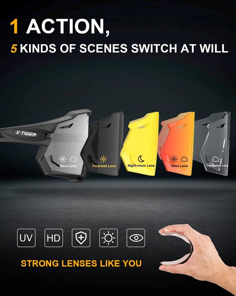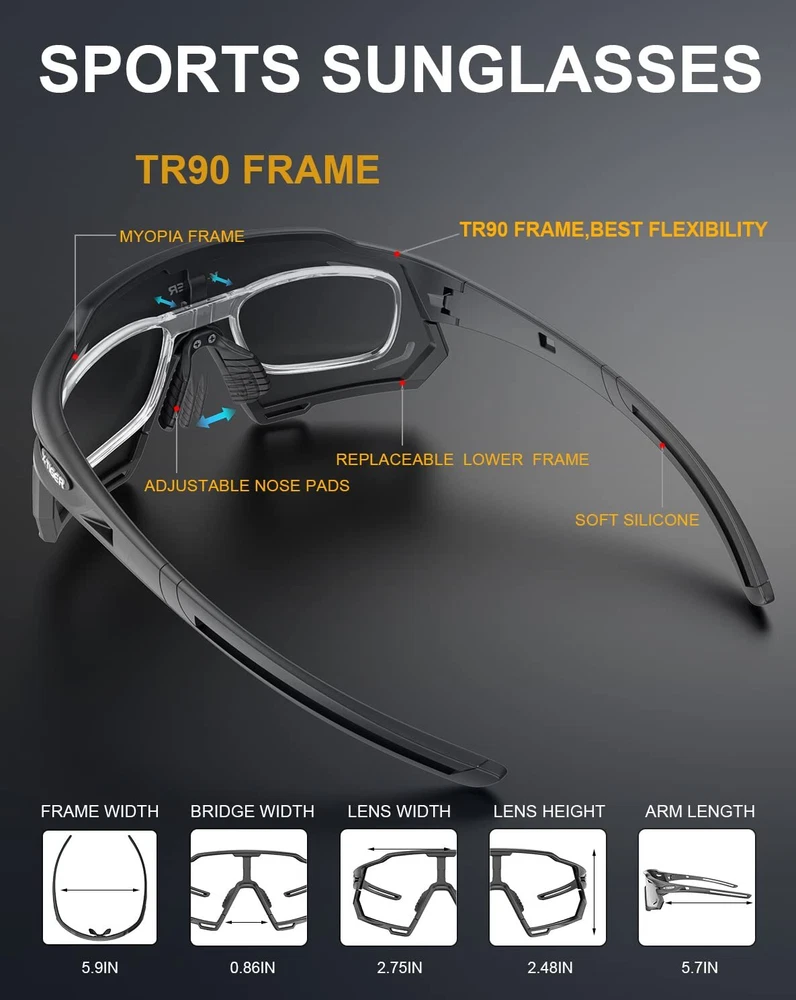 5 Interchangeable Lenses:Cycling sunglasses provide 5 interchangeable lenses. The main functions of the lens include: 1. Yellow: suitable for night riding 2. Black(Polarized): can greatly eliminate the strong reflected light 3. Revo Lens(2pieces): greatly reduce the intensity of light 4. HD clear lens: provide clarity in cloudy and low light conditions vision More Choices of Styles and Accessories:The lower frame of these MTB road bike glasses adopts a new interchangeable design, you can change the color of the lower frame to achieve a different frame color match or just remove it to become a half-frame. Accessories include EVA glasses case, glasses bag, cleaning cloth, polarized test card, non-slip ear hook and headband, removable lower frame, frame, TR90 glasses frame, 5 interchangeable lenses. TR90 Frames and Adjustable Nose Pad :-An active lifestyle means that your sports glasses for men & women will have to be tough and rugged enough to meet up to whatever challenges you throw at it. The specially designed resistant TR90 frame can meet up whatever you dish out to it and more ,In the meantime,the nose pad is made of soft rubber, skin-friendly, and non-slip. It can be adjusted according to your nose shape UV Protection Cut:These biking glasses for men and women are made of materials with excellent safety and impact resistance, it stands out for its ultra-lightness, clarity, elasticity, stability and impact resistance. Effectively reduce the damage of UVA and UVB on glasses, reduce the load on the eyes and ensure a comfortable vision Strong Design for All Sports:The strong design and durable TR90 frames make these baseball sunglasses suitable for all sports.They are ideal for cycling,mtb,biking,driving, running, baseball,fishing, golf,skiing and climbing or other outdoor activities