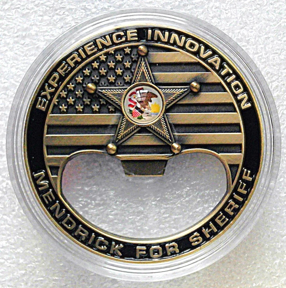 This unique Police Mendrick for Sheriff Bottle Opener Challenge Coin is a must-have for any collector of law enforcement memorabilia. The front of the coin displays the Sheriff's Office logo, while the back features a bottle opener and the challenge coin design. This item is an original and authentic collectible, perfect for adding to any militaria or challenge coin collection. The coin was manufactured in 2001 or later and has not been modified. It falls under the categories of Challenge Coins, Original Items, and Current Militaria (2001-Now). This Police Collectible Challenge Coin is a great addition to any collection and a perfect way to support law enforcement.