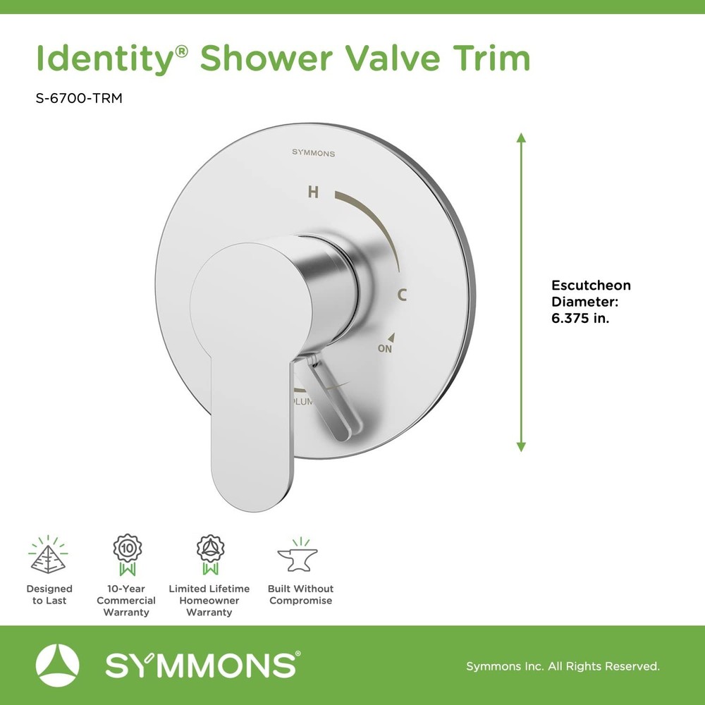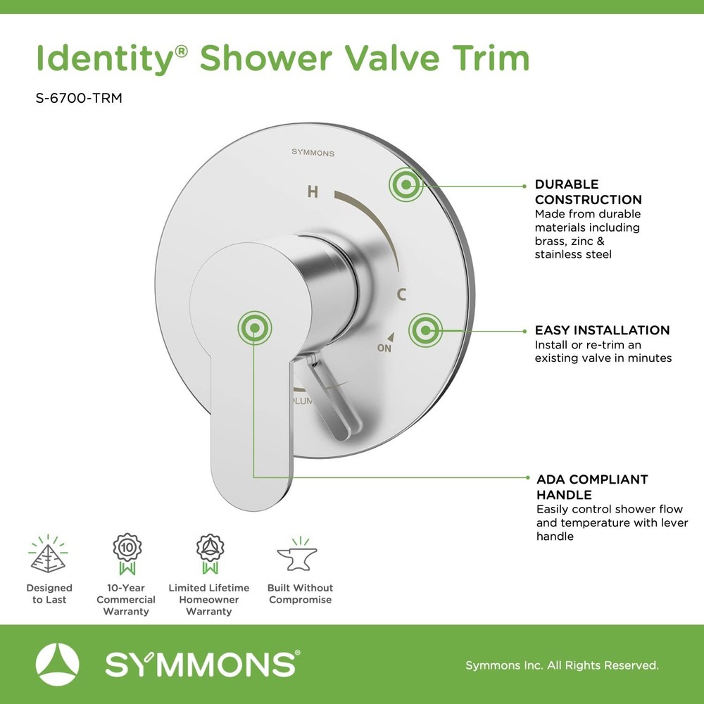 Identity shower valve trim kit Trim kit only; valve not included For use with Temptrol pressure balancing valve model S261XBODY Or for 3x faster installation, use Temptrol Rapid Install bracket model S261XBRBODY ADA compliant metal lever handle Secondary integral volume control handle to control shower water volume Constructed of brass, zinc, stainless steel, and plastic Meets standards set by ADA (Americans with Disabilities Act) for safety and ease of use Limited lifetime warranty for consumer; 10 year warranty for commercial use