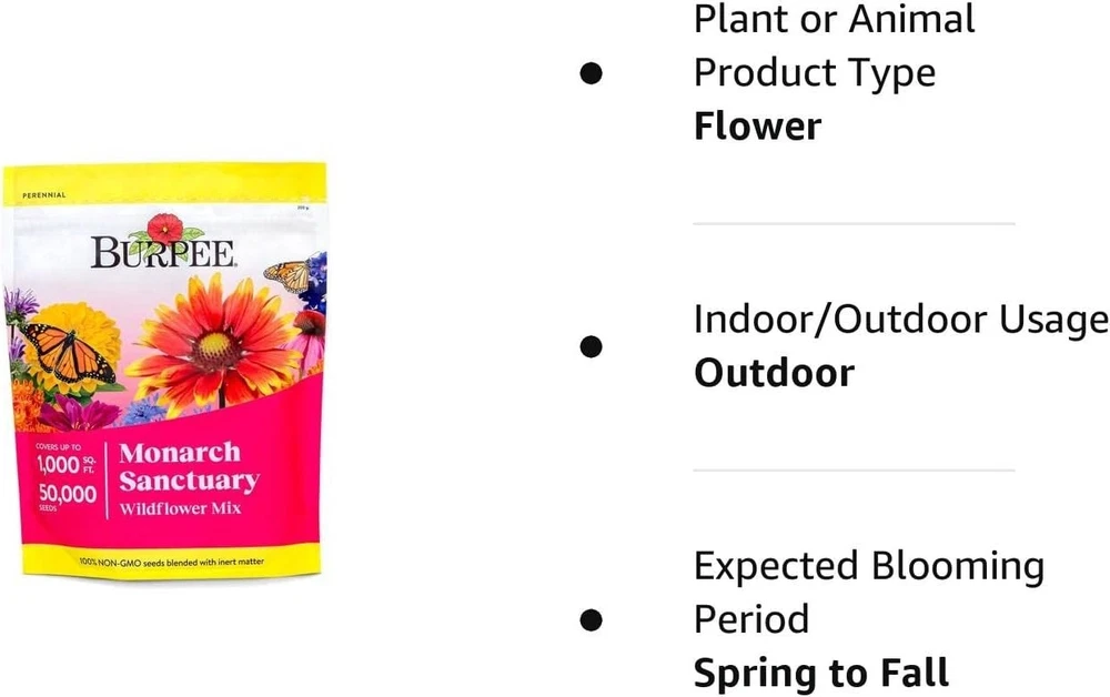 Pollinator-Friendly Flowers: Monarch Sanctuary Seed Mix with 50,000 Seeds ‹ › ‹ › ‹ › ‹ › ‹ › ‹ › ‹ › ‹ › ‹ › ‹ › Pollinator-Friendly Flowers: Monarch Sanctuary Seed Mix -50,000 Seeds Features: Contains over a dozen flower varieties, including 3 types of butterfly weed Attracts beneficial pollinators, including butterflies Covers up to 1,000 square feet Ideal for most soil types Flowers grow 2-6’ tall, blooming in spring to fall Non-GMO seeds Benefits: Create a beautiful assortment of blooms in your garden Help save the declining Monarch butterfly populations Easy to grow and maintain Attracts a variety of beneficial pollinators Provides a haven for migrating Monarchs Why choose our Monarch Sanctuary Seed Mix? Are you looking to create a vibrant and pollinator-friendly garden? Our Monarch Sanctuary Seed Mix is the perfect choice! With over a dozen flower varieties, including butterfly weed, this mix will attract beneficial pollinators like butterflies to your garden. Not only does it help save the declining Monarch butterfly populations, but it's also easy to grow and maintain. Create a beautiful haven for migrating Monarchs with our non-GMO seed mix. Don't miss out on this opportunity to make a positive impact on the environment - order your Monarch Sanctuary Seed Mix today! Shipping Free & Fast Shipping - We offer free shipping to most of the USA with a normal delivery time of 3-7 days. However, due to the current situation, additional delivery time (up to 3 weeks) may be required for some items. Alternative Carriers - We may use alternative carriers (e.g. USPS, FedEx, UPS, etc.) to ensure your package arrives safely and on time. Due to the use of multiple carriers, we are unable to provide a tracking number automatically. Handling Time - Orders are processed and shipped within 1-2 business days of receiving cleared payment. Shipping Restrictions - Shipping to Alaska, Hawaii, Puerto Rico, Guam, and other US territories may incur shipping charges or delivery restrictions. Please contact us before ordering, or your order can be refunded/cancelled. State Restrictions - There may be restrictions based on your state of purchase. For example, certain items may not be shipped to California due to state regulations. Contact for Tracking Updates - If you require tracking updates or have any concerns about the delivery of your order, please feel free to contact us, and we will be happy to assist you. Return 30-Day Hassle-Free Returns - We want you to be completely satisfied with your purchase. If you are not, you can return the item within 30 days of receiving it for a full refund or exchange. Easy Return Process - To start a return, simply contact us and we will provide you with a prepaid return shipping label and detailed instructions. Restocking Fee - There are no restocking fees for returns. However, the buyer is responsible for return shipping costs if the return is not due to a seller's error. Refund Processing Time - Refunds will be processed within 5 business days of receiving the returned item in its original condition. Payment We accept all major credit cards, PayPal, and Apple Pay for your convenience. Your payment information is secure and encrypted to ensure a safe and seamless transaction. Please complete your payment within 3 days of purchase to avoid any delays in shipping. Feedback Your feedback is extremely important to us. We strive to provide the best products and customer service possible. If you are satisfied with your purchase, please take a moment to leave us a positive review. If you have any concerns or issues with your order, please contact us before leaving negative feedback. We are committed to resolving any problems and ensuring your satisfaction. Contact Us If you have any questions or concerns, please feel free to reach out to our customer support team. You can contact us through the eBay messaging system. We are available Monday to Friday, 9:00 am to 5:00 pm EST, and we will do our best to respond to your inquiry within 24 hours. Thank you for supporting our small family business!