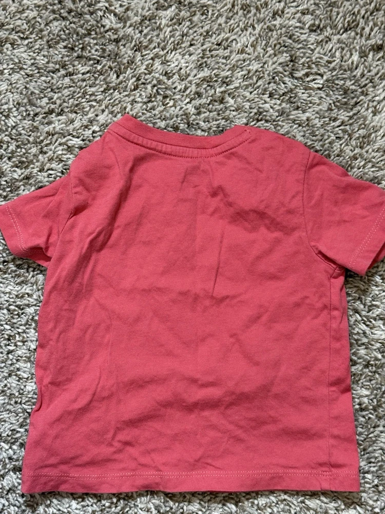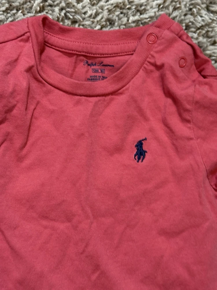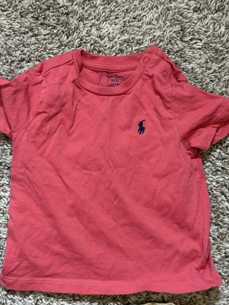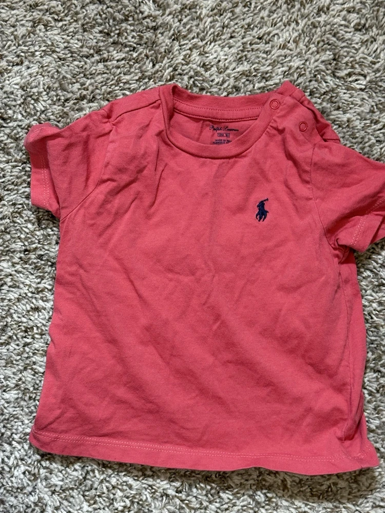 This is a pre-owned Polo Ralph Lauren baby boy short-sleeve t-shirt in a size 12 Months. The shirt features a solid coral or salmon pink color with a signature navy blue embroidered pony logo on the left chest. Designed for easy dressing, it includes a two-snap placket at the left shoulder. The garment is made from 100% soft cotton jersey fabric and has a standard crew neckline. It is in good used condition with no major flaws noted.