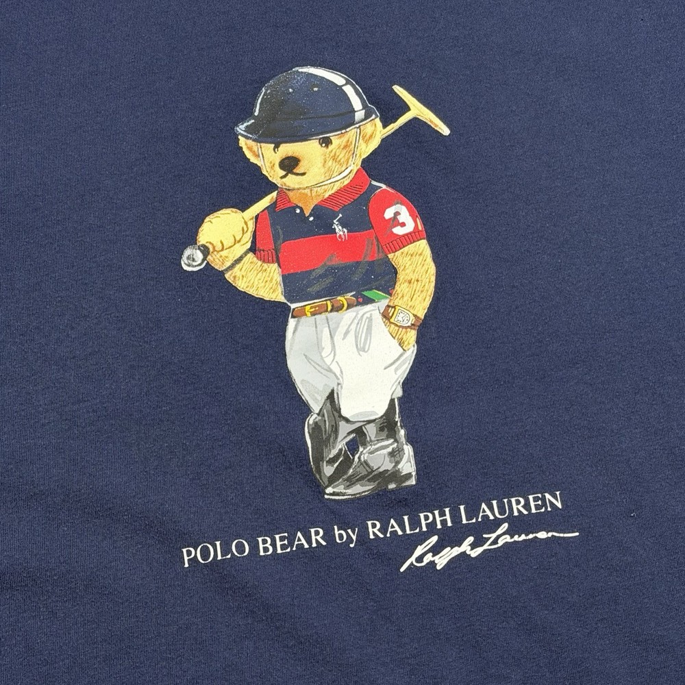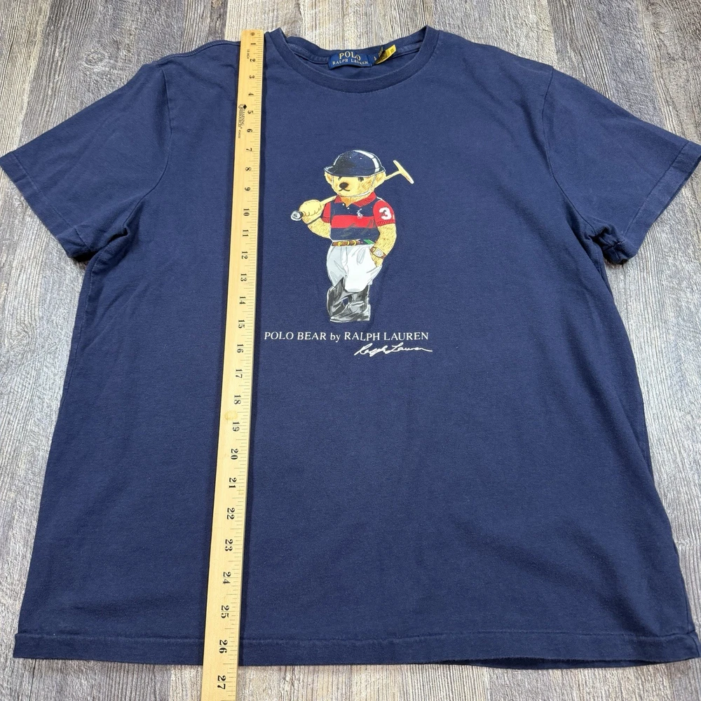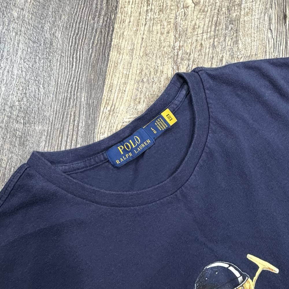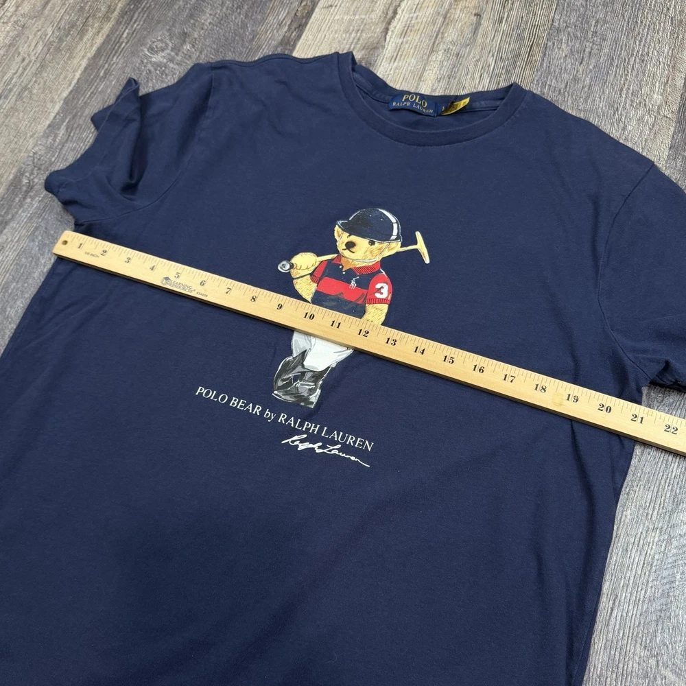 Classic Polo Bear graphic tee from Polo Ralph Lauren. Features the iconic Polo Bear wearing a helmet and holding a mallet, finished with “Polo Bear by Ralph Lauren” script and signature below. This shirt is tagged size Large, but based on measurements it fits closer to a men’s Medium. Please review measurements carefully for best fit. Details: Brand: Polo Ralph Lauren Style: Polo Bear graphic T-shirt Tagged Size: Large (Is likely to fit those who are a medium) Color: Navy Blue Material: 100% Cotton Made in: Guatemala Features: Authentic Polo Bear front graphic Crewneck, short sleeves Classic Ralph Lauren artwork Easy casual or streetwear piece Condition: Very Good Pre-Owned Condition NOTE: Please see all photos for condition as all flaws will be shown throughout the photos! * COLORS MAY BE DARKER OR LIGHTER OR SLIGHTLY DIFFERENT DUE TO MONITOR/PHONE/TABLET SETTINGS. My shipping discount: $3 shipping on each additional item you add to your order!
