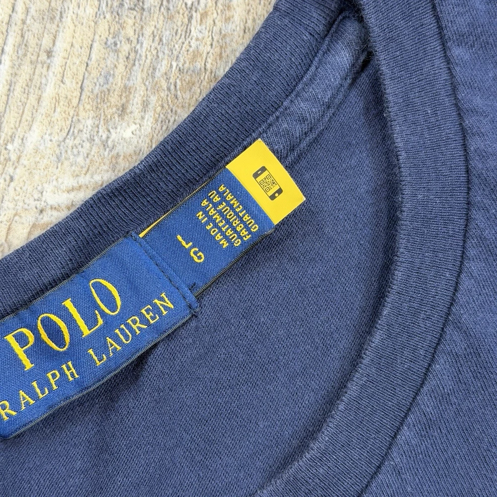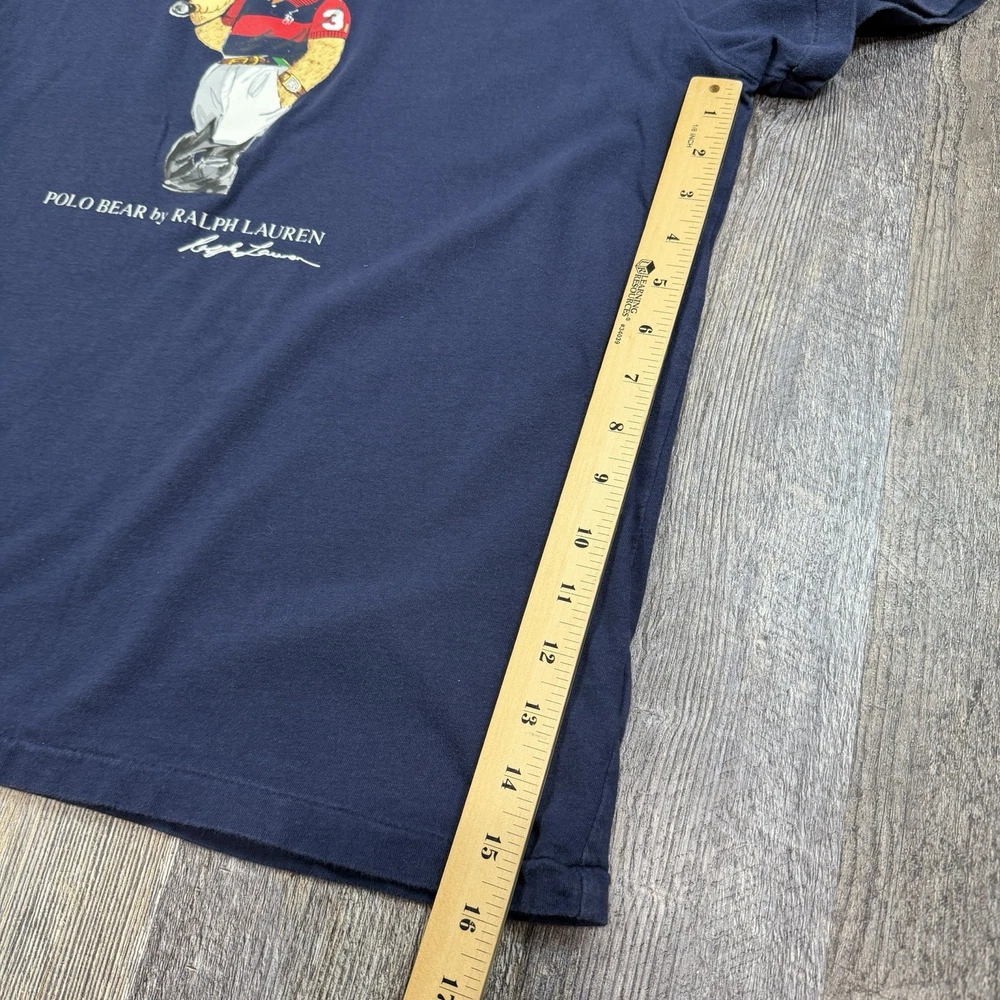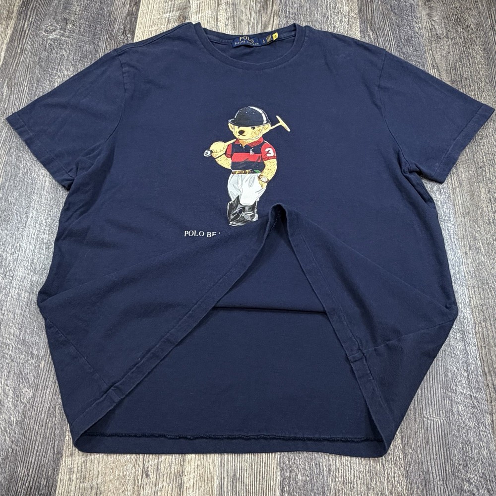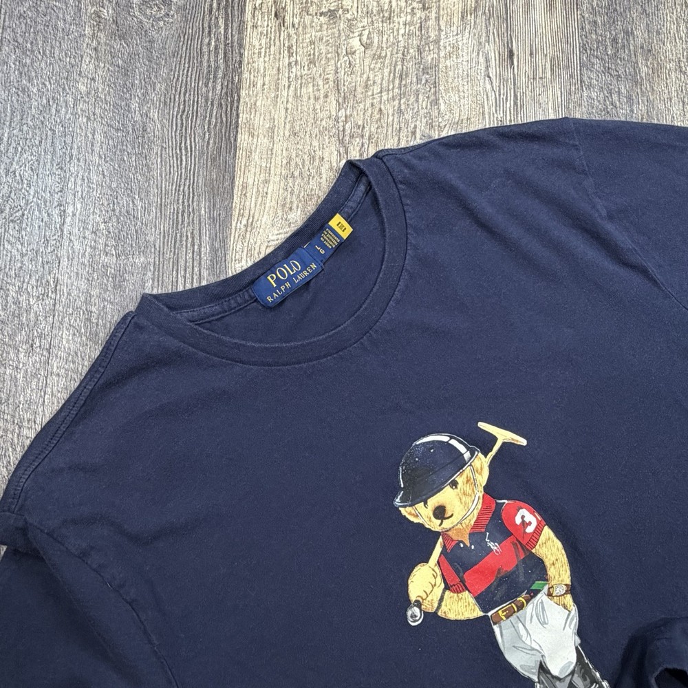 Classic Polo Bear graphic tee from Polo Ralph Lauren. Features the iconic Polo Bear wearing a helmet and holding a mallet, finished with “Polo Bear by Ralph Lauren” script and signature below. This shirt is tagged size Large, but based on measurements it fits closer to a men’s Medium. Please review measurements carefully for best fit. Details: Brand: Polo Ralph Lauren Style: Polo Bear graphic T-shirt Tagged Size: Large (Is likely to fit those who are a medium) Color: Navy Blue Material: 100% Cotton Made in: Guatemala Features: Authentic Polo Bear front graphic Crewneck, short sleeves Classic Ralph Lauren artwork Easy casual or streetwear piece Condition: Very Good Pre-Owned Condition NOTE: Please see all photos for condition as all flaws will be shown throughout the photos! * COLORS MAY BE DARKER OR LIGHTER OR SLIGHTLY DIFFERENT DUE TO MONITOR/PHONE/TABLET SETTINGS. My shipping discount: $3 shipping on each additional item you add to your order!