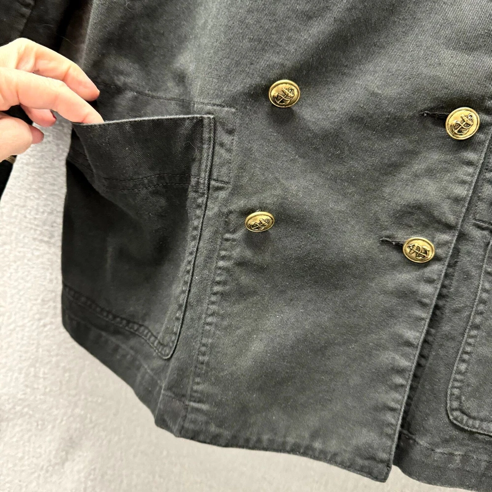 Polo Ralph Lauren Blazer Womens 4 Black Denim Military Double Breasted Gold Piping + Pockets Nautical Buttons Cotton Linen Very good condition, see all pictures for views. •Pit to pit: 17" •Shoulder to hem: 27" Ships out same day or next open postal day. Thank you for your purchase, we appreciate you!