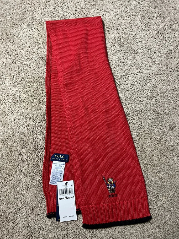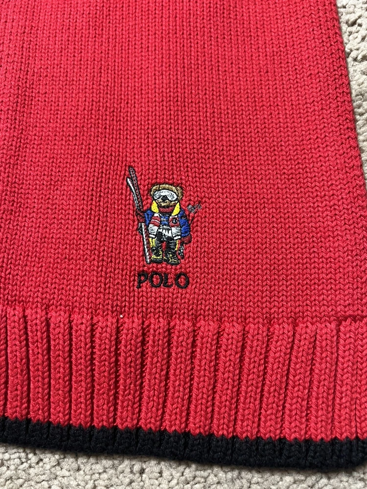 This Polo Ralph Lauren scarf is perfect for any young skier or casual wearer. The red knit cotton scarf features the iconic Polo Bear character and is made of 100% cotton fabric. It is one size fits all and has a solid pattern, making it a versatile addition to any outfit. The scarf is perfect for keeping warm and stylish during the winter and fall seasons. The model is Polo Ralph Lauren Bear and the theme is Ski, Bear. This item is not handmade and is not vintage. It is a great gift for boys and is part of the Kids' Clothing, Shoes & Accessories category.