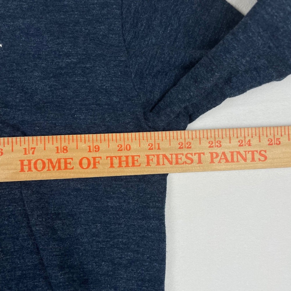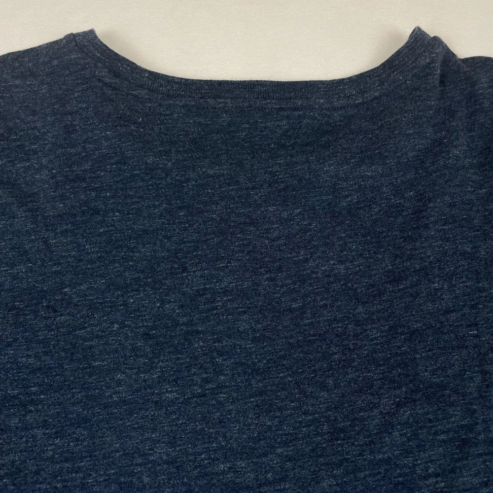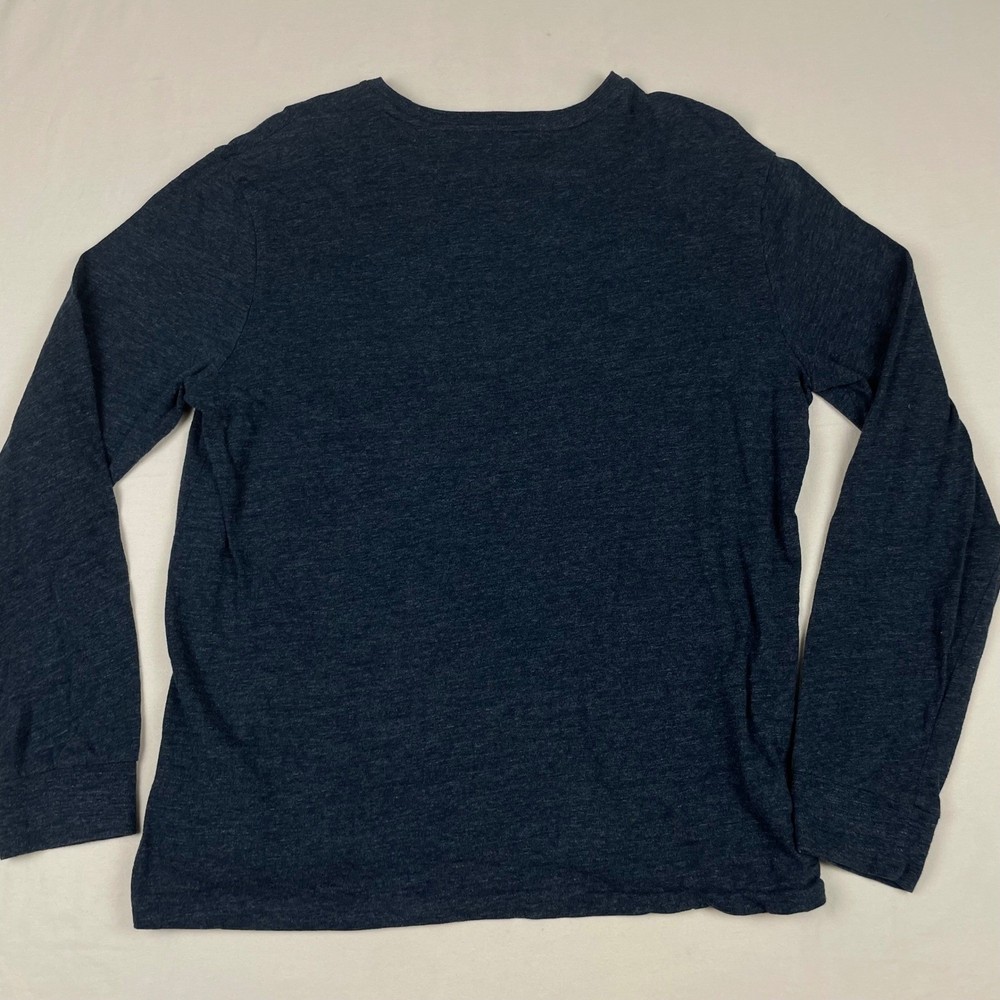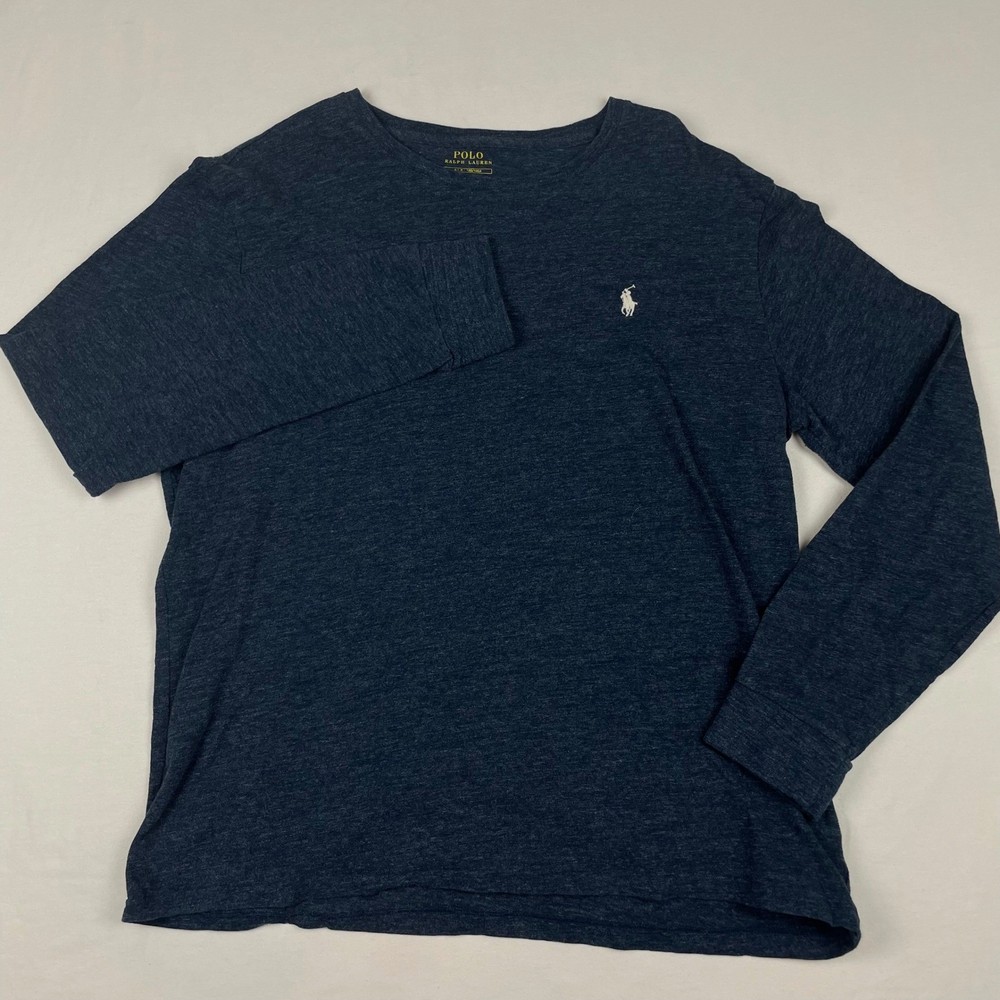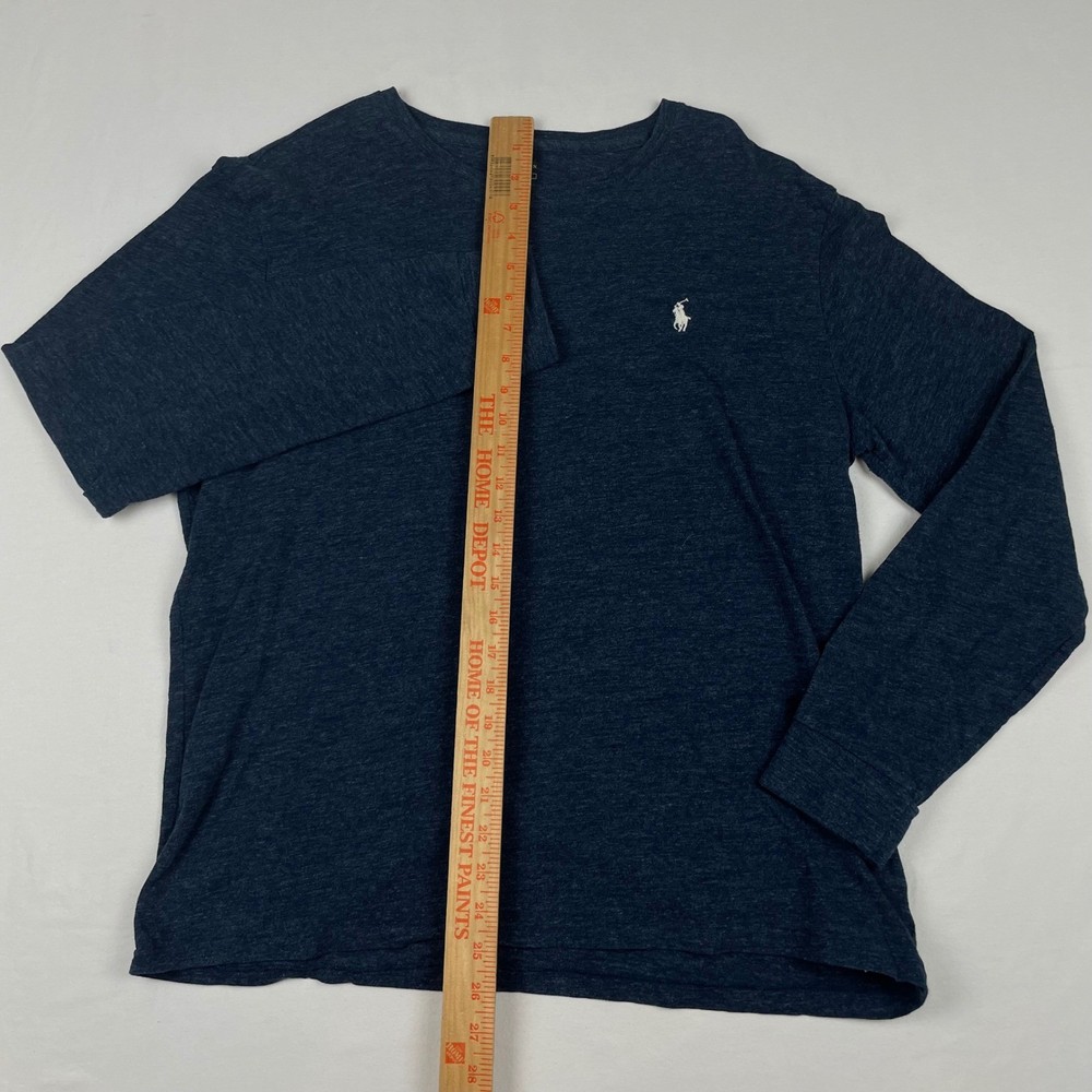 Classic long-sleeve tee from Polo Ralph Lauren crafted in a soft heathered navy knit. This versatile piece features the iconic white pony embroidery on the chest and a comfortable crew neck, making it an essential layer for any casual wardrobe. The lightweight fabric offers a relaxed fit suitable for year-round wear. Measurements: • Pit to Pit: 22" (44" chest) • Length: 26.5"