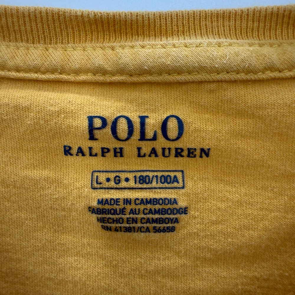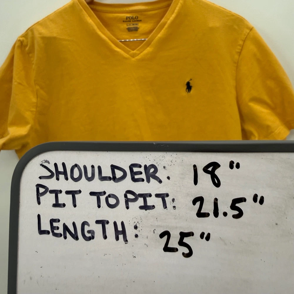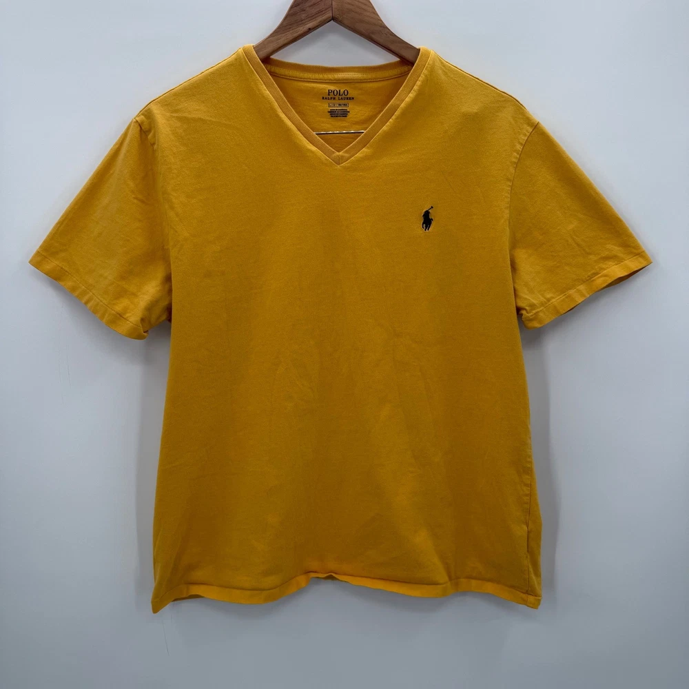 Red and yellow shirt have small tag hole at back of neck as pictured. Three Polo Ralph Lauren men's V-neck short sleeve t-shirts in size Large. This set includes one red shirt with a navy blue embroidered pony logo, one yellow shirt with a navy blue embroidered pony logo, and one navy blue shirt with a red embroidered pony logo. All shirts are made from 100% cotton and feature the iconic Polo Ralph Lauren branding. Department: Men Theme: Preppy Fit: Classic Sleeve Length: Short Sleeve Pattern: Solid Type: T-Shirt Features: Breathable, Easy Care Neckline: V-Neck Fabric Type: Jersey Material: Cotton Accents: Logo Product Line: Polo Ralph Lauren Big Pony Season: Spring, Summer, Fall Model: Ralph Lauren RLX Keywords: Polo, Ralph Lauren, menswear, vneck, basic tee, casual wear, everyday shirt, classic style, wardrobe staple, logo t shirt, cotton tee, multi pack