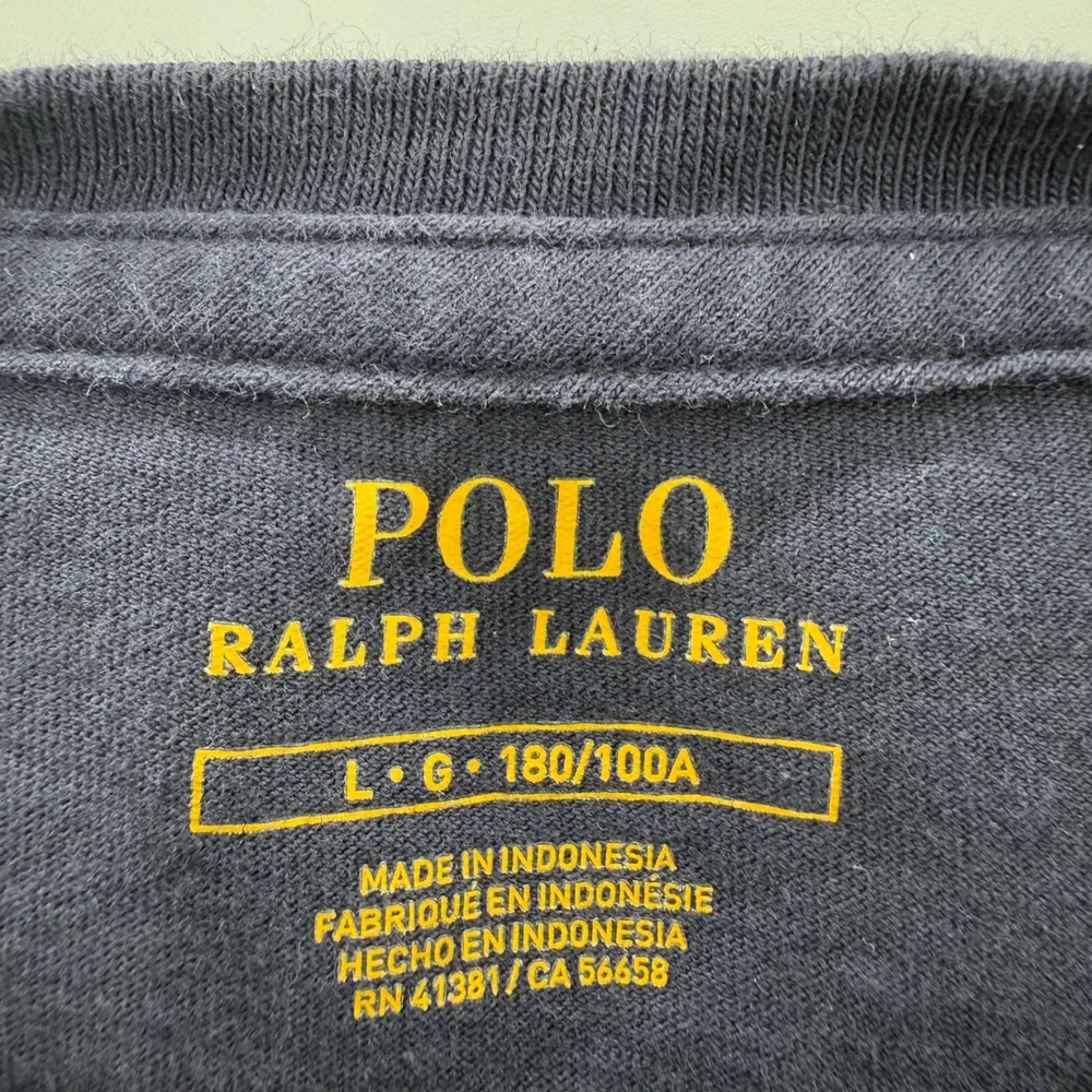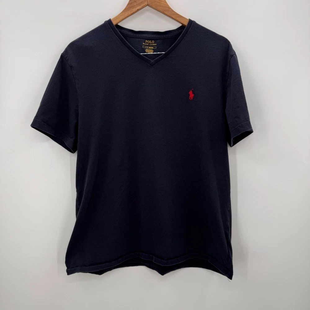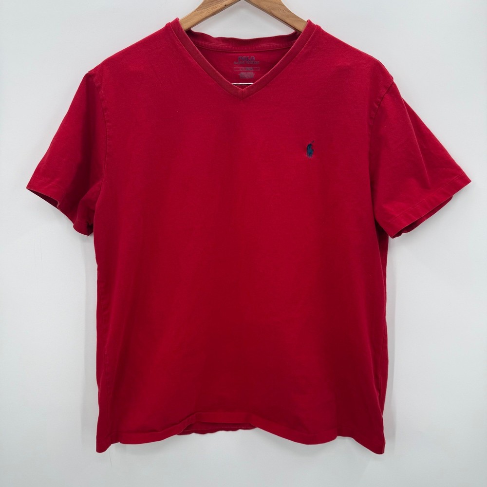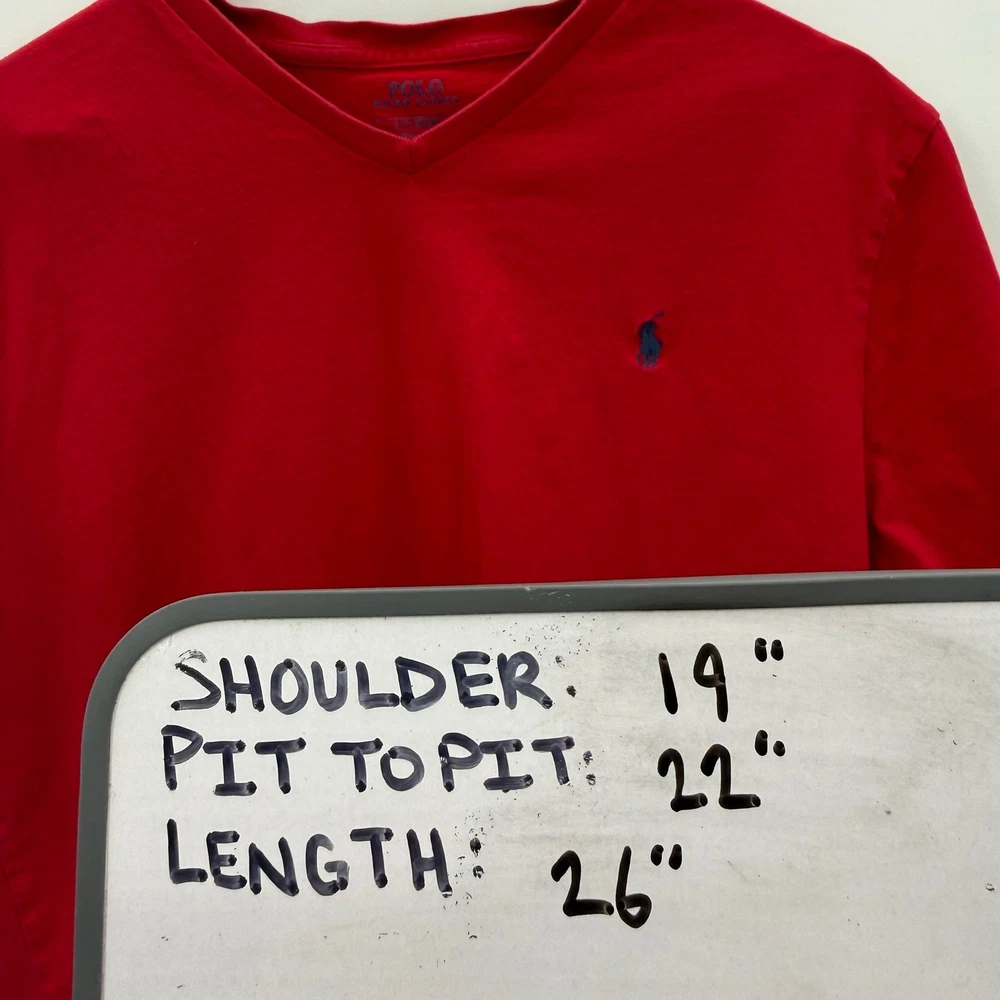 Red and yellow shirt have small tag hole at back of neck as pictured. Three Polo Ralph Lauren men's V-neck short sleeve t-shirts in size Large. This set includes one red shirt with a navy blue embroidered pony logo, one yellow shirt with a navy blue embroidered pony logo, and one navy blue shirt with a red embroidered pony logo. All shirts are made from 100% cotton and feature the iconic Polo Ralph Lauren branding. Department: Men Theme: Preppy Fit: Classic Sleeve Length: Short Sleeve Pattern: Solid Type: T-Shirt Features: Breathable, Easy Care Neckline: V-Neck Fabric Type: Jersey Material: Cotton Accents: Logo Product Line: Polo Ralph Lauren Big Pony Season: Spring, Summer, Fall Model: Ralph Lauren RLX Keywords: Polo, Ralph Lauren, menswear, vneck, basic tee, casual wear, everyday shirt, classic style, wardrobe staple, logo t shirt, cotton tee, multi pack