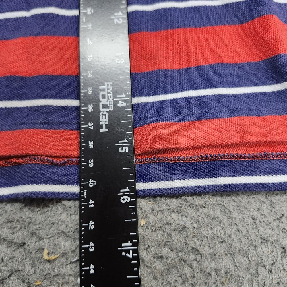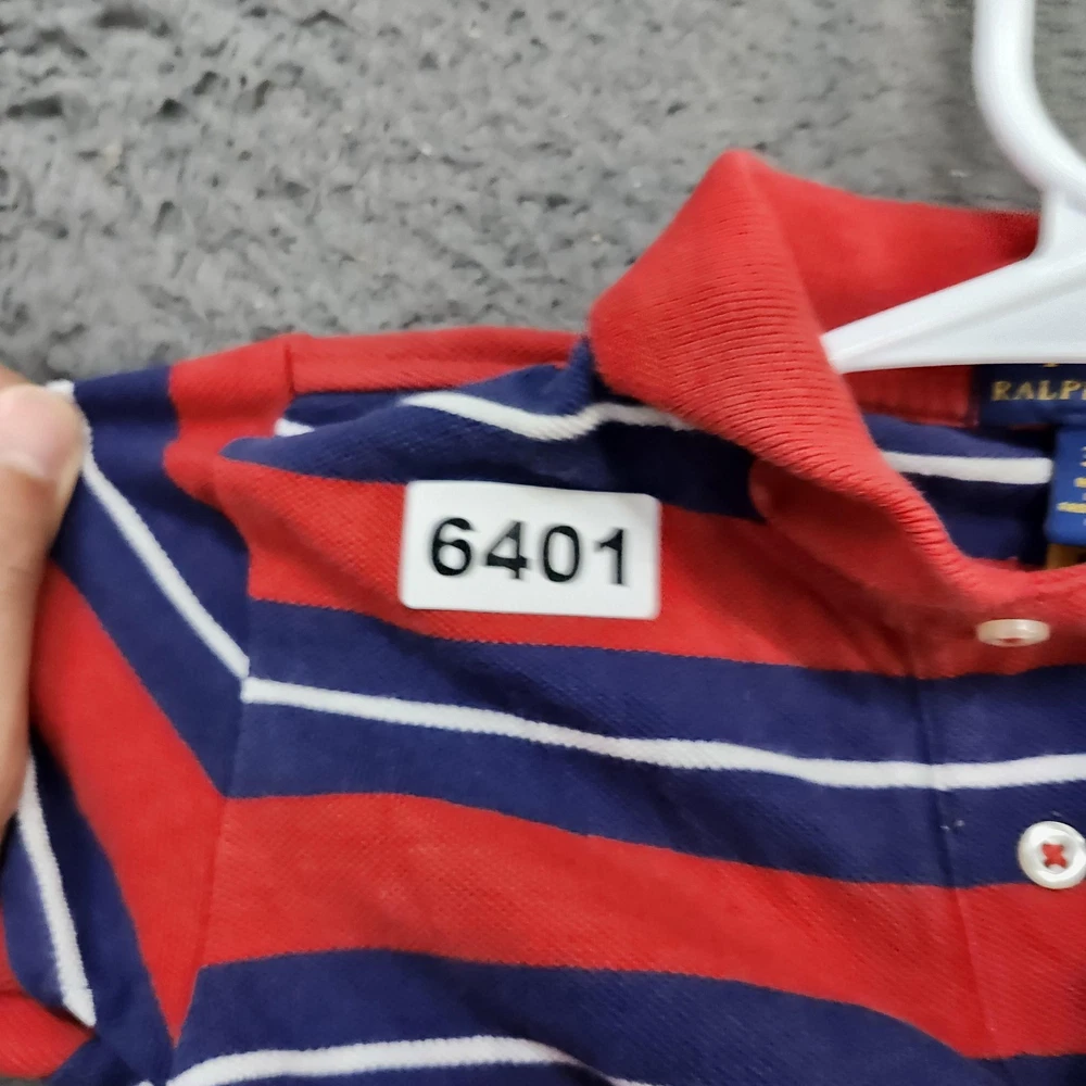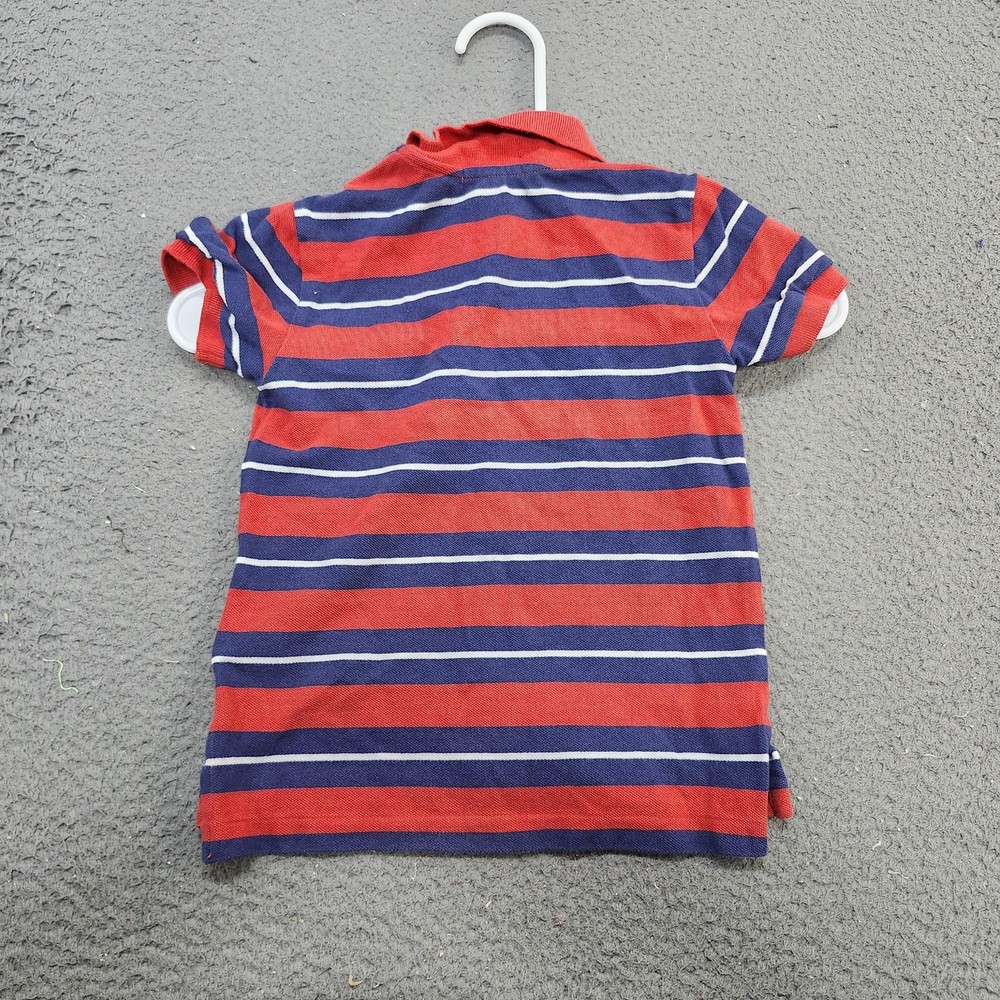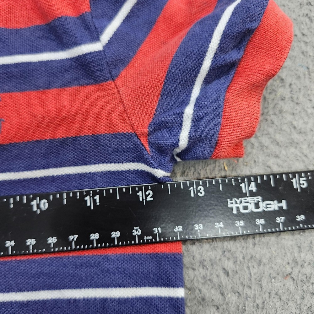 Brand: Polo Ralph Lauren Item: Boys short sleeve polo shirt Tag size: 3T Pattern/Colors: Red and navy blue horizontal stripes with thin white accent stripes Neckline: Polo collar with two-button front placket Details: Embroidered Polo pony logo on left chest, split side vents at hem, knit pique fabric Branding: Polo Ralph Lauren woven label at inner neck Use: Suitable for school, play, or casual everyday wear