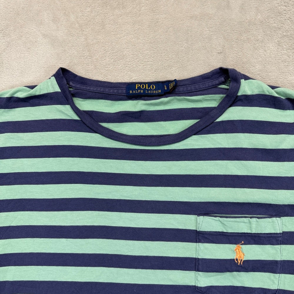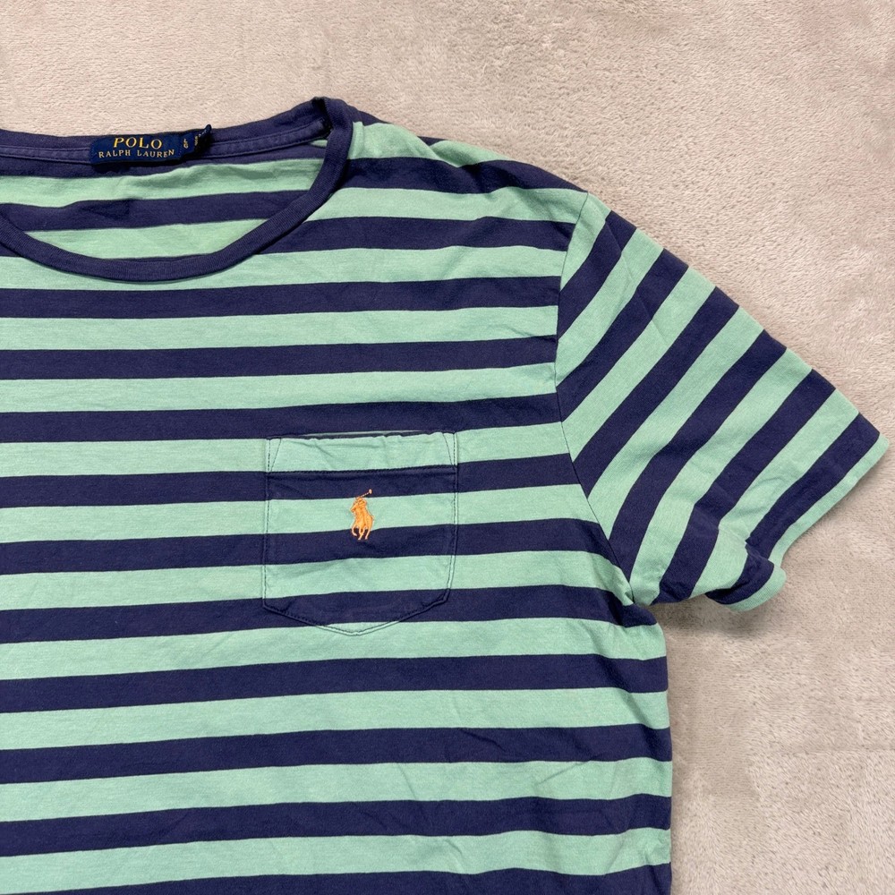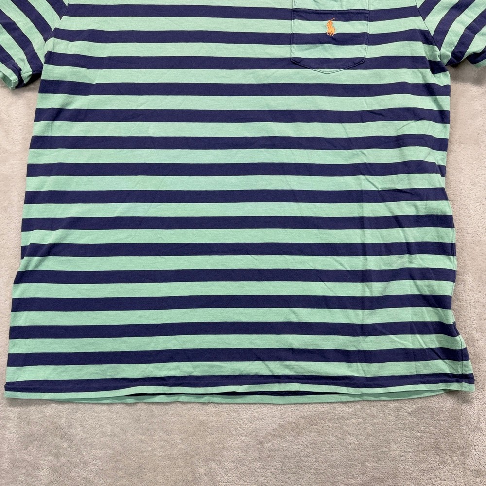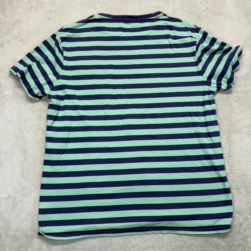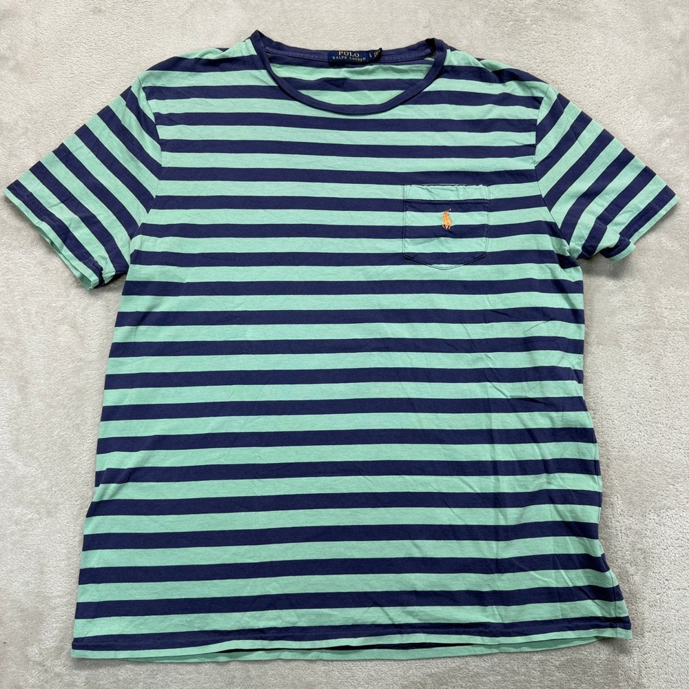 A classic wardrobe staple, this Polo Ralph Lauren t-shirt offers a timeless aesthetic with its bold horizontal stripes. The comfortable crew neck and short sleeves make it perfect for everyday wear, while the iconic embroidered Polo Player logo on the chest pocket adds a touch of signature branding. Good Used Condition - Please see pictures Measurements: • Chest (pit to pit): 23 in • Length (shoulder to hem): 29 in • Shoulder (seam to seam): 19 in • Sleeve Length: 9 in Department: Men Theme: Classic, Retro Fit: Classic Sleeve Length: Short Sleeve Type: T-Shirt Pattern: Striped Features: Pockets Neckline: Crew Neck Fabric Type: Jersey Material: Cotton Keywords: Polo Ralph Lauren t-shirt, Mens t-shirt, Striped t-shirt, Pocket t-shirt, Crew neck shirt, Short sleeve shirt, Navy and green shirt, Cotton t-shirt, Casual shirt, Polo shirt, Designer t-shirt, Mens casual wear, Summer shirt, Everyday shirt