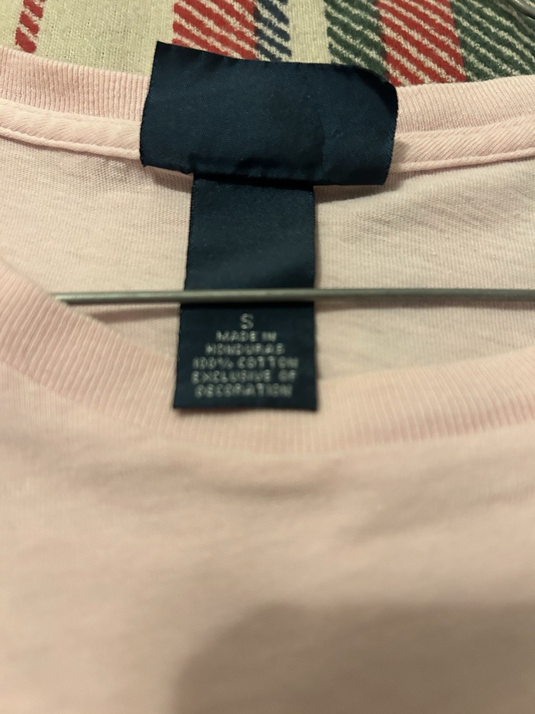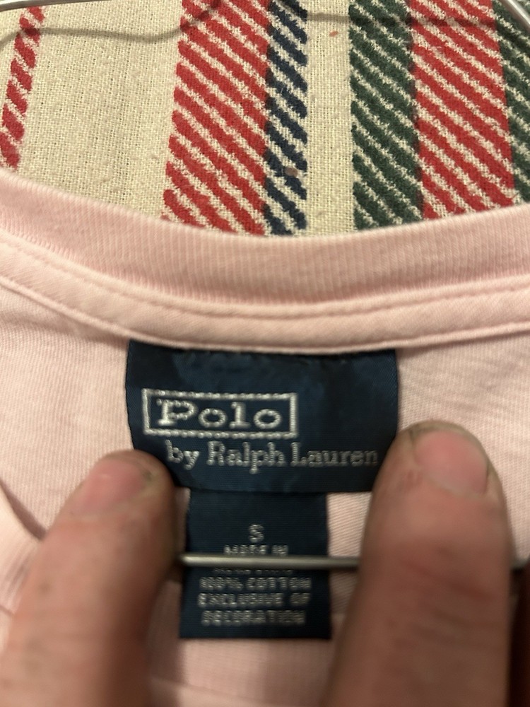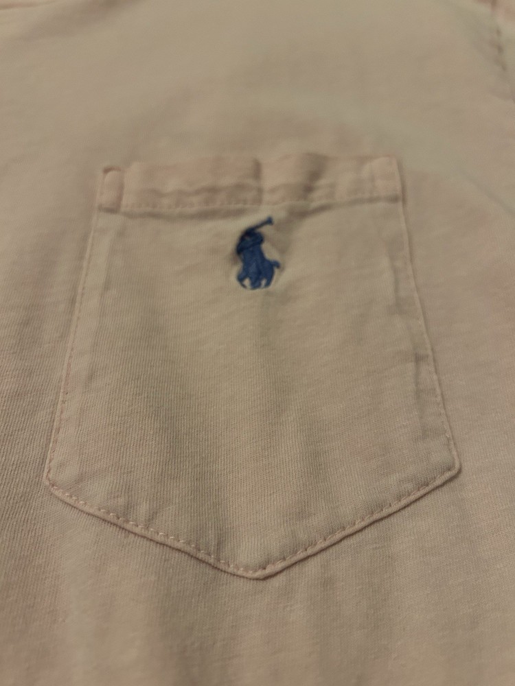 This Polo Ralph Lauren short sleeve crew neck front pocket t-shirt in men's size pink is a classic and versatile addition to any wardrobe. Made from comfortable cotton material, this shirt features an embroidered logo and is machine washable for easy care. The solid pink color and crew neckline give it a timeless look, perfect for wearing in the summer, fall, or spring seasons. With its front pocket detail and regular fit, this t-shirt from the Ralph Lauren Polo product line is a stylish choice for everyday wear. ******** has slight bleach stains on shirt you can bairly notice********