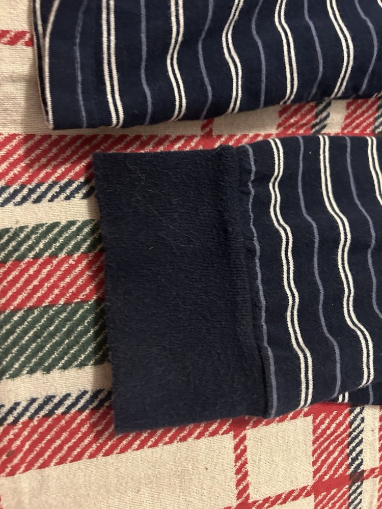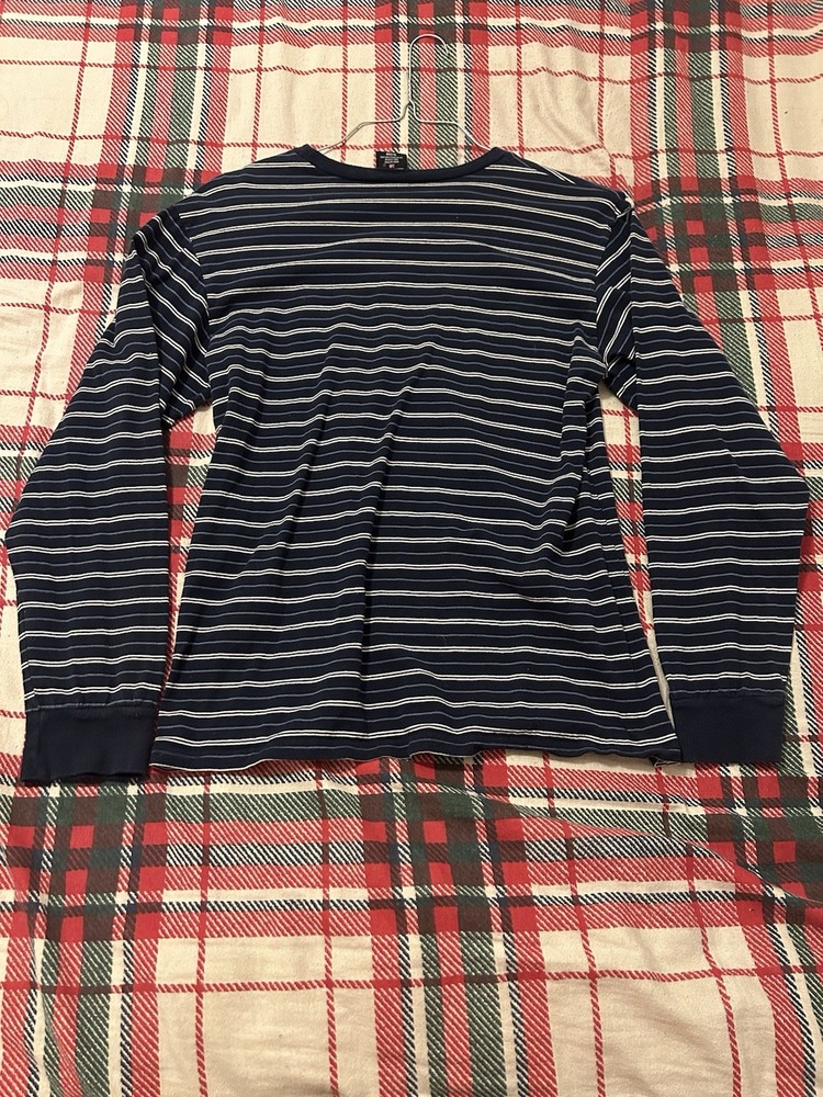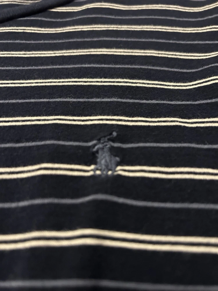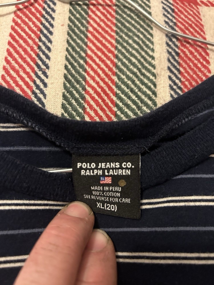 This Polo jeans co. Ralph Lauren Men's XL Shirt in Blue Striped is a classic and stylish addition to any man's wardrobe. Made from comfortable cotton material, this pull-over shirt features a crew neck and long sleeves, making it perfect for the winter, fall, and spring seasons. The shirt also has a logo accent, regular fit, and is machine washable for easy care. Whether you're wearing it casually or dressing it up, this t-shirt is a versatile option for all seasons.