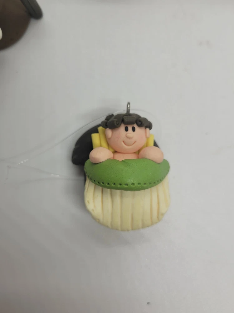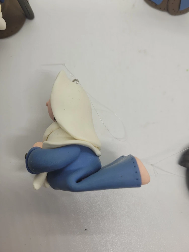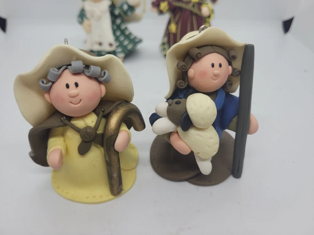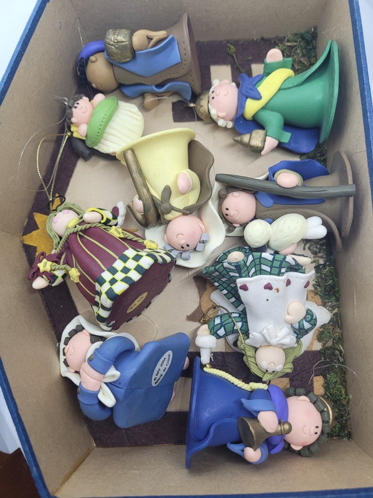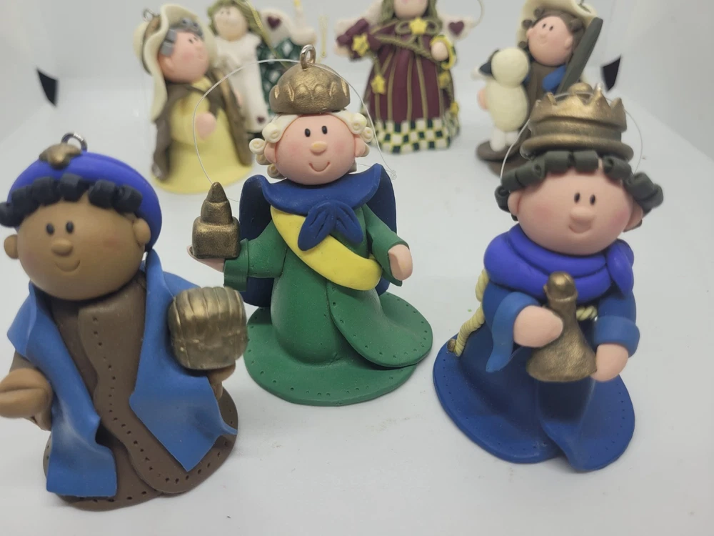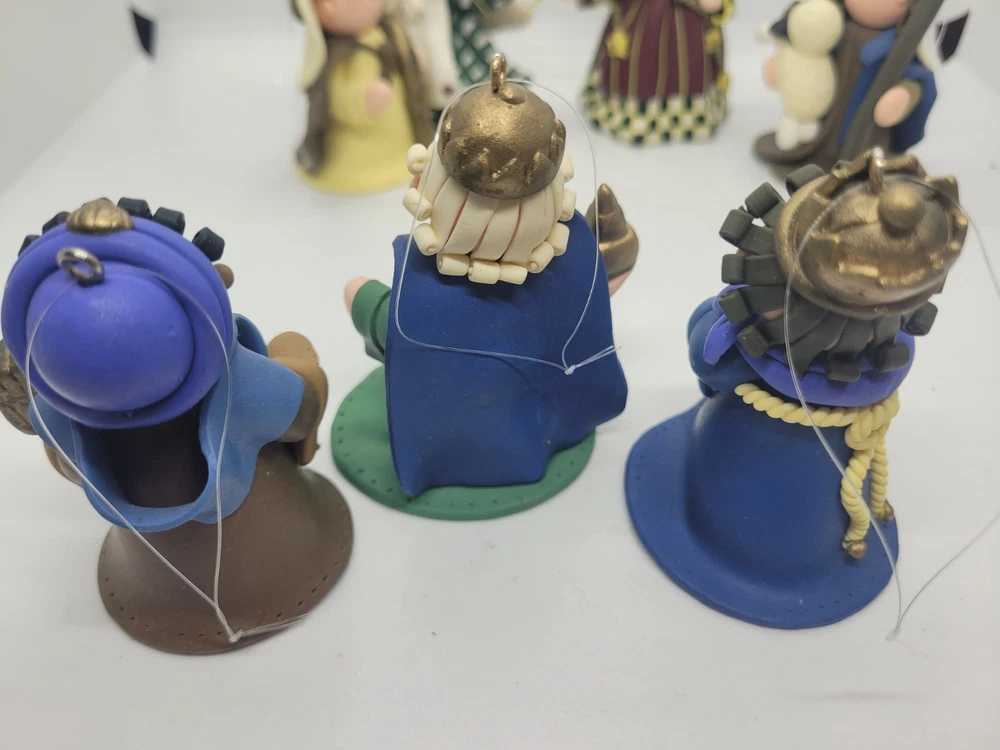 Such a unique nativity set! 9 pieces fit within a storage box that doubles as a Manger Scene. Each figurine can be used for tabletop display or hung as Christmas tree ornaments. This set includes Baby Jesus, Mary, 3 Wisemen, 2 angels, and 2 shepherds. Check out the pictures, there is so much detail! Reminds me of Kneaded Angels. Was possibly produced by BAF Creche. Smoke/pet free home.