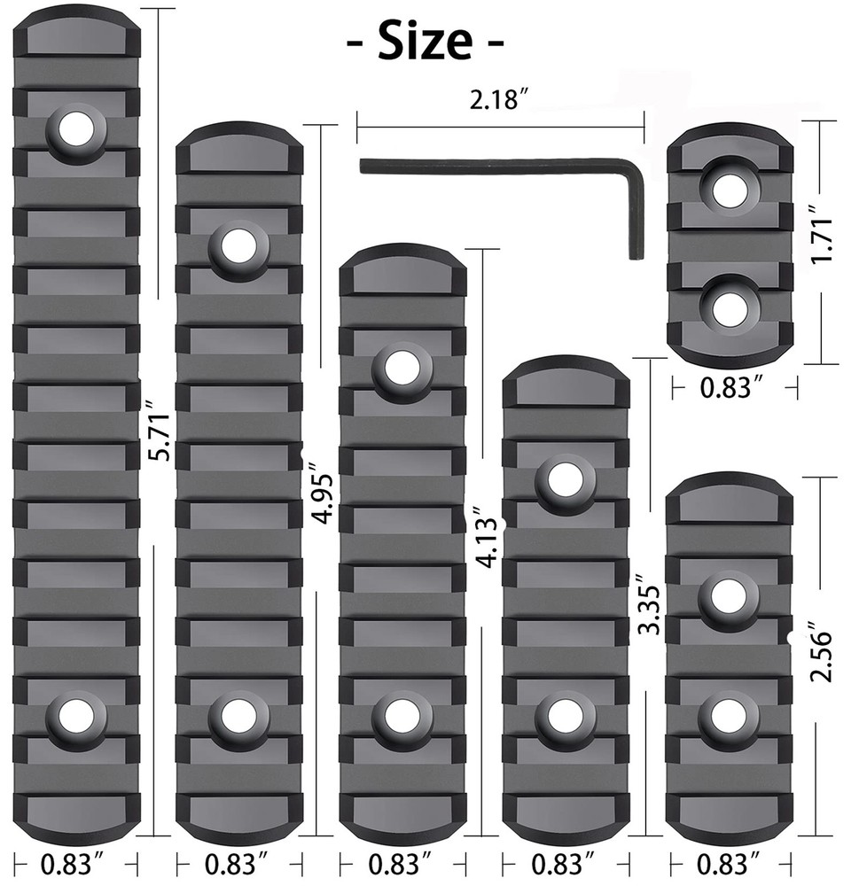 Packing list: nylon Single Picatinny Rails * 1 (6PCS), screws * 13, Product size *4.35cm 1*6.5cm 1 *8.5cm 1*10.5cm 1 *12.5cm 1*14.5cm Width 2.1cm The product is single picatinny rail.Allow the attachment of all standard 21mm picatinny specrail-mounted accessories. Can position just enough rail area exactly where you need it for each accessory, available in six lengths Install these screws by allen wrench tool, simple to install or remove. Pack of 3 5 7 9 11 13 slots, 13 sets matched screws, 13 sets locking T-Nuts and 2 allen wrench . Ultralight rail with solid polymer construction and low profile design reduces bulk. 13 Slots 0.65Oz, 11 Slots 0.56Oz, 9 Slots 0.48Oz, 7 Slots 0.36Oz, 5 Slots 0.28Oz, 3 Slots 0.19Oz, much lighter than aluminum alloy, high strength and good safety Injection molded from a proprietary reinforced composite for enhanced strength and durability while remaining lightweight, Rail Sections also feature beveled ends to reduce snagging and eliminate sharp corners and edges.