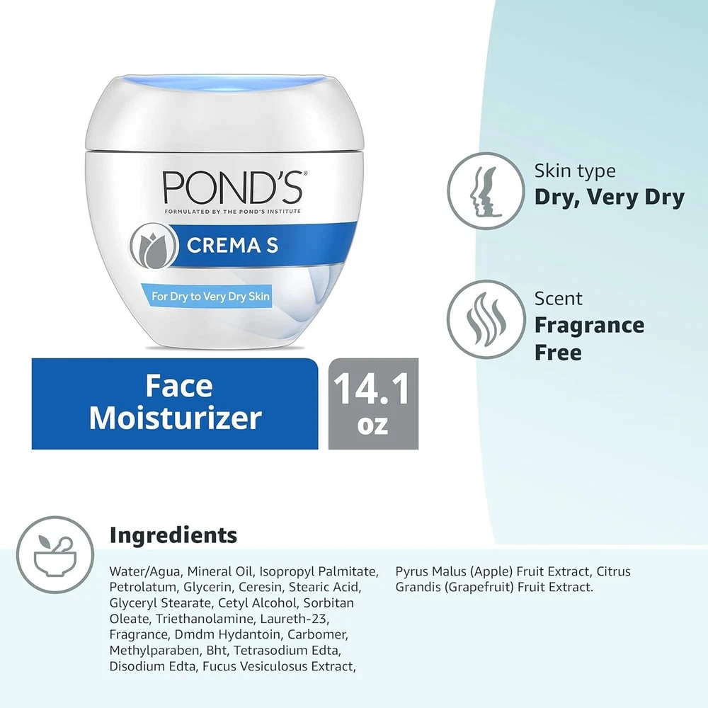 Experience the transformative power of POND'S Crema S Nourishing Moisturizer Face Cream Long-lasting hydration. Specially formulated to hydrate and deeply moisturize dry to very dry skin for up to 24 hours The ultimate pore-friendly formula. Say goodbye to clogged pores; our non-comedogenic facial moisturizer ensures that your skin stays clear and free from congestion A botanical powerhouse. Infused with nutrient-rich apple, grapefruit and seaweed extract to leave skin feeling smooth and instantly fresh Trust in a timeless classic. Experience the magic of a brand that has stood the test of time, delivering soft, smooth, and radiant skin for over 170 years.