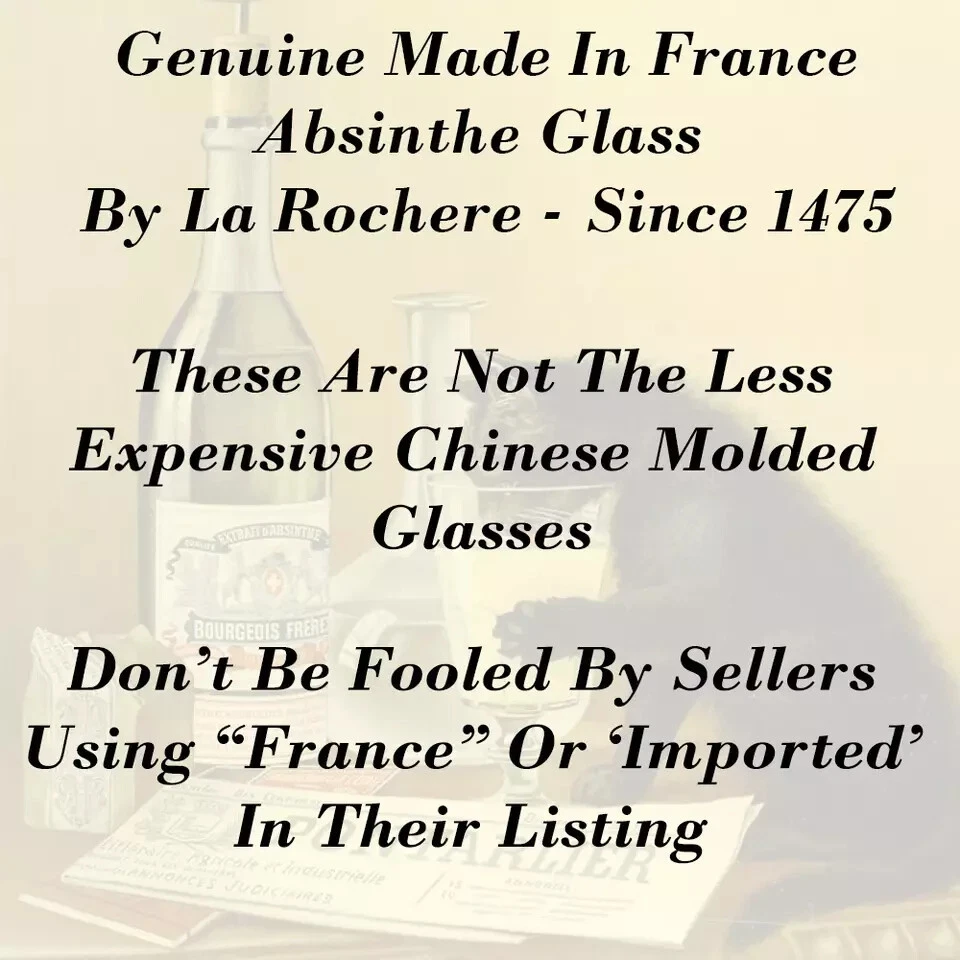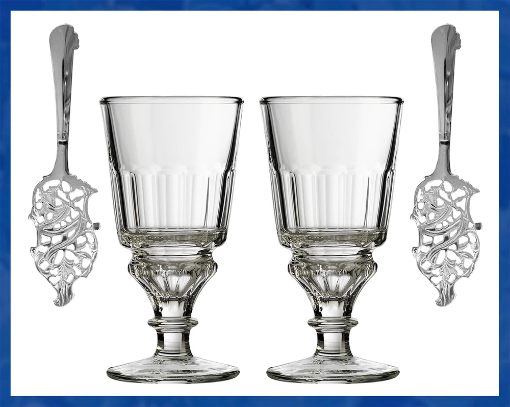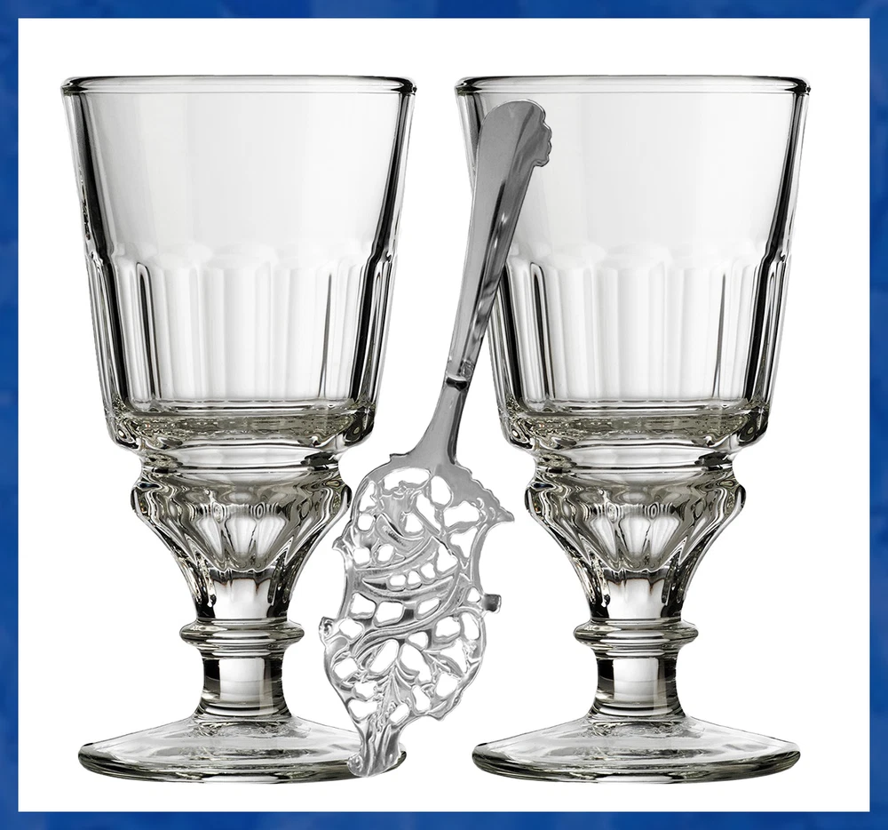 Genuine AbsintheOnTheNet.com Glassware Glass La Rochere French Pontarlier Absinthe Glass. Makes the perfect gift for those who have "everything". The Pontarlier Reservoir glass has a 30ml dosing reservoir to mark the perfect dose of absinthe every time. This style has been featured in numerous painting such as the Pernod Fils advertising print by Charles Maire. It is by far the most popular Pontarlier available. Includes illustrated Instructions For Preparing Your Absinthe. Imported from France 10 oz, 6.5 in. Spoon Our Classic Wormwood Leaf Spoon is by far the style most desired and sought after by collectors. Beautifully made and full of detail, the face of the spoon features the wormwood leaf, Artemisia absinthium the main ingredient in real absinthe. Absinthe can be prepared with any sugar. Includes illustrated instructions for preparing your absinthe. 6in. Purchase Your Preferred Set Using Drop-Down Above. Sets Available Are: -Single Glass Only -Single Glass & 1 Spoon -2 Glasses -2 Glasses & 1 Spoon -2 Glasses & 2 Spoons MORE ABSINTHE SETS AT ABSINTHE ON THE NET *Returns only available for unused items. Correct and sufficient packaging of returned items is the responsibility of the buyer. Items broken during return shipping will receive no credit or refund. *Professional packaging and shipping insurance recommended.
