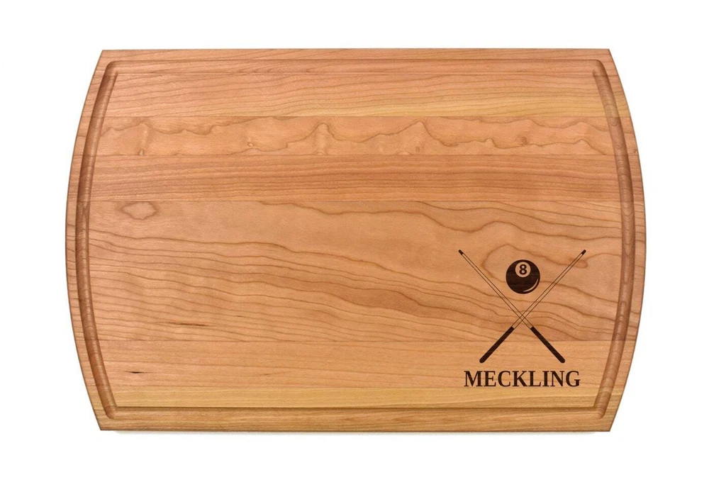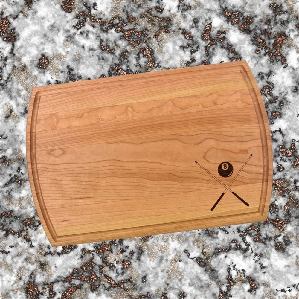 Design: Personalized Pool Billiards Cutting Board or Charcuterie Serving Tray All items ship via USPS - please make sure your address is correct :-) Whether used as a charcuterie serving tray for snacks or cutting board, our bamboo, walnut and cherry custom boards are the perfect addition for the home and make the perfect gift for your loved one celebrating a birthday, anniversary, new home, wedding, etc! *** FEATURES *** • SIZES: We have multiple styles and sizes available. To see our current sizes available, click the drop-down menu. The photo slide contains a photo showing each side by side. Please note, the board with the juice groove only has the groove on the front side of the board. • THICKNESS: Bamboo Boards - Approximately 1/2" Thick; Walnut & Cherry Boards - Approximately 3/4” Thick • UNIQUE: Every board is unique with the grain and coloring varying throughout - no board is the same! • CARE INSTRUCTIONS: Hand wash only with warm water. Do not soak. Please apply mineral oil throughout the board’s life. • PERSONALIZATION/CUSTIMIZATION: Do you want the text placed differently on the board? Please don’t hesitate to contact us. All personalization notes can be entered in the personalization box when checking out. • SHIPPING: All cutting boards ship within 2 to 5 business days. • WHOLESALE ORDERS: Please don’t hesitate to contact us for information about wholesale orders. Processing times for larger orders may change. • NOTE: Colors can vary a bit on different monitors and screens. Any props included in photos are not included. Please be sure to double-check your address to make sure it is accurate for USPS delivery. If a package is returned to us due to an invalid address, the buyer is responsible for all additional shipping charges. We appreciate you supporting small business – best wishes! For items ordered with simple edits, we do not send proofs since the layout doesn't change from the example(s). However, in the event there are requests that change the layout from the example(s), we do send proofs for approval before making the product. If you'd like a proof before we make the product, please note so in the personalization box.