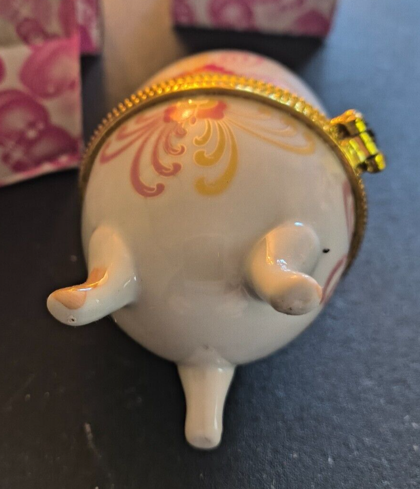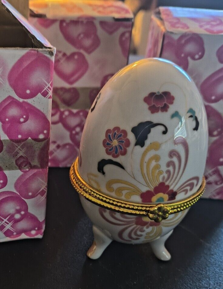 Porcelain Floral 3-Foot Hinged Egg Trinket Box 4" Tall NIB