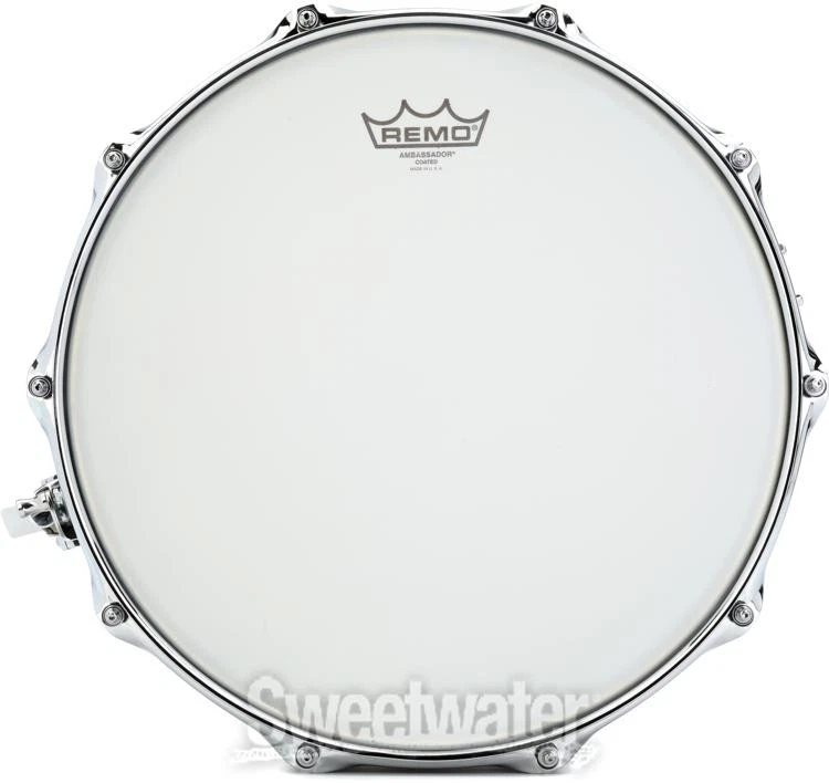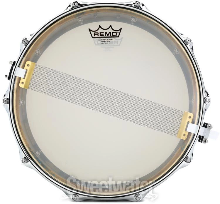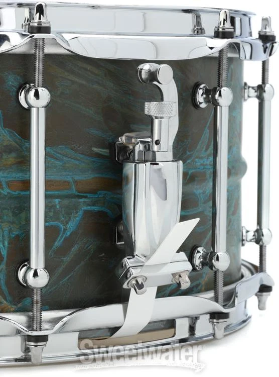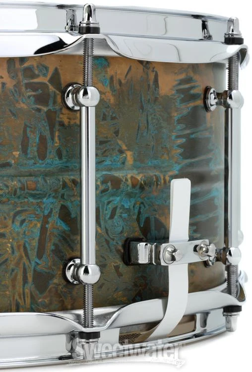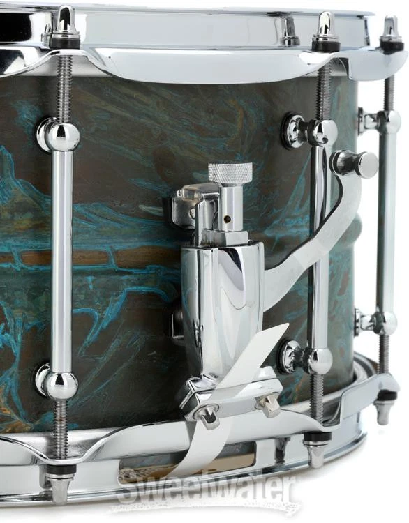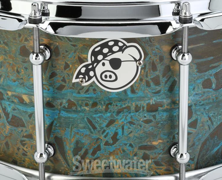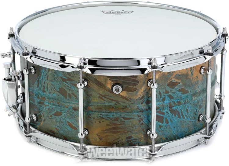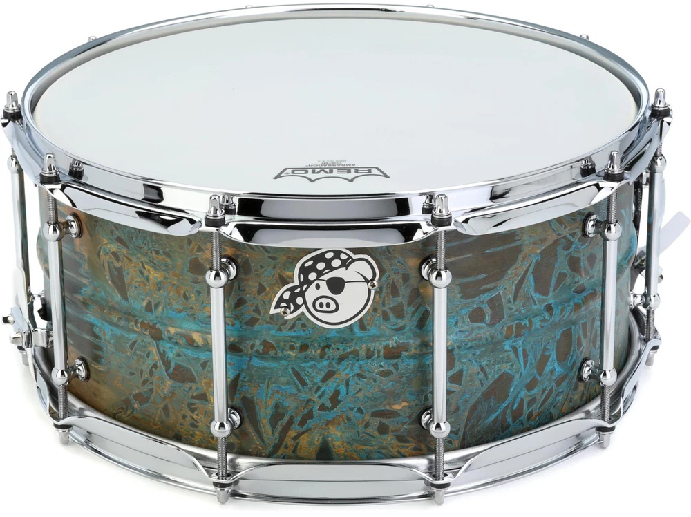 Beautiful All-brass Snare Delivers Amazing Tone When Pork Pie says their snare drum is made of brass, they aren't kidding! This USA Custom Patina Brass Snare Drum takes the concept of a brass snare to a higher level. The shell is 1mm thick with a stunning oxidized patina that makes each one that arrives at Sweetwater unique. It's complemented with a set of chrome-plated brass tube lugs. Triple-flanged 2.3mm hoops provide stable tuning and give the Custom Patina Brass Snare an expressive range of rim accents. The sound of the drum itself is stunning, with a warmth that comes out boldly when you tune down. Tune it up, and you get a chiming crack, courtesy of a set of brass snares. All told, the Pork Pie 6.5" x 14" Patina Brass USA Custom Snare is a perfect way to add a ton of character to your drum set.Pork Pie USA Sweetwater is an Authorized Pork Pie Percussion Dealer Genuine New Item Sweetwater's 2-year warranty Pork Pie Percussion USA Custom Patina Brass Snare Drum - 6.5 x 14-inch - Custom 6.5" x 14" Brass Snare Drum with 1.0mm Beaded Shell and 2.3mm Triple-flanged Hoops Beautiful All-brass Snare Delivers Amazing Tone When Pork Pie says their snare drum is made of brass, they aren't kidding! This USA Custom Patina Brass Snare Drum takes the concept of a brass snare to a higher level. The shell is 1mm thick with a stunning oxidized patina that makes each one that arrives at Sweetwater unique. It's complemented with a set of chrome-plated brass tube lugs. Triple-flanged 2.3mm hoops provide stable tuning and give the Custom Patina Brass Snare an expressive range of rim accents. The sound of the drum itself is stunning, with a warmth that comes out boldly when you tune down. Tune it up, and you get a chiming crack, courtesy of a set of brass snares. All told, the Pork Pie 6.5" x 14" Patina Brass USA Custom Snare is a perfect way to add a ton of character to your drum set. Pork Pie USA Custom 6.5" x 14" Patina Brass Snare Drum Features: All-brass snare drum with seamed 1mm shell; chrome-plated brass tube lugs deliver a massive range of tone Breathtaking oxidized patina gives each drum a unique swirling blue, green, and brown finish 2.3mm triple-flanged hoops provide steady tuning and expressive accents Chrome hardware includes Pork Pie standard brass shell throw off and butt plate for smooth transitions Brass snare wires deliver a sharp crack and expressive range of tone Comes equipped with Remo USA drumheads Specification Detail Type Custom Brass Snare Drum Depth 6.5" Drum Diameter 14" Shell Material Brass Shell Construction 1mm, Beaded Hoops 2.3mm Triple-flanged Lugs 10 x Tube Lugs Color Custom Oxidized Patina Finish Chrome-plated Hardware Heads Pork Pie by Remo RETURN INFORMATION We want you to be completely happy with your purchase from Sweetwater. If you are not satisfied with your product, you may return it for a refund of the purchase price within 30 days. If your purchase was eligible for Free Shipping, the shipping cost will be deducted from your credit or refund. Returns must be in the complete and original packaging with all accessories and complete documentation (Owner's Manual, warranty card, quick start guides, etc.), show no signs of wear or use, and include a Return Authorization number or be subject to a restocking fee.