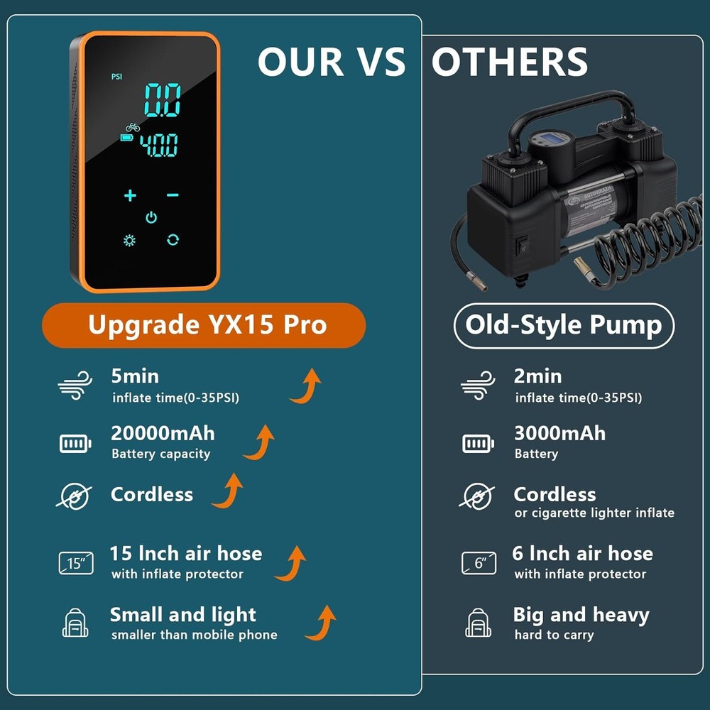 Product Description Tire Inflator Portable Air Compressor, Portable Air Pump For Car Tires Tire Inflator 150 Psi150psi & 20000mah Fast Inflation For Cars, Bikes & Motorcycle Tires, Balls 🚴🍀Portable Air Compressor: The upgraded touch screen air pump features a powerful 20000mAh battery. It can run continuously for up to 1-2 hours and takes about 3-5 hours to fully charge. Cordless and convenient, no need for a charging cable or cigarette lighter connection. 🚴🍀Air Compressor for Tires: Equipped with 4 preset modes for bicycles, motorcycles, cars, and balls. It automatically shuts off when the preset pressure is reached, making it easy to use. You can also set your own pressure up to 150PSI. One button operation to switch between pressure units. 🚴🍀Air Compressor: Features a high-efficiency motor with over 25000 RPM, providing airflow of 36L/Min. It can inflate a small tire (25-36PSI) in just 1-2 minute. 🚴🍀Tire Inflator: The large LCD touch screen includes a pressure gauge function, displaying both preset and real-time pressure values with ±1.5PSI accuracy. Features LED, SOS, and flashing lights for visibility during nighttime inflation. 🚴🍀Tire Inflator Portable Air Compressor: This mini air pump is conveniently packed with a storage bag in a compact box. It features a USB-C input and USB-A output port, serving as a portable power bank for electronic devices. About Us We are a reputable seller with many years of experience selling on eBay. Our goal is to provide high-quality products and excellent customer service. Shipping Items will be shipped within 1-3 business days when we received payment. (Orders are not processed on weekends & holidays) Tracking information will be sent once item is shipped. Delivery time depends on destination and other factors Item is shipped to ebay address. Leaving correct address can minimize delay. For international shipping and shipping to Guam, Hawaii and Alaska, Please contact us before placing the order. International buyers please note: Import duties, taxes and charges are not included in the item price or shipping charges. These charges are buyer’s responsibility. We will try our best to reduce the risk of the custom duties. Local pick-up is unavailable at the moment. Contact Us We reply any email messages within 1 business / working days(off-duty at weekend). If you do not get a response from us, then please check your junk or spam mailbox. Our Business hours: Mon-Fri 9:00-18:00, UTC/GMT +8 hours. Please contact us either by clicking "contact seller" in the "purchase history" section or simply click "ask a question" at the bottom of this page. If you are unsatisfied with our item or service, please contact us before leaving any feedback. We are committed to resolve all issues in a friendly and satisfactory manner.