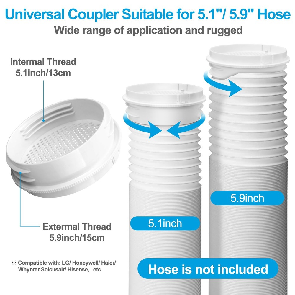 Upgraded Universal Portable AC Window Vent Kit for Sliding Window Color: White Material: PVC/ABS/PP, Stainless steel bolt Adjustable Length: 43cm/16.93inch-155cm/61inch Applicable Windows: Vertical and Horizontal Sliding windows, sliding door Applicable Device: All conditioners with an outlet diameter of 5.1 inches or 5.9 inches Package : 4 x Upgraded Sealing Plates 1 x Universal Hose Coupler/Adaptor 1 x Rain Cover with Grid 4 x Screws 1 x Sealing Tape 10ft 1 x User Manual Installation Steps: Instruction is in the package. Assemble Plates: Install the screw and nut fittings on the outer plate, insert the oval metal piece into the track of inner plate. Placed the assembled plate on the window, adjust it to an appropriate length and tighten the screws. Screw the coupler into the exhaust hose of the conditioner. Insert the coupler into the hole of the board. Post the sealing tape to the gap between the edge of the window and sealing plates to achieve a good sealing effect 【Universal Coupler for 5.1 inch & 5.9 inch Exhaust Hose】: This 2-in-1 patented coupler has an Internal thread suitable for exhaust hoses with a diameter of 5.1 inches (clockwise and counterclockwise), and an External thread suitable for exhaust hoses with a diameter of 5.9 inches (counterclockwise only). You can easily connect all your conditioning hoses without hassle. (Hose not ) 【Upgraded Seamless, Better Sealing Effect】: The portable conditioner window vent kit can be perfectly embedded in windows rail to achieve a tight sealing effect. There is no gaps between the plate and the edge of the window, effectively blocking the leakage of cold and the entry of hot into the room, keeping the room cool and more energy-efficient. 【Grid Filter & Rain Cover】: The universal coupling has a built-in grid to prevent birds, mice, snakes and garbage from entering the AC vent hose and damaging your conditioner components. The rain cover can effectively prevent rain and wind from entering, and let the hot escape downward, allowing you to better enjoy the convenience of our conditioner window vent kit. 【Thickened and Durable Adjustable Panels】: The maximum adjustable length of the 4 window panels is 155cm/61 inches, meeting the needs of different window heights and suitable for most horizontal and vertical sliding Windows. Our AC unit window kit is made of a new reinforced PVC material, featuring superior heat resistance, wear resistance, aging resistance and durability. It has a longer life and can be reused repeatedly. 【What You 】: The portable AC duct kit includes 4 x Window Seal Plates, 4 x Screws, 1 x Universal Hose Adapter with Grid, 1 x Rain Cover, 1 x Sealing Tape, 1 x User Manual. All are easy to install or disassemble, no tool needed, convenient to when not in use, and save space.