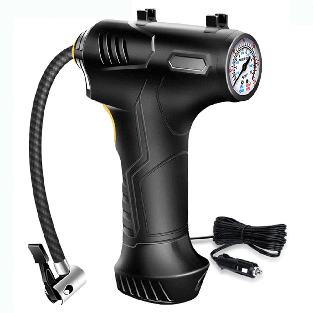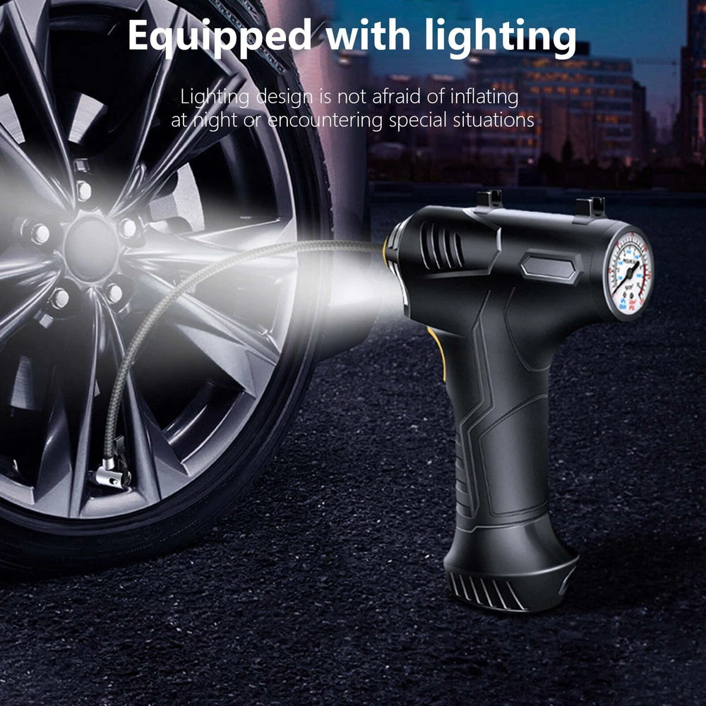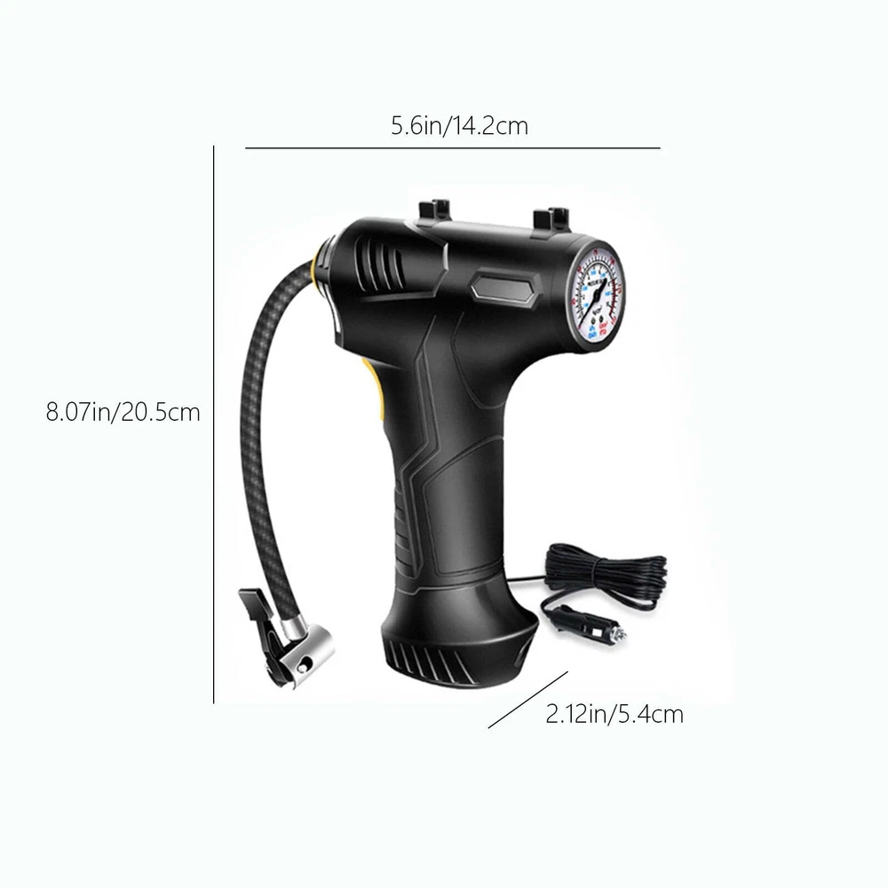 Portable Air Compressor Quick Rechargeable Battery 3 Nozzles Cars Motorcycles Features: ADVANCED ACCURACY: This tire inflator is made of good material, it can inflate car tires up to 25 liters per minute, and it can inflate 195/55/R15 car tires from 0psi to 35psi in 10 minutes.Please note that after 10~15 minutes of continuous use, please allow the tire inflator to cool down before continuing to use it. METAL CYLINDER: The inflator pump is designed with metal cylinder and equipped with permanent magnet motor, which can fully guarantee the quality and performance during use. EXTRA LONG POWER CORD: Powered by car lighter, equipped with 9.8 feet long power cord, it can inflate any tires in your car.1.64 feet inflatable hose is enough for daily use. PRODUCT HIGHLIGHTS: Handle style design, easy to grip. Compact size makes it easy to carry. Features an integrated LED flashlight for emergency use. Wide range of applications: Includes 3 nozzles . Inflates any tire on cars, SUVs, motorcycles and bicycles; included accessories allow for quick balls, cushions, balloons and mattresses. Note: This pump is not suitable for high pressure or high volume applications such as swimming pools and inflatable canoes. Product Description: Color: Black Gross Weight: 498g/1.10lb Product Size: 20.5*14.2*5.4cm/8.07*5.59*2.13in Package size: 21.8*17.2*6.2cm/8.58*6.77*2.44in Product Contains: 1x Tire Inflator 3x inflator nozzle LCD screen: There is a power display, preset the value you want, and the air compressor will automatically shut down when the value is reached. The backlit LCD display will show the desired tire pressure value and the current tire pressure. Portable Design: This portable tire compressor takes up very little space. Even small vehicles do not take up space in the car. Design of Led Lights: Bright LEDs allow you to get work done even in the dark, allowing you to easily deal with various emergencies. Scope of Application: The maximum inflation pressure is 150Psi, it is suitable for all kinds of inflatable toys, balls, and also suitable for bicycles, motorcycles and small and medium-sized cars (including SUVs). Package Contents: 1*12V Air Inflator; 3 * Different Nozzles.